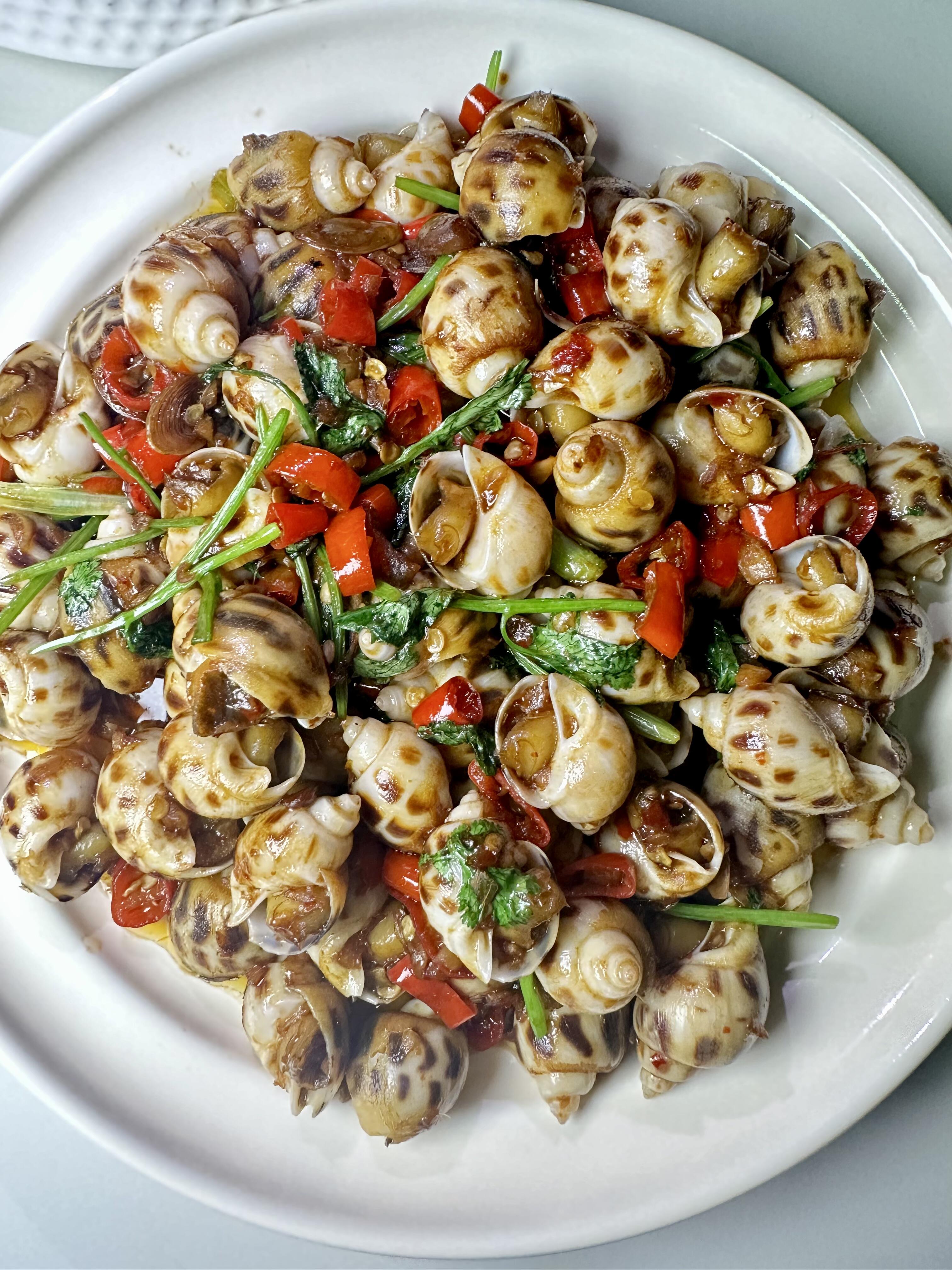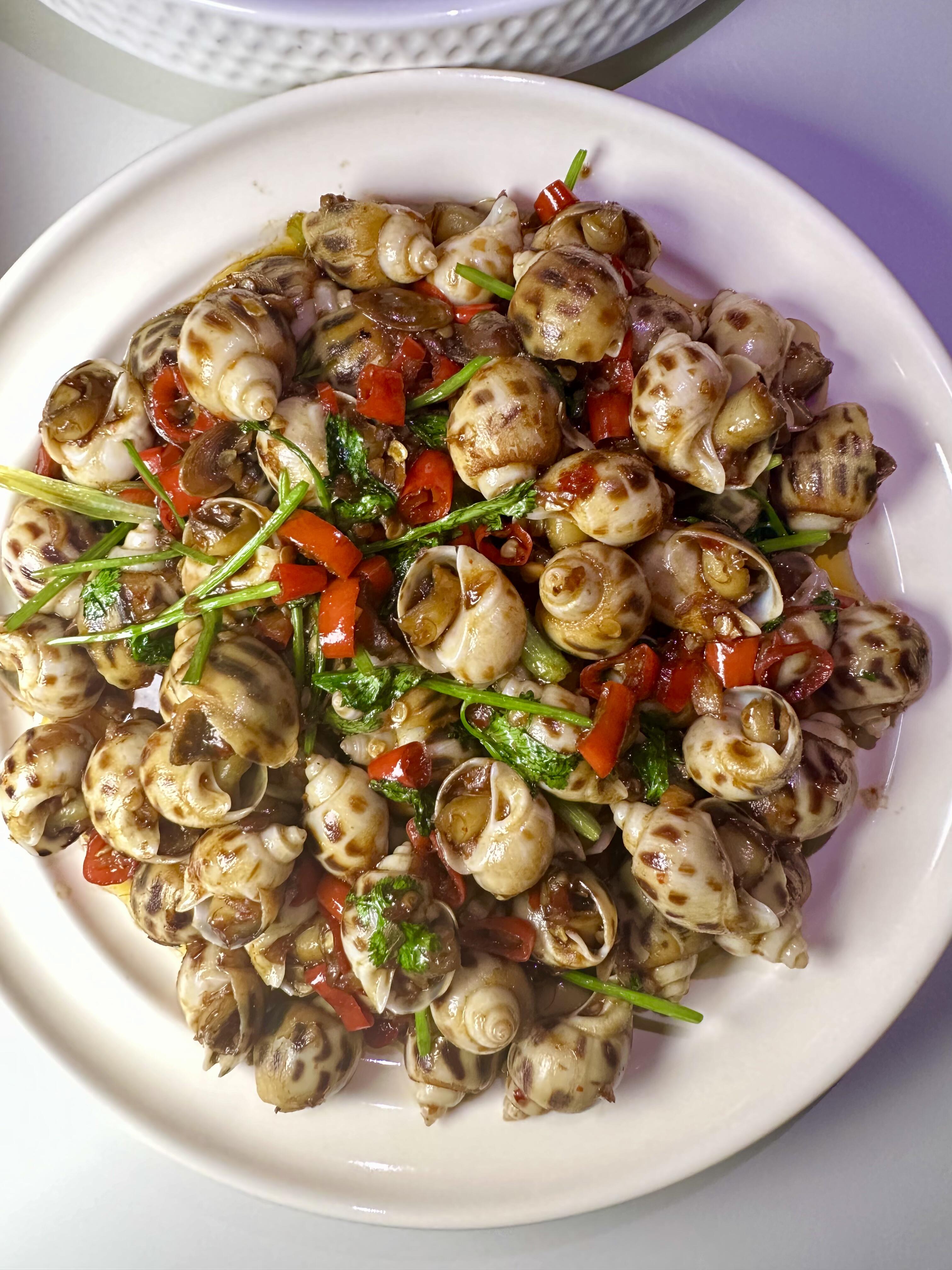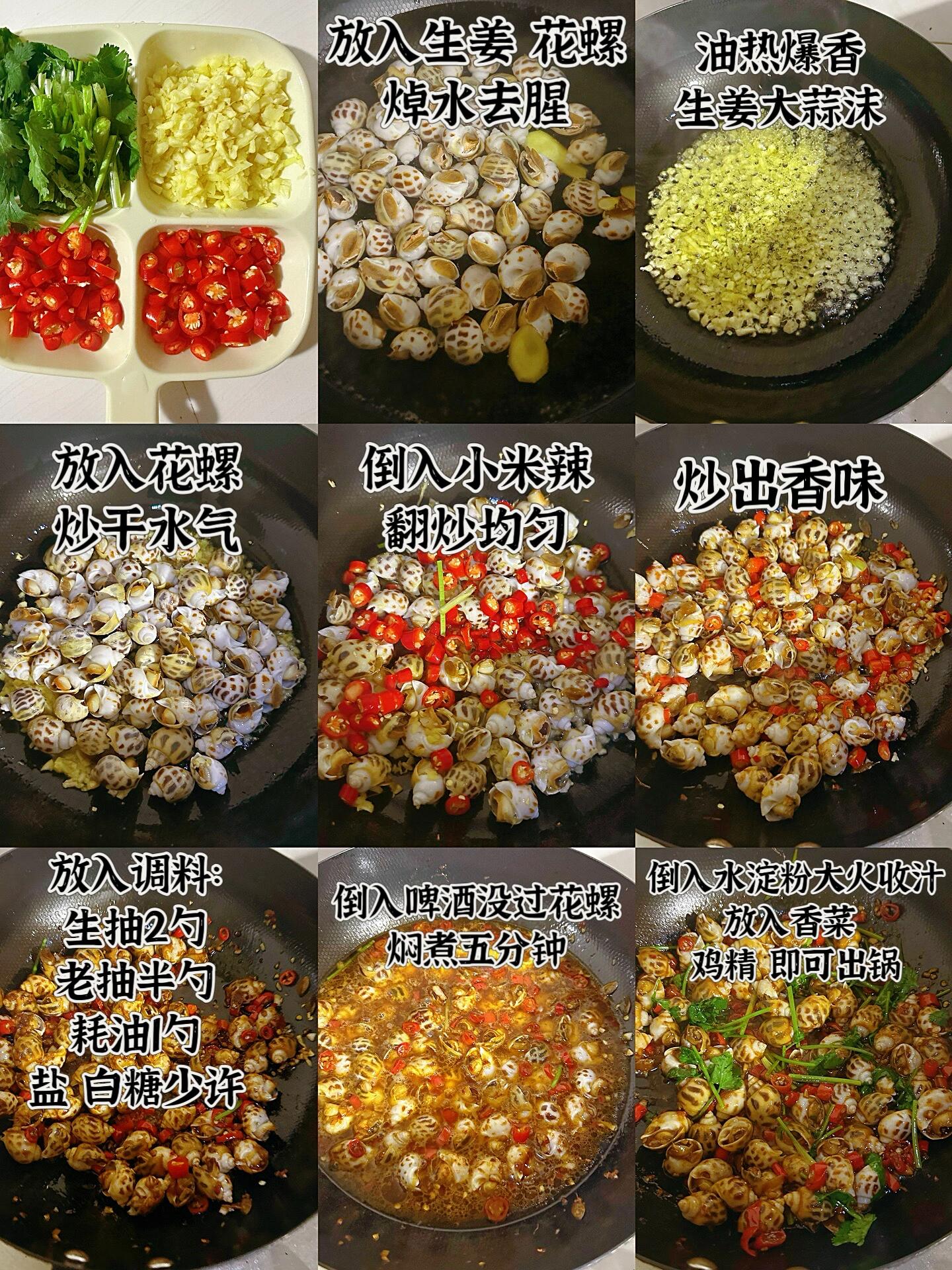 香辣花螺家常做法 今天做的香辣花螺好好吃啊~而且很简单,新手小白操作也不会翻车。 很喜欢花螺肉质爽脆的口感,加上辣辣的调料,一口一个,根本停不下来!快去试试! 香辣花螺 做法: 1:买回的花螺洗干净,冷水下锅,放入姜片,料酒去腥,焯水三分钟捞出。 2:起锅烧油,油热倒入生姜大蒜沫爆香,放入花螺炒干水汽。在放入小米辣炒出香味,放入调料:生抽2勺,老抽1勺,耗油1勺,盐,白糖少许翻炒均匀。倒入啤酒没过花螺,盖盖焖煮五分钟。然后倒入水淀粉,鸡精,葱段即可出锅。