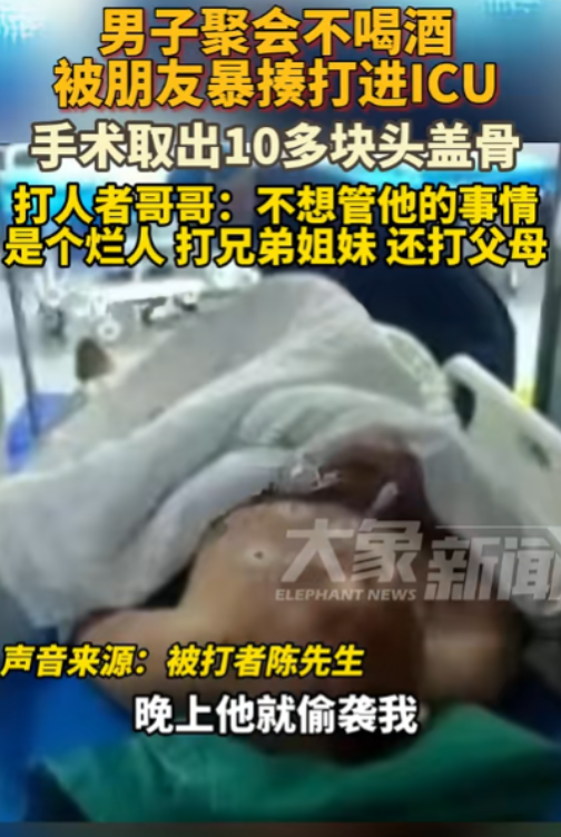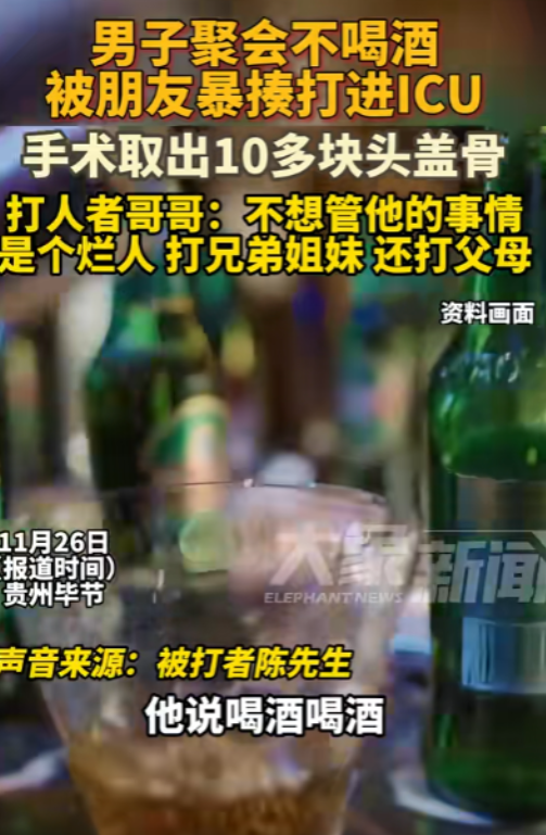 离谱!11月26日报道,贵州,一男子和朋友聚会拒绝喝酒,结果晚上被朋友偷袭揍进了icu,经过手术取出10多块头盖骨,打人者哥哥:他就是个烂人,打兄弟姐妹,还打父母,不想管他的事。 黄军(化名)平时温和谦逊有礼却在一次聚会中突然对陈刚(化名)发起了致命的攻击。陈刚的头部被黄军用酒瓶击中,鲜血四溅,而黄军则冷漠地站在一旁。 这一幕,让在场的每一个人都感到不寒而栗。陈刚的家人和朋友急忙将他送往医院,而黄军则被警方带走。 近年来,因饮酒引发的暴力事件屡见不鲜,每一次都会引起社会的广泛讨论。人们开始反思,为何在轻松的聚会中,一杯酒会成为引发冲突的导火索。聚会上,黄军坚持要给陈刚倒酒,而陈刚因为身体原因,坚决拒绝。 黄军的脸色开始变得难看,他追问陈刚为何不喝,陈刚只能无奈地解释自己的身体状况。黄军觉得陈刚不喝就是不给他面子,黄军突然拿起酒瓶,狠狠地砸向陈刚的头部。 陈刚应声倒地,血从他的头上涌出,场的人试图阻止黄军,但已经太迟了。紧急救治与手术成为了陈刚生存的唯一希望。 在医院,医生们迅速展开了手术,从陈刚的头部取出了多块头盖骨碎片。手术室外,陈刚的家人焦急地等待着。幸运的是,手术最终成功,陈刚的生命得以保住,但他的恢复过程将是漫长而艰难的。 社会舆论与公众态度在这一事件中扮演了重要的角色。 陈刚一家与黄军的哥哥进行了协商,希望能够得到一些赔偿和道歉。社会舆论对此反应强烈,许多人对黄军的行为表示谴责,同时也对陈刚的遭遇表示同情。 经济困境与社会援助成为了陈刚家庭不得不面对的现实。由于医疗费用高昂,陈刚一家陷入了经济困境。通过募捐,许多人伸出了援手,这才缓和了他们的经济压力。 网友评论与社会观点在这一事件中也显得尤为重要。 一些网友评论道:“酒精不是借口,暴力行为必须受到法律的严惩。”也有网友表示:“这不仅是个人的问题,更是社会的问题,我们需要更多的教育和预防措施。”这些评论不仅展现了不同的观点和态度,也引发了读者对于事件的深入思考和讨论。 法律与道德的探讨成为了这一事件中不可忽视的一环。 对于此类暴力事件,法律后果是严重的,道德评价也是负面的。如何通过法律和道德教育预防类似事件的发生,成为了社会必须面对的问题。我们需要更多的法律宣传和道德教育,以减少此类悲剧的发生。 这一事件不仅是对陈刚个人的打击,更是对社会和谐的一种挑战。它提醒我们,暴力行为不仅会破坏个人的生活,也会对社会的稳定造成影响。我们需要共同努力,通过法律、教育和社会援助,来预防和减少此类事件的发生,保护每一个公民的安全和权益。 参考资料:极目新闻——2024-11-2615:01《聚会不喝酒被朋友揍进ICU,男子手术时取出10多块头盖骨,打人者哥哥发声》