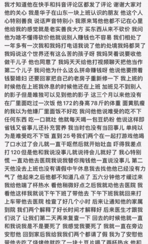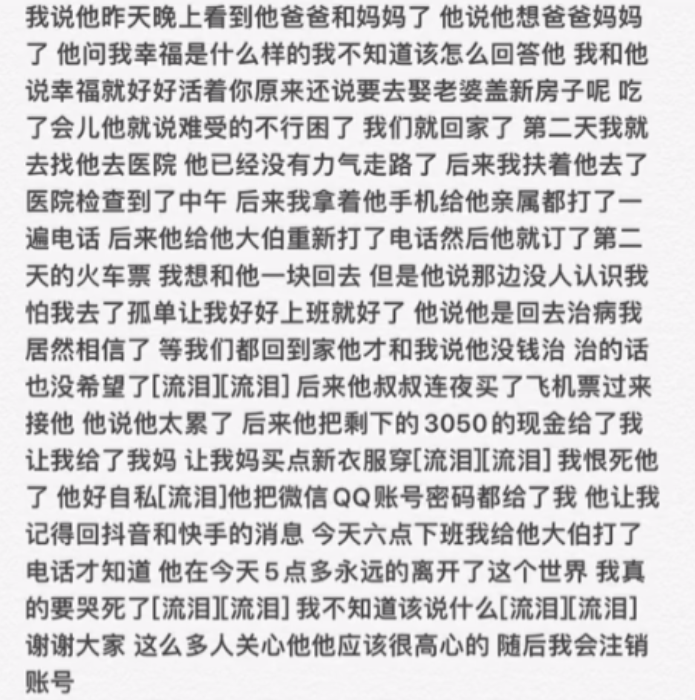 好人不长命!19岁网红“灰太狼”胃癌晚期去世,朋友的怀念信让无数网友泪目,后悔没有早点认识他! 网名为灰太狼的19岁小伙子,在胃癌晚期的折磨中离世,留给这个世界的是一段满是心酸却温暖的生命旅程。 看到他好友发的怀念信,让人感叹他这一生太苦了,灰太狼的一生就像是拼尽全力逆流而上的一叶扁舟。 他努力工作,从不抱怨,他的善良让所有认识他的人忍不住心痛。他的不幸从小就开始了,四岁爸爸因肺结核和酒精中毒去世,七岁妈妈在一场车祸中离开。 他拼命工作,别人上班他也上班,别人休息他还在上班,可命运却一次次捉弄他。好友说他一天只吃一包豆奶粉,他说省事省钱又营养,事后好友才知道是根本吃不下饭,是因为胃癌让他连咽水都痛不欲生。 他都离开的那天,很多人哭了,在最后的时光里,他把希望都给了别人,把绝望留给了自己。 就连弥留之际,他都在担心网友的牵挂,让好友帮忙回复账号消息,向大家说声别担心,他一生没能得到过幸福,可他却努力把温暖留给别人。 对此有网友表示:95年的我,17年失去了43岁的妈妈,23年11月份,52岁的爸爸又得癌症,一个月前他和妈妈团聚了,今天烧五七纸。直到父母都不在了,才知道死亡离我有多近!陌生的网友们,珍惜拥有的一切吧...... 还有网友说:早一点知道的话,我一定去看他,不管在哪个城市?孩子,你太苦了一路走好,孟婆别忘了给他的汤里加点糖,到另一个世界跟你的爸妈团聚,一定要幸福。 也有网友表示:有人生活那么苦,还保持善良、有的人衣食无忧却再做恶,伤害别人,魔鬼在人间。 看完这个新闻,突然有种看完了一个人的一生的感觉,现在他和他的爸爸妈妈应该团聚了吧,希望他们在另一个世界幸福。 如果可以,真希望能早点遇到你,帮帮你,或许我们改变不了他的命运,但他的善良触动了所有人。 他用尽最后的力气让我们明白,即便生活再苦,也别忘了去爱,愿天堂没有病痛,没有孤独,只有他向往的幸福模样。