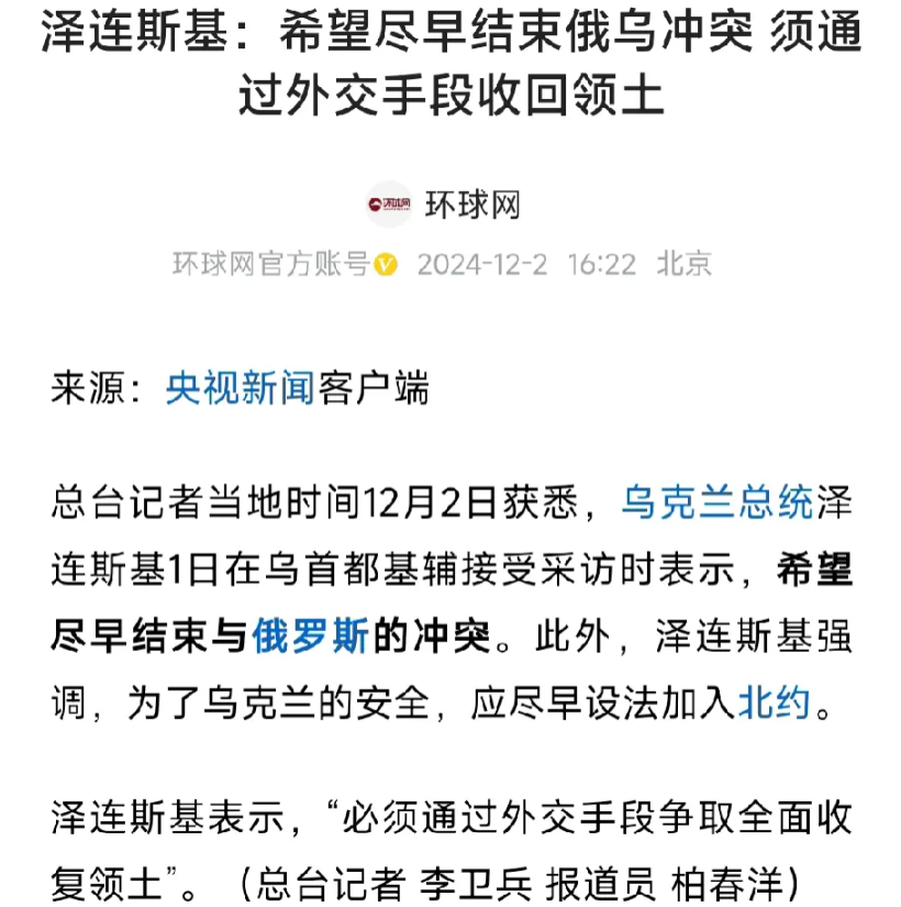 乌克兰总统泽连斯基在乌首都基辅接受采访时表示,希望尽早结束与俄罗斯的冲突。泽连斯基强调,为了乌克兰的安全,应尽早设法加入北约。同时,泽连斯基表示:必须通过外交手段争取全面收复领土。 战争就是因为乌克兰加入北约而起,现在还想通过乌克兰加入北约结束战争?只有泽连斯基演这不靠谱的戏!北约在俄罗斯边境陈兵百万整天整事儿,不让俄罗斯消停,收回?白打了?怎么又成了泽连斯基强调,为了乌克兰的安全,应尽早设法加入北约。昨天还报道司机让北约无条件邀请他吗。支持正义与文明,支持俄国斩断北约东扩的黑手,还人类一个自由与民主的世界 ! 正义必胜,文明必胜,俄国必胜 !想多了,亲西方势力必须在乌克兰被彻底清除,乌克兰需要左翼。 马斯克说的没错:司机真幽默啊!今天说的明天就变,这家伙说话成天都是翻来覆去,没一个准话。有网友发文说,司机在搞笑吗,乌克兰现在有什么可以交易的。国家真的不能让娱乐圈的人来管理!精神病发作了,天天胡言乱语的!啥时候能够正常起来啊!