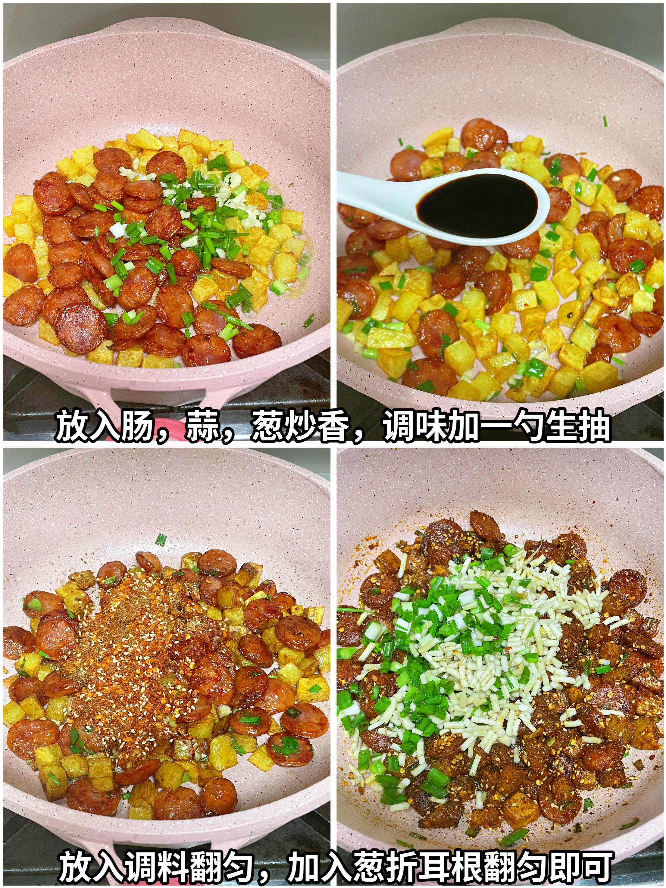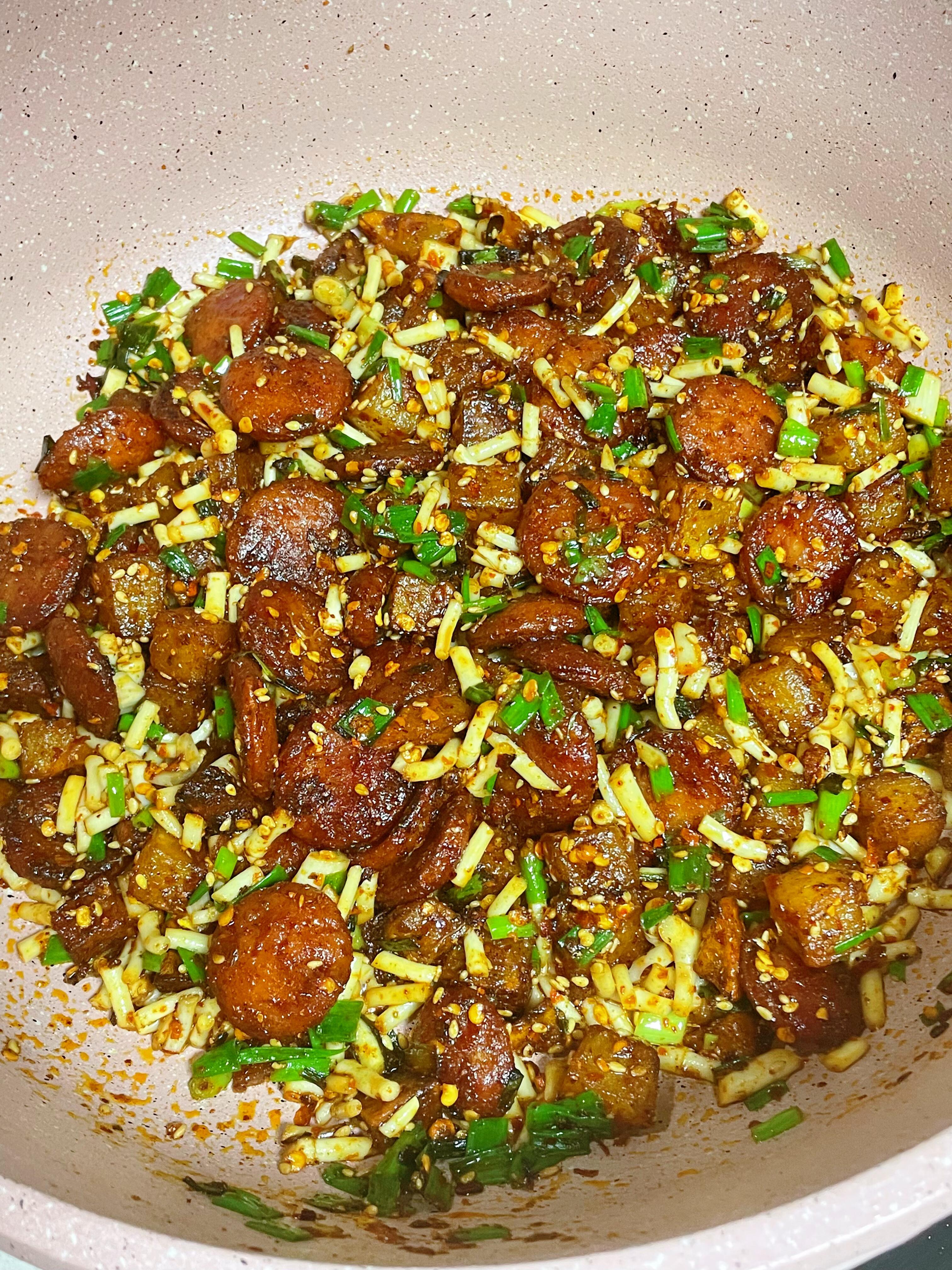终于能理解到好吃到无语这句话了!!! 今天给大家出一个好吃既下饭又下酒的一个,算是小吃菜系列,喜欢的宝子可以尝试一下,真的是巨好吃。 食材:本味雪山黑猪辣条风味肉肠,土豆,折耳根 做法: 1、折耳根切断,葱切碎,蒜末切碎,肉肠切片。 2、调一个灵魂烧烤料:2勺辣椒面,2勺孜孜然粉,2勺白芝麻,1点盐,1点味精,1点糖拌匀备用。 3、将土豆切块,用清水多清洗几次,锅中烧开水,将土豆煮2分钟捞出。控干水分。 4、起锅烧油,油热将我们切好的肉肠中火煎至两面金黄,捞出备用。锅里留底油,将土豆再煎至金黄备用,放入一半的葱和蒜末炒香调味,来一勺生抽翻匀,再加入我们提前调好烧烤料翻匀,加入剩下的葱和折耳根翻匀即可出锅。