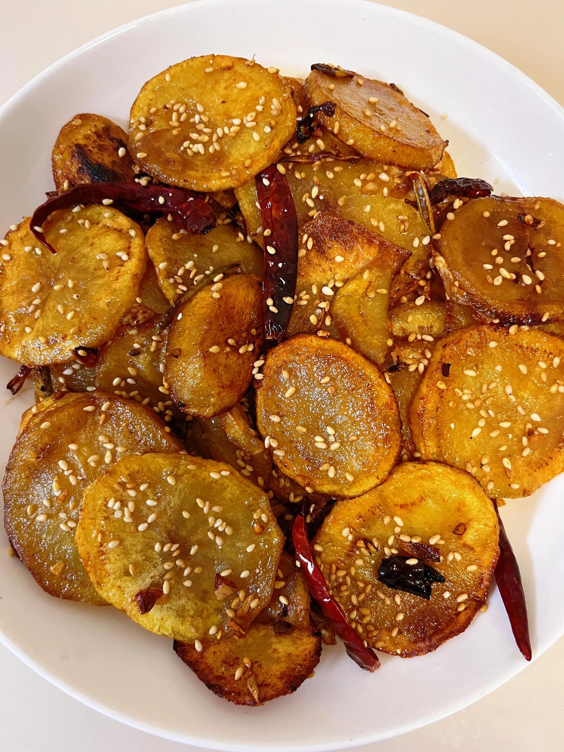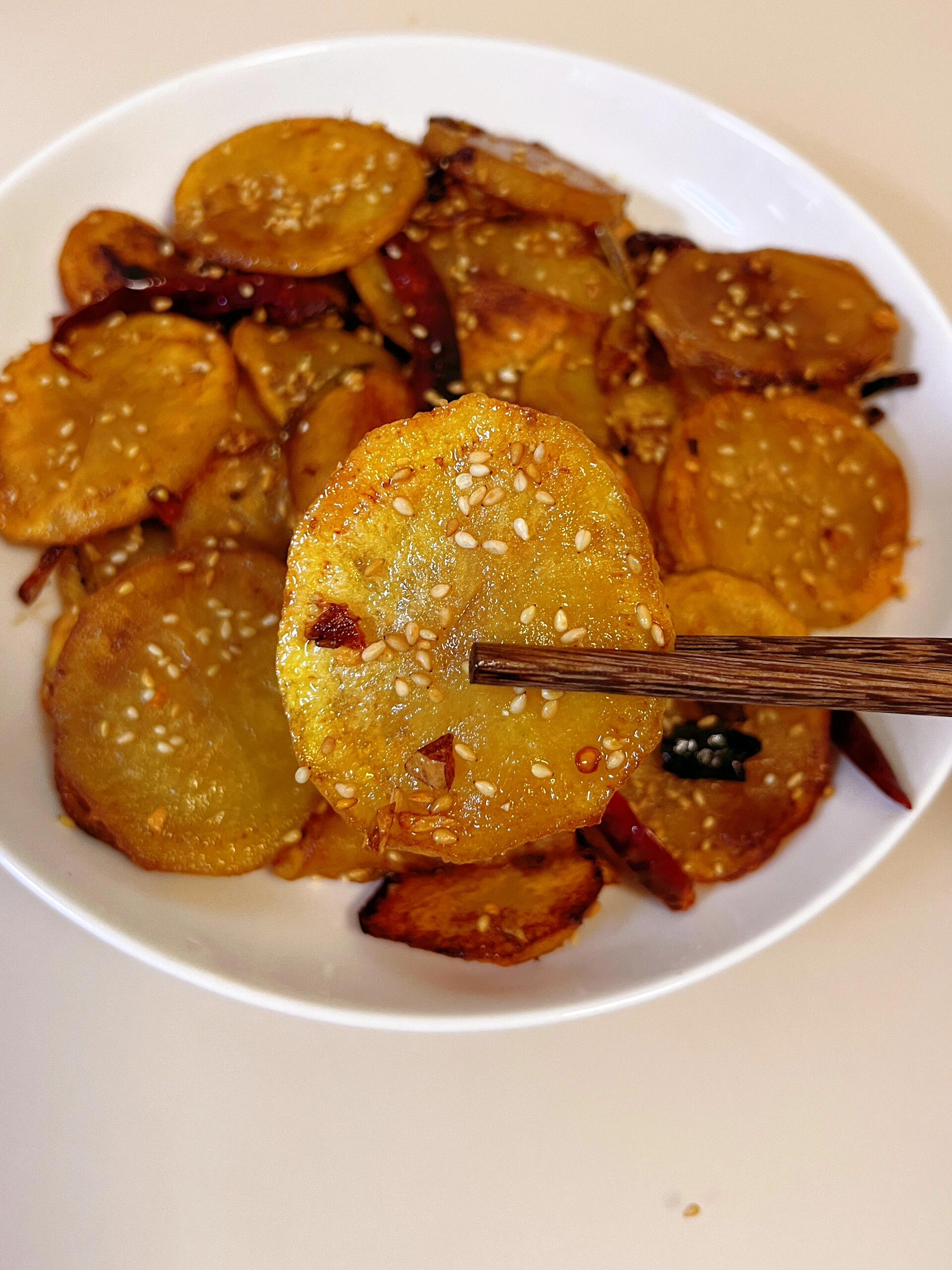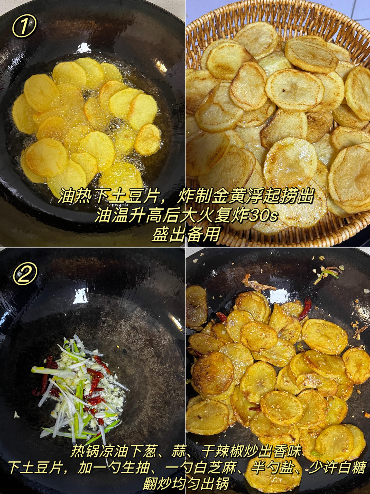 巨好吃的家庭版干锅土豆片!太下饭了吧! 两块钱土豆带给我的快乐!比肉还好吃,做法也超简单的! 食材:土豆、干辣椒、葱、蒜 做法: 1、油热下土豆片,炸制金黄浮起捞出,油温升高后大火复炸30s,盛出备用; 2、热锅凉油下葱、蒜、干辣椒炒出香味,下土豆片,加一勺生抽、一勺白芝麻、半勺盐、少许白糖,翻炒均匀出锅!