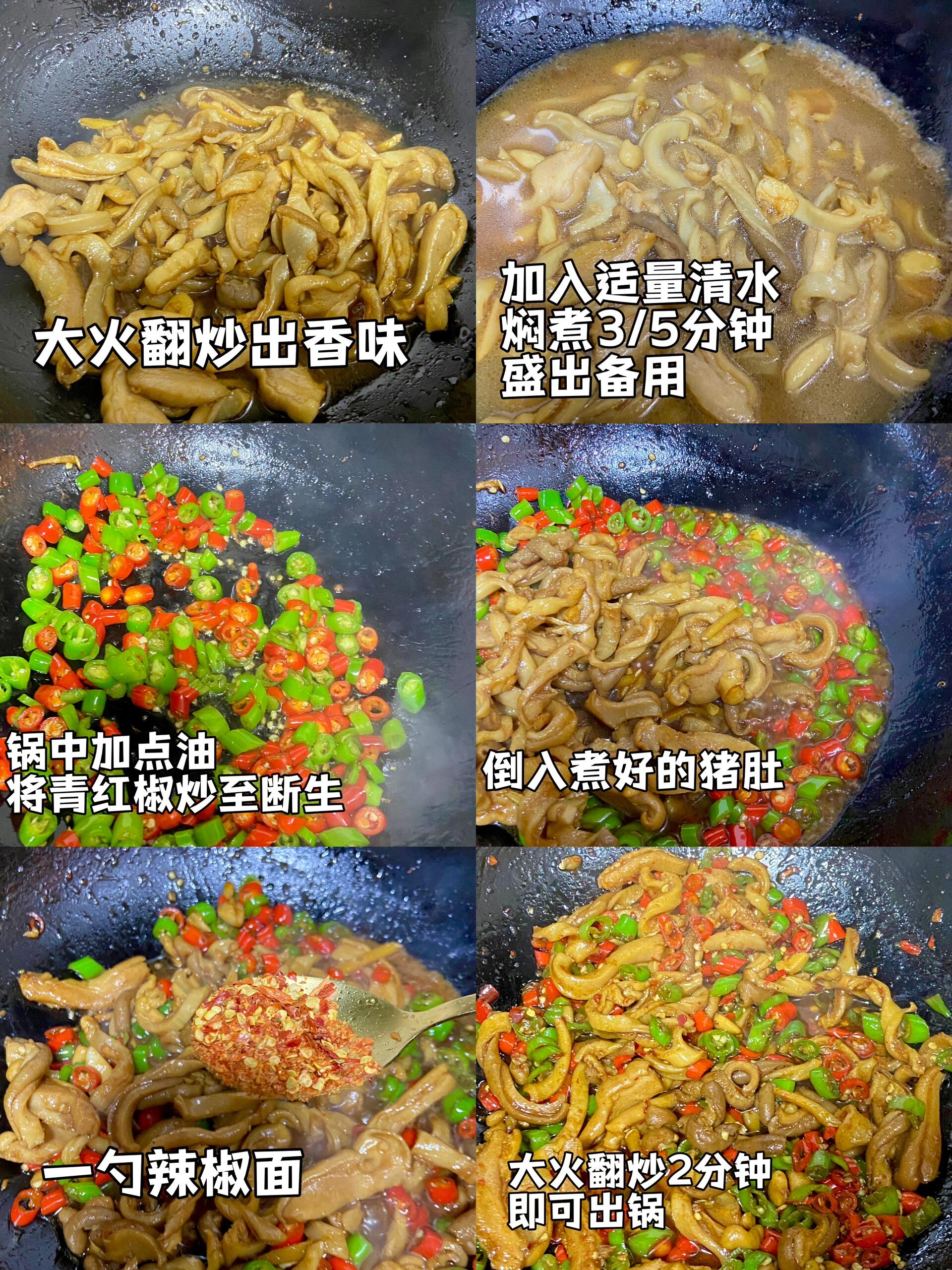 谁都拒绝不了的爆炒猪肚!! 我家年夜饭上必不可少的一道菜!!江西人应该都拒绝不了这道嘎嘎下饭下酒的一道菜吧~~~ 食材:猪肚,姜丝,蒜末,小米椒,青椒 做法: 1.油热下姜丝、蒜末炒香 2.倒入猪肚,一勺米酒,一勺食盐白糖,两勺生抽,一勺老抽翻炒 3.加入适量清水焖煮3/5分钟,盛出备用 4.锅中加入青红椒炒至断生 5.再倒入猪肚,一勺辣椒面大火翻炒1分钟即可