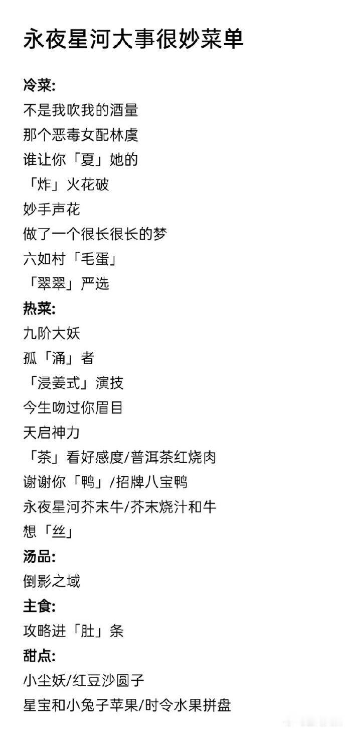 永夜星河庆功宴大食很妙 永夜星河庆功宴菜品名字 看呐,《永夜星河》庆功宴中,大食很妙的菜品名字别具匠心。《星宝和兔子苹果》这一名字的可爱与温馨,与庆功宴的欢乐氛围相匹配,让整个庆功宴更加圆满,设计超赞。