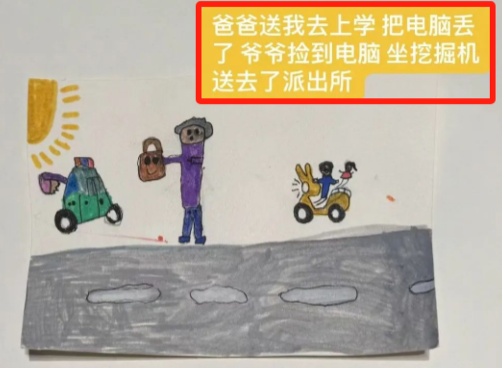 太有爱了!男子送女儿上学时弄丢电脑,一6旬大爷捡到后直接上交!男子特地定制了一面锦旗,不料,女儿竟也准备了一个礼物!还说:“让爷爷拿去吹牛!”结局很温馨......网友:一个拾金不昧,一个懂得感恩,这才是和谐社会的一面镜子。 11月19日,浙江温州,赵大爷这天骑车在路上偶然捡到一个包,里面装着一个贵重的笔记本电脑。 赵大爷却没想着私吞,他在原地等了一会,见没有失主过来,于是就近来到派出所上交给民警。 面对民警,赵大爷没忘了嘱托一番,他说:你们帮忙查查看有没有人家的联系方式,年轻人丢了电脑肯定很着急! 赵大爷叮嘱完就走了,深藏功与名,而在另一边失主张先生则十分焦急的寻找着电脑。 这天,张先生送女儿上学的路上,一不注意把电脑包给掉地上了,他是一名老师,电脑里面存了许多重要的资料。 张先生在女儿上学的路上来回找了两遍,无果后抱着试试看的心态去报警,没想到很快就找到了! 感到十分幸运之余,张先生也想感谢一番,他的妻子通过民警联系到了赵大爷,先是口头上对他表示感谢。 随后张先生又定制了一面锦旗,想要送给大爷,不料,女儿竟然也给赵爷爷准备了礼物。 那是女儿亲手画的一幅画,上面画着“爸爸送我去上学,把电脑丢了,爷爷捡到电脑坐挖掘机送去了派出所”。 张先生调侃女儿:爷爷拿了你得画,就可以和别人吹牛了~ 这幅画童趣十足,也十分有爱,赵大爷收到锦旗和画后笑的红光满面,和张先生及其女儿合影留念。 对此有网友表示:我几个月前去接娃的路上,在小学门口也捡到个手机,等了一会大姐打电话来,然后就送还给人家了,还了之后瞬间就心安了,大姐买了箱纯牛奶给我,我说不要大姐非给,都给我整的不好意思了。 还有网友说:我也遇到过,去拿回来了,人家一分钱都不要,所以说好人还是好多的,好人一生平安。 也有网友表示:我捡到一个钱包,包里现金有好几千,卡有十几张,我让我女儿送去派出所,小孩子不懂事,人家让留电话号码跟地址她就留了,后来找到失主,失主上门道谢提了一袋水果,后来我一看里面四五个橘子七八个苹果,看着已经不新鲜了,皮都有点干了,苹果还有虫吃的,说实话,虽然不图他回报,但是那时候心里还是有点不舒服。 笔记本电脑不想手机,连个定位都没有,丢了真的很难找回,赵大爷拾金不昧的精神弥足珍贵。 而张先生一家知恩图报,和大爷来了一场善意的双向奔赴,女孩的一幅画更是给这件事画上了圆满的句号。 希望这样的双向奔赴多一点,这样善意才能更好的传递下去。 给张先生一家和大爷都点个赞!