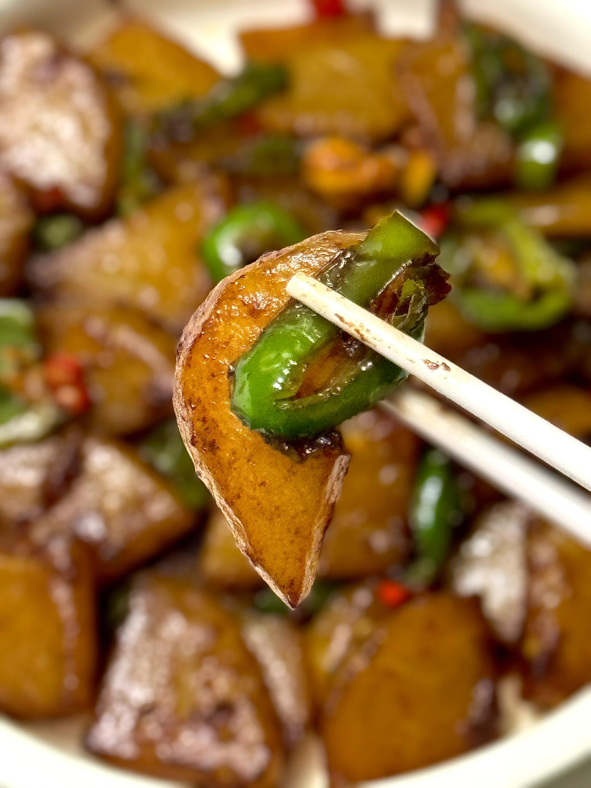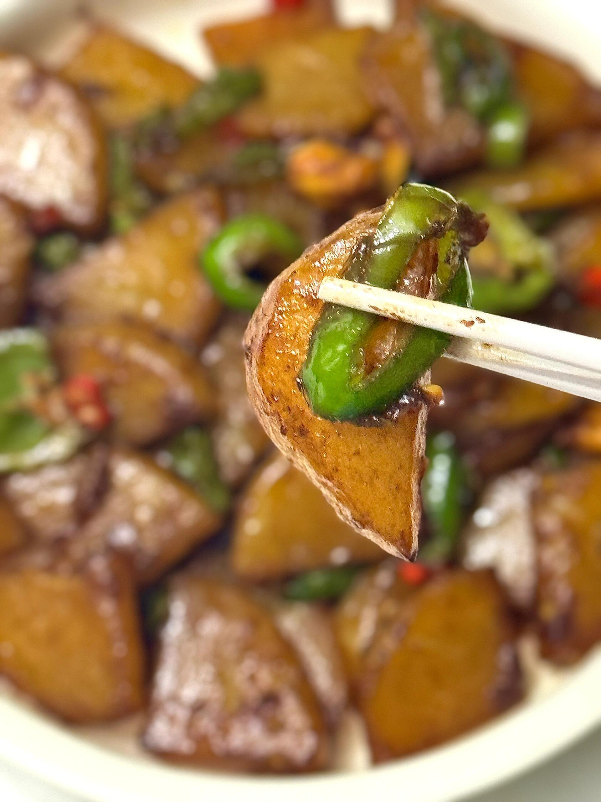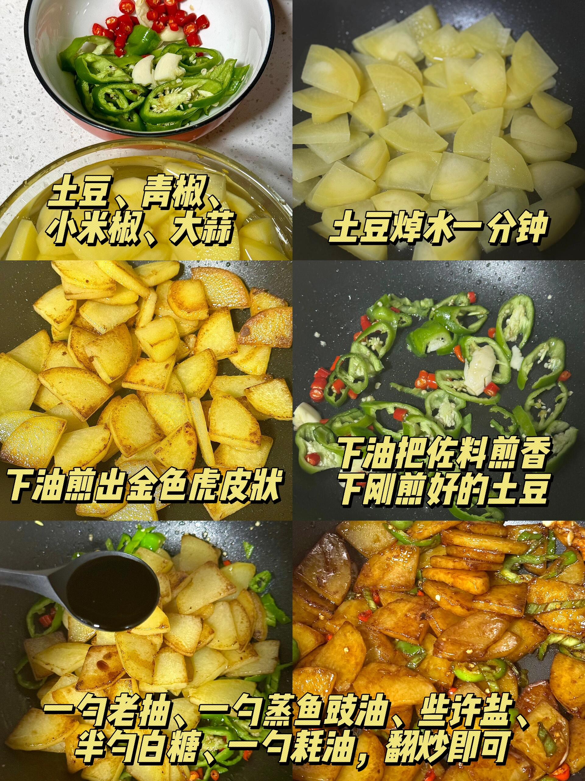 做法:先将土豆焯水一分钟,沥干后下热油煎至金黄色虎皮状,下热油炒香青椒、小米辣、大蒜,下煎好的土豆,接下来就是加酱汁,然后大火翻炒即可