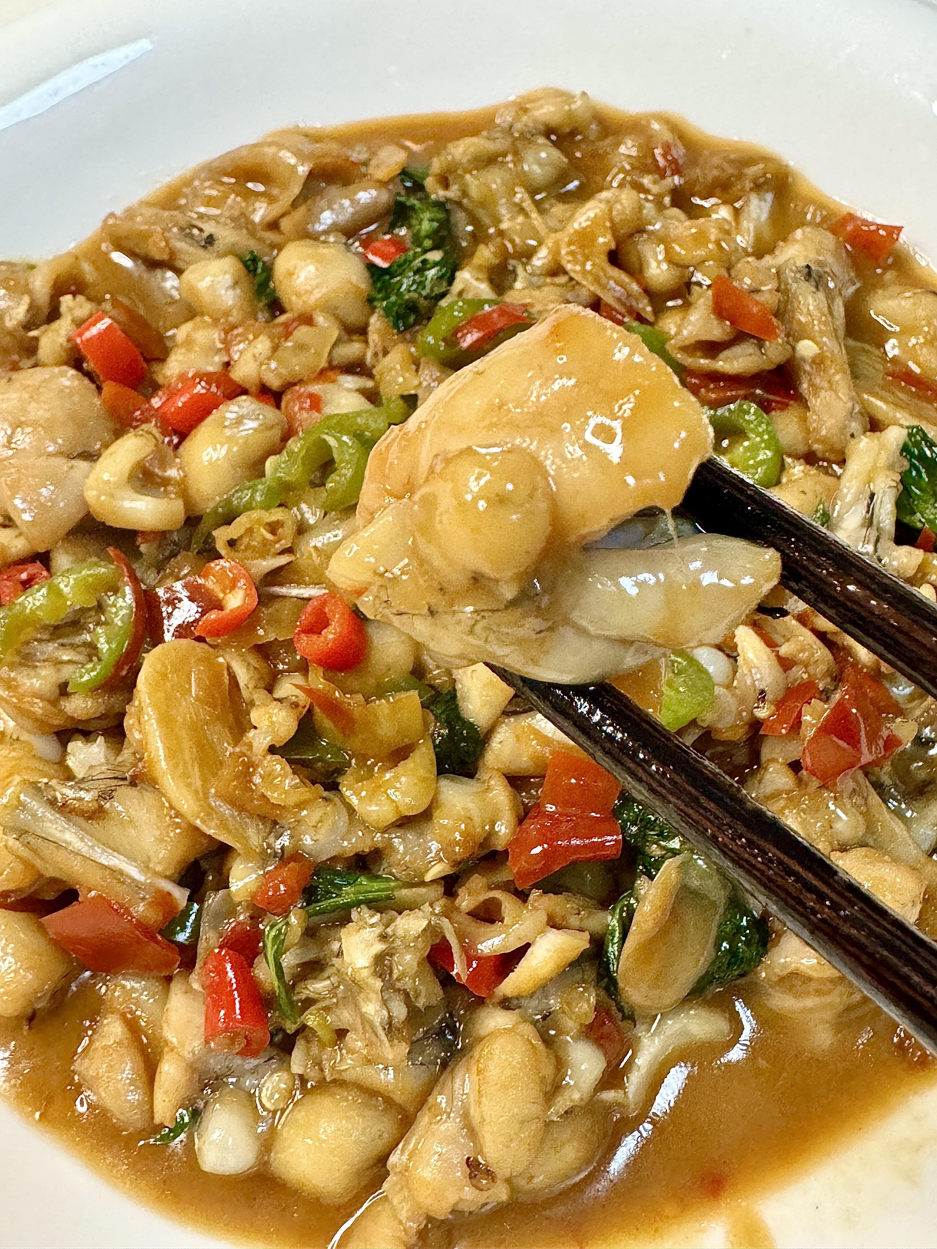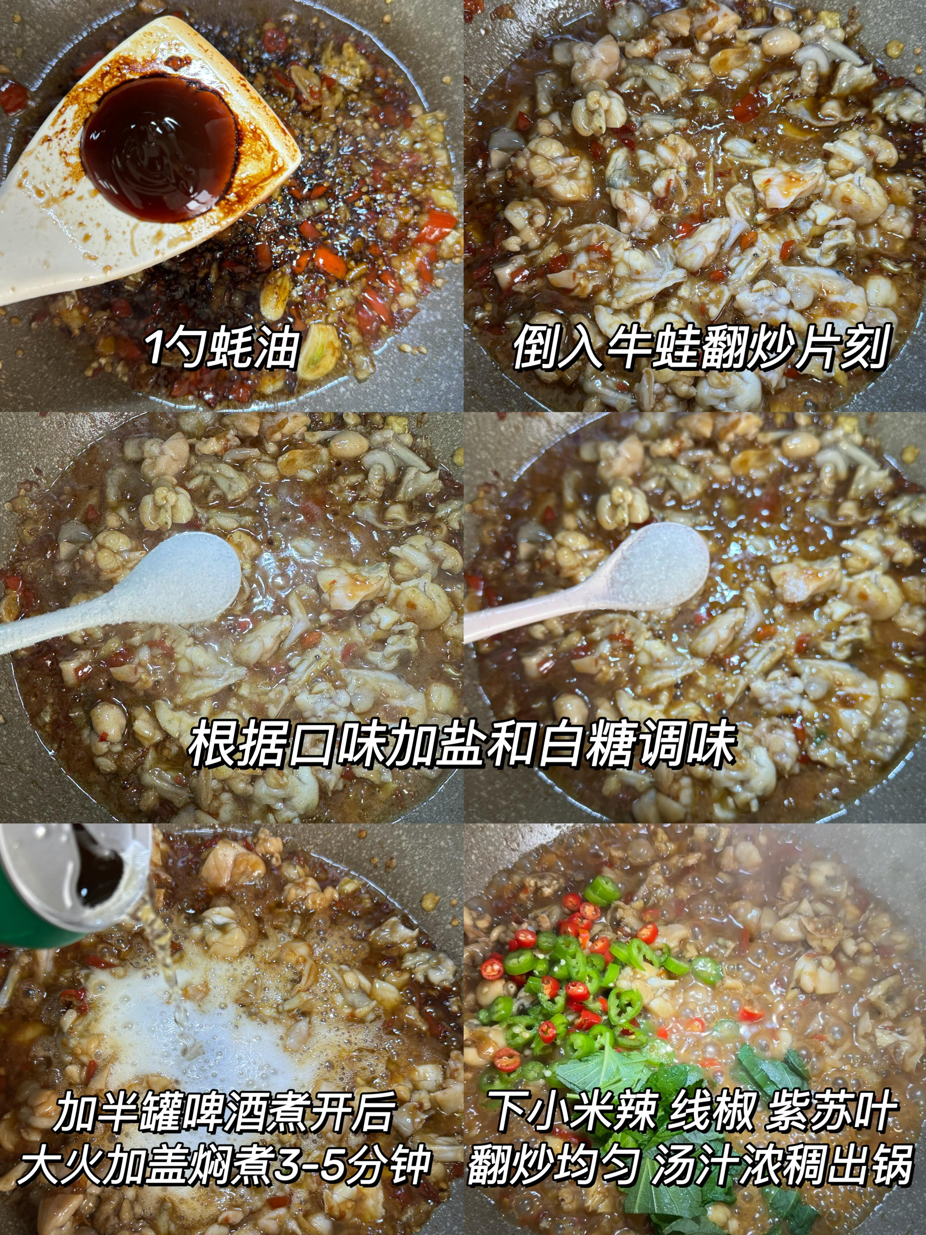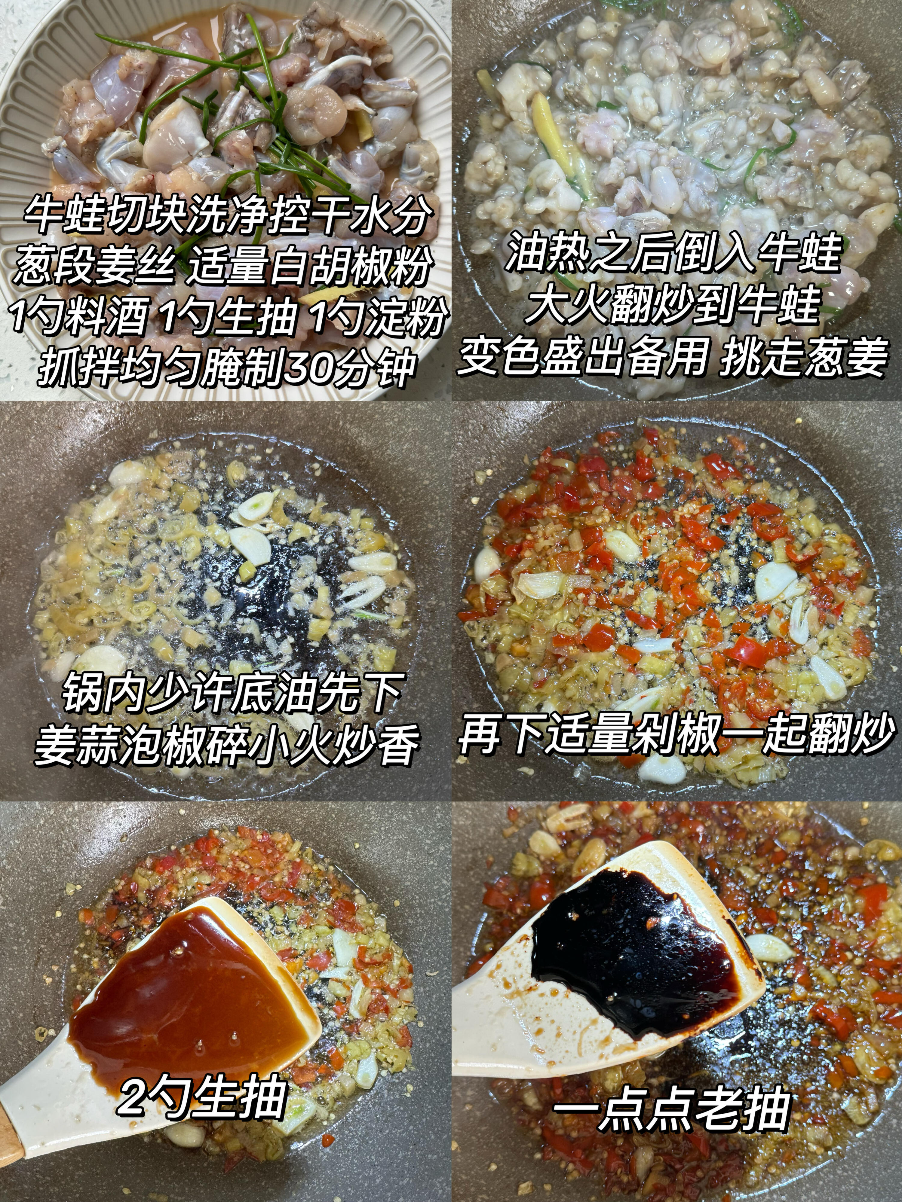 5. 2勺生抽,一点点老抽上色,1勺蚝油,倒入牛蛙转大火翻炒片刻。