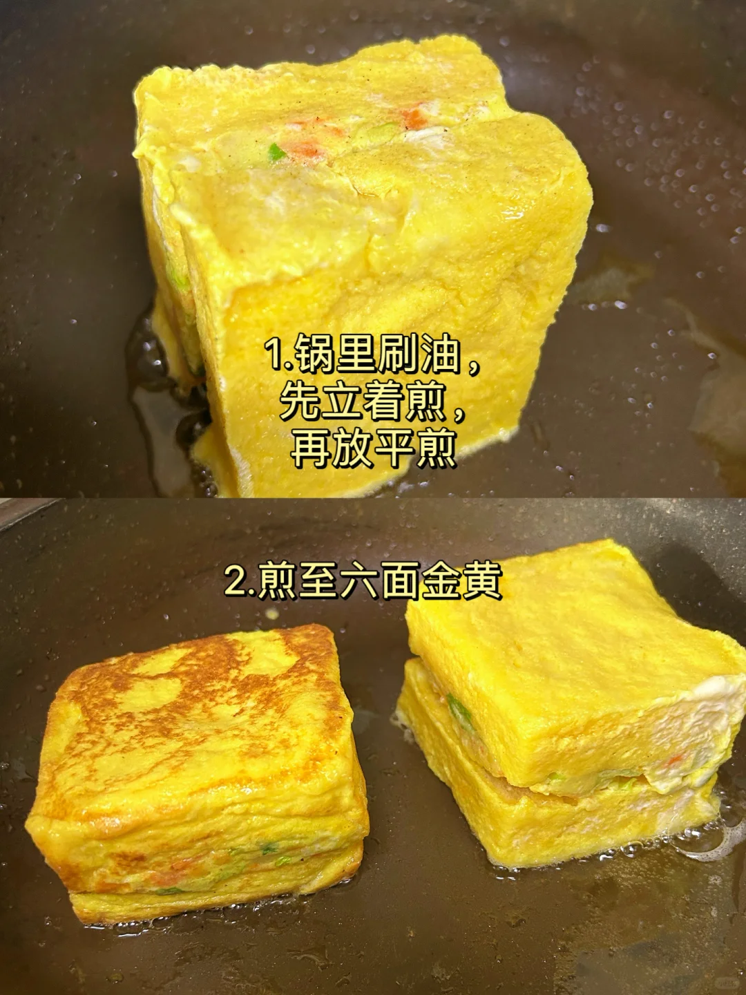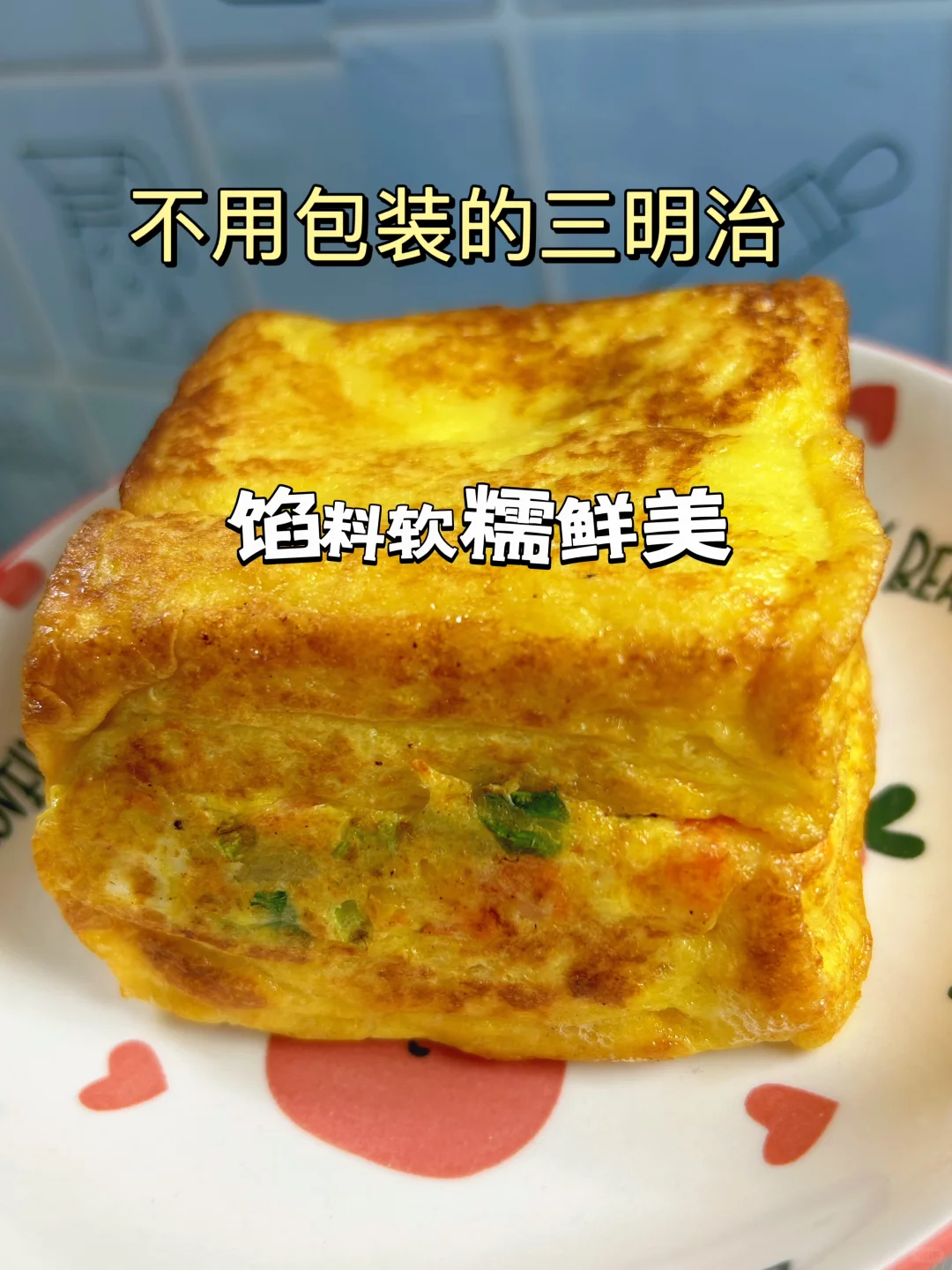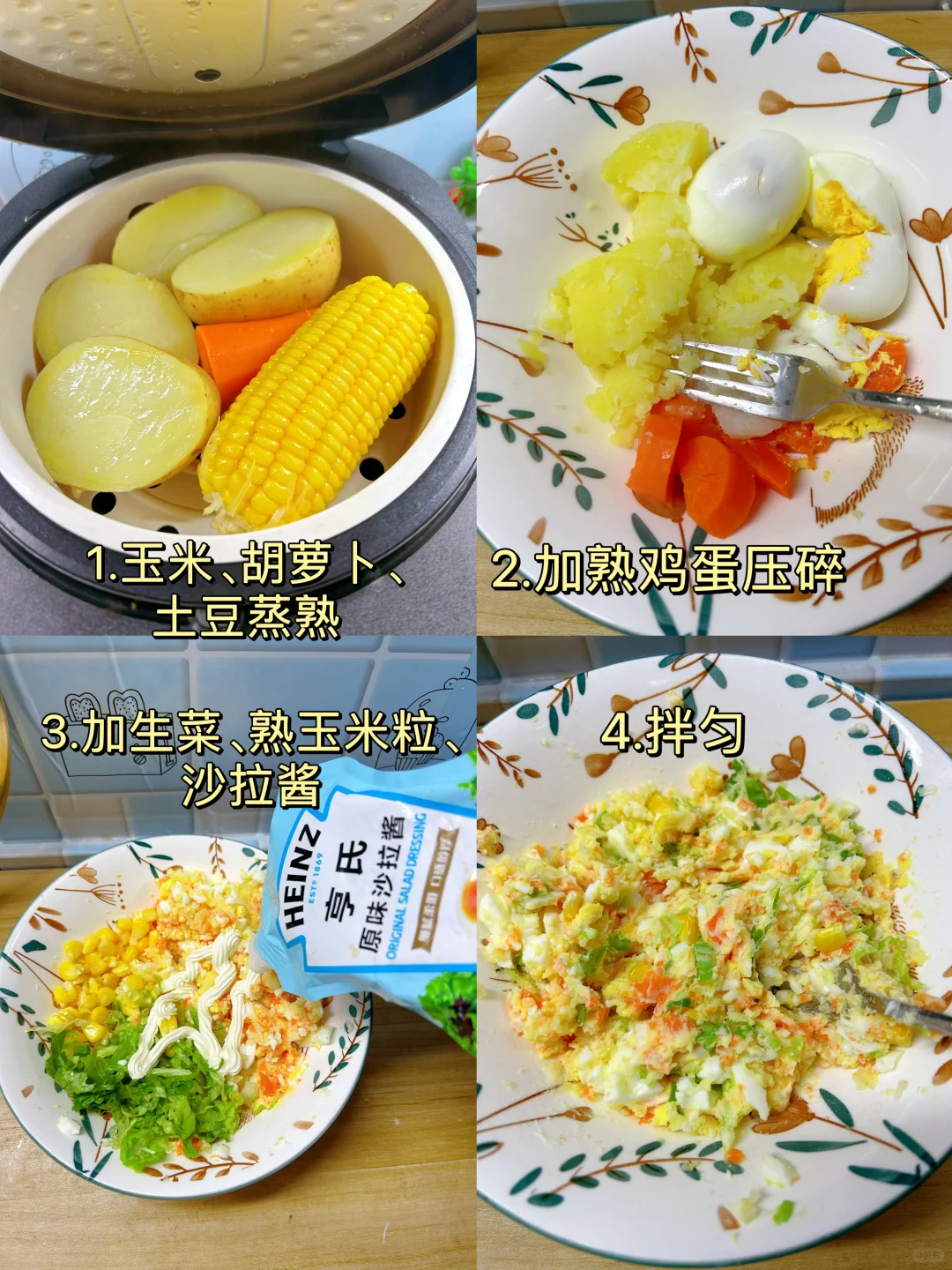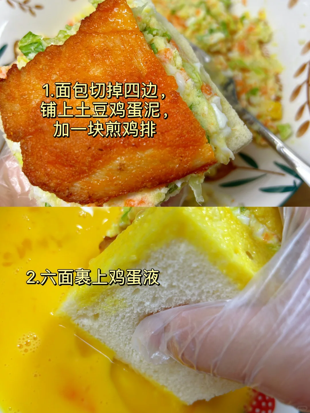 1.不会包三明治的看过来,一款不用包装的三明治,沾了鸡蛋液的三明治,煎一下就是一个整体了。煎一下也更香更好吃。 2.土豆泥加熟鸡蛋压碎,有一定的粘性,不会散开,加上胡萝卜、玉米粒和生菜,营养丰富,再加亨氏沙拉酱,口感非常好,吃起来又糯又脆。
