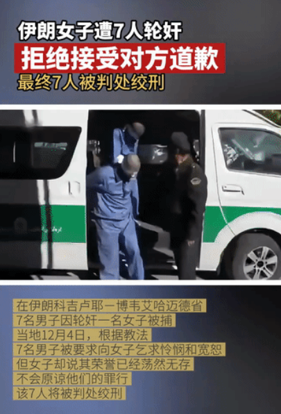 伊朗一女子遭到7人轮奸,拒绝接受对方道歉,7人全部判绞刑! 据重庆晨报12月7日报道,在伊朗科基鲁耶,博韦艾哈迈德省,七名男子因轮奸一女子被捕,当地时间12月4日,根据“教法”,7名男子有机会“逃脱绞刑”,那就是,他们可以乞求女子的原谅,如果女子选择原谅他们,那么他们就不会被判绞刑,不过女子面对七人的乞求,怜悯和宽恕,选择了不饶恕他们,称:自己的荣誉已经荡然无存,不会原谅他们的罪行! 因为该七人并未获得该女子的饶恕,因此这七人为自己所犯的罪付出了代价,被判处绞刑! 我理解该女子的愤怒,而七名男子做了坏事之后,在乞求人家的原谅,岂不是可笑?早知如此,何必当初呢?更何况,这种乞求,这种道歉是真心的吗?不过是鳄鱼的眼泪,不过是怕没获得女子的原谅,会被判绞刑而已! 当然,刚看到这条消息的时候,我确实挺震惊的,毕竟这七名男子不能被称为人了,更令我震惊的是,七名男子还有脸祈求该女子的原谅,当然,结果大快人心! 个人觉得这样的处理方式挺好的,让受害者左右加害于她的这些罪犯的命运,不过,西方所谓的“人权”人士,估计又得站出来说话了! 大家怎么看待这件事?