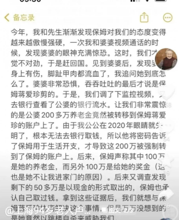 上海一女子回国探望公婆,保姆却不让他们进门,女子觉得奇怪,想了很多办法终于见到了两位老人,可眼前的一幕却令他们心如刀绞...... 卢先生和沈女士心如刀绞,保姆蒋珍竟把父母照顾得“遍体鳞伤”,夫妻心怀愧疚的同时、决定要将蒋珍绳之以法。 也不怪儿子儿媳怒火滔滔,对于卢老太老两口来说,蒋珍这个保姆就是“瘟神”。 卢老太和丈夫,一个曾是钢琴教师、一个曾是医生,两人都有着不斐的退休金,而他们的儿子和儿媳,也经常给老两口生活费,即便用不了。 事情的转折出现在2017年。 彼时,卢老太和丈夫一个瘫痪、一个快要失明,而卢先生夫妻俩又接到了出国工作的通知,万般无奈之下,卢先生夫妇聘请了照顾父母近三年的钟点工、保姆蒋珍,让她全职照顾父母,月薪8000元。 对于蒋珍来说,可谓是天降好事,每天到处跑着干钟点工,不稳定不说,到手的工资也没多少,而卢老太夫妻两人都是有学问、有修养的人,她也愿意全职照顾。 每天打卡上班照顾两人,定期和卢先生夫妇汇报二老的情况,便是蒋珍的日常工作。 2019年底,疫情开始辐射全国,而看到一直对父母尽职尽责的蒋珍、卢先生夫妇决定让她居家照顾,并将其工资提高至12000元。 穷人乍富,这便是此时蒋珍,卢先生夫妇不知道的是,她早已经瞄准了卢老太夫妇的巨额存款,居家之后,蒋珍的本性也就逐渐暴露了出来。 她以日常花销为由,窃取了老两口的银行卡、以及密码,慢慢地开始将上面的钱往家里转,但卢老太夫妇很快发现了苗头,而蒋珍索性也不装了,不仅明知故犯,还逼迫其失明的丈夫签署了一份“自愿赠予200万”的承诺书。 一旦老两口不从,或者惹她不高兴,便会对其拳打脚踢,甚至还会用指甲刀直接剪去老两口身上的肉,以至于老两口经常是遍体鳞伤。 但在与卢先生夫妇的视频中,两位老人还得表现出“和颜悦色”,蒋珍也是一副“良善”的形象。 直到今年,卢先生夫妇回家看望二老时,总会遭到蒋珍的强烈反对,再联想起她疫情期间的阻止探望、以及态度的逐渐强硬和傲慢,夫妻两个细思极恐。 夫妻两个想了许多办法,经过多次波折之后,成功打开了家里的门,但却看到了心如刀绞的一幕。随后,卢先生夫妇了解到,自从蒋珍居家以来,逐渐开始虐待父母,并陆续转走了250万元存款。 夫妻两个初步与蒋珍交谈后,她却耍起了无赖,说钱一部分是自己的,剩下的都是卢老太夫妇自愿赠予,如今已经花完了,一毛都没有剩下。 怒不可遏的卢先生夫妇也不惯着,直接起诉,今年4月15日,该案件初审,但并未宣布结果,而是又进行了调解。夫妻两个同意让一步,蒋珍还回100万即可,但蒋珍竟然以跳楼威胁,一分都不愿意还。 至此,夫妻两个忍无可忍,不但让其将250多万悉数退回,还要追究其刑事责任。 直到5月8日,上海黄浦区人民法院终于对该案件做出宣判:七日内蒋珍返回原告200万元,以及非法占用期间所产生的利息。 案件至此告一段落,而蒋珍因数罪并罚,长期的牢狱之灾是免不了的。 【信息来源:上海94岁老人遭保姆虐待,250多万养老钱被拿走!一审判了 2024-05-11 09:24·光明网】