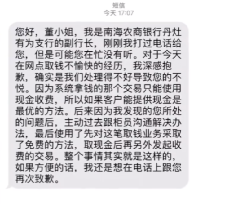广东,一女子去银行取40000元,工作人员告诉她需要支付15元手续费,女子让银行直接从取钱的数额里扣除就行,谁料,工作人员非要让女子重新缴纳,还必须是现金支付,女子没带,工作人员让她前往外面的超市换,女子当场怒了,随后做了一件事情,工作人员立马采纳女子的意见! 真是屋漏偏逢连夜雨,董女士这边着急的不行,却卡在了闻所未闻的“取款手续费”上,看着敷衍且偏执的柜员,她气不打一处来…… 8月底,老家有亲人生病了,需要动个大手术,但手术费一直没有到位,董女士闻言就急匆匆出门了。 广东的太阳尤为炽烈,浑身被“烤”的董女士却无感地来到了银行,由于人太多,挂了号的董女士就在等待区那里焦急地煎熬着。 期间、董女士摸了摸随身带的包,糟糕,忘带钱包了,但好在手机可以预约异地取款功能,没有银行卡也能取钱。 终于轮到董女士了,她拿出手机预约信息急忙对柜员说道:“麻烦帮我取40000现金,我急用!” 面无表情的柜员回复了好的之后,便在键盘上噼里啪啦敲了起来,就在她准备将4万现金拿出之际,却对董女士说:“您好,需要补交15元手续费。” 董女士愣了一下,取款还要手续费,简直闻所未闻,柜员解释道:“由于您是异地取款,需要手续费的。” 董女士也没多想,就在包里翻了起来,结果连个硬币都没有翻出来,就焦急地表示:直接从4万里扣除吧,我着急用。 但柜员却摇了摇头:对不起,我们有规定,我也是按流程办事,您不要为难我! 就在董女士要发火之际,却却见柜员用手一指外面的小卖部,示意董女士可以去那里换零钱,然后交上手续费。 董女士这个气呀,多耽搁一分,医院里的亲人就多一分不测,在银行已经耽搁太长时间了,董女士说什么也忍不了了,眼见柜员非得要现金,董女士也不多说了,直接拿起手机开始录像,她要将事情发到网上,让眼睛雪亮的网友们评评理。 而柜员一看董女士这操作,当然明白舆论的利害,赶紧对董女士赔笑表示:您别生气,公司流程就是这样的,我去请示下领导。 很快,年轻有为的支行副行长闻讯赶来,了解到情况后,对柜员批了一顿:客户是上帝,确实急需用钱,你怎么就不知道变通呢! 在副行长的解释下,董女士明白了,银行确实有取款只能用现金交手续费的规定,而在副行长的解决方式下,是先将董女士的4万存款免手续费直接取出,而后再由董女士用手里的现金补交15元的手续费。 董女士无语了,搞了半天又回到了原地,除了浪费她的时间外,一无是处。 副行长一看董女士这么无奈,便再次致歉,但由于董女士着急离开,副行长便给董女士发了一条诚意十足的短信,挽回银行形象。 事后,董女士看到了短信,但为了更多用户在银行取钱时不受刁难,还是将视频发到了网上。 立时,评论如潮。 【信息来源:椒点视频——女子银行取钱被要求交手续费只收现金,疑被刁难当场发飙:合理吗2024-08-30 21:48】