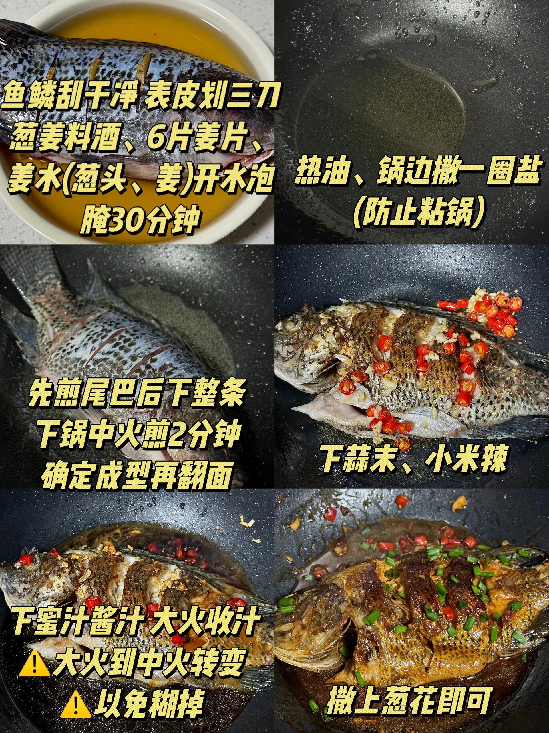 做法: 1、罗非鱼打花刀,放葱姜、料酒、盐抹匀腌制 30 分钟;