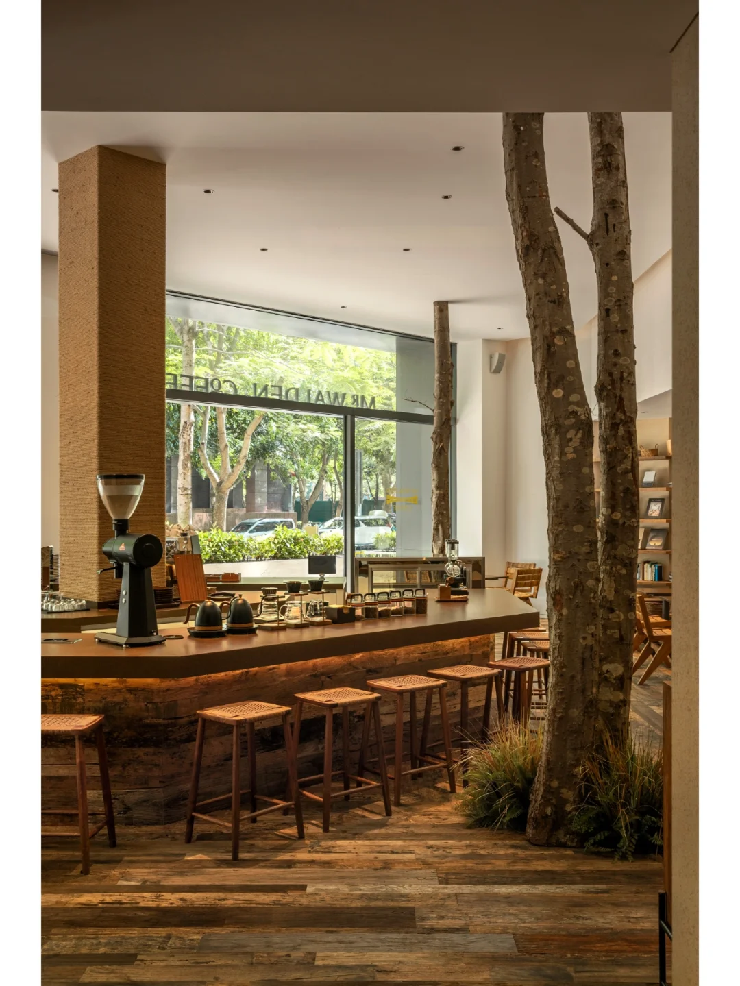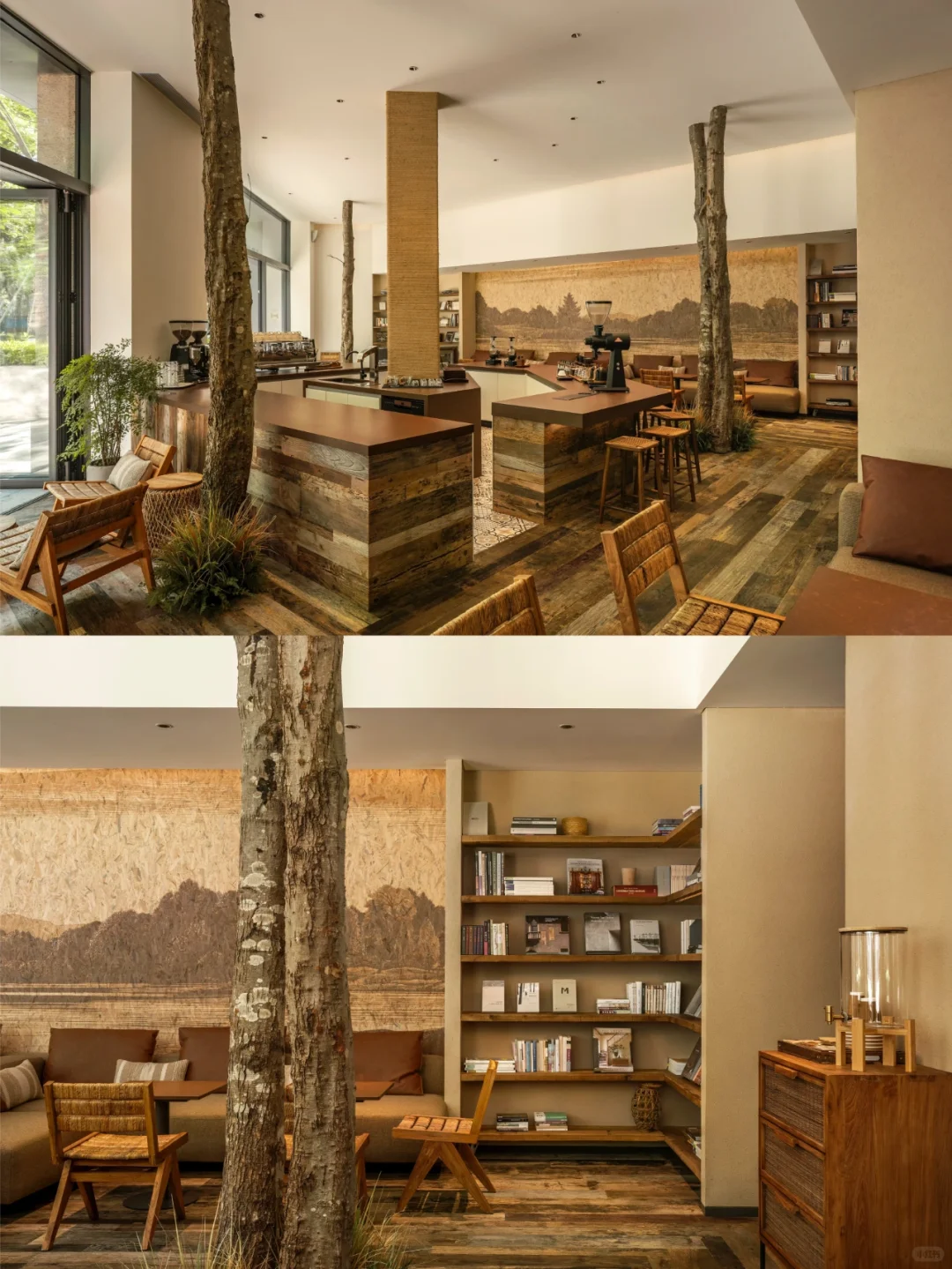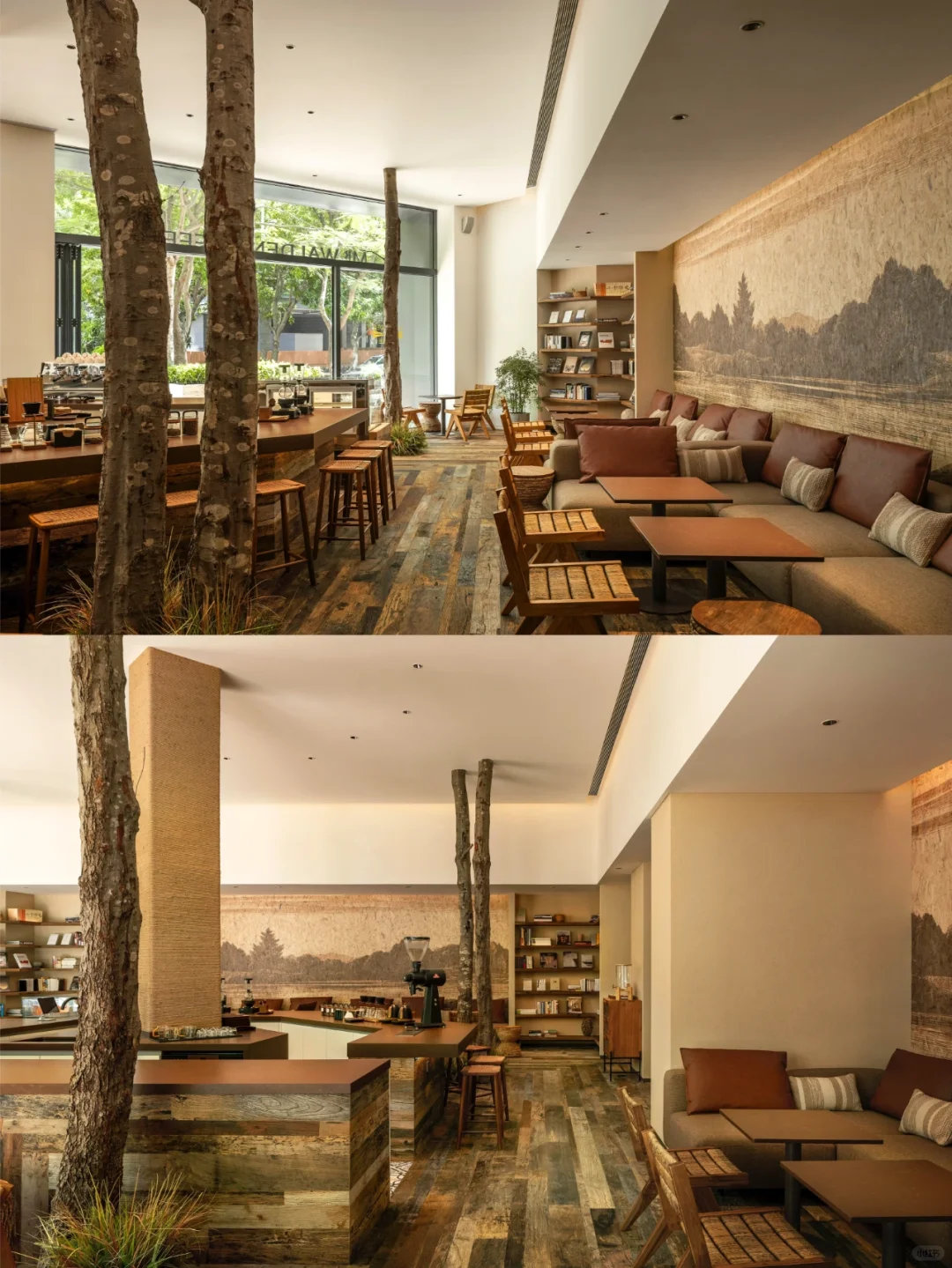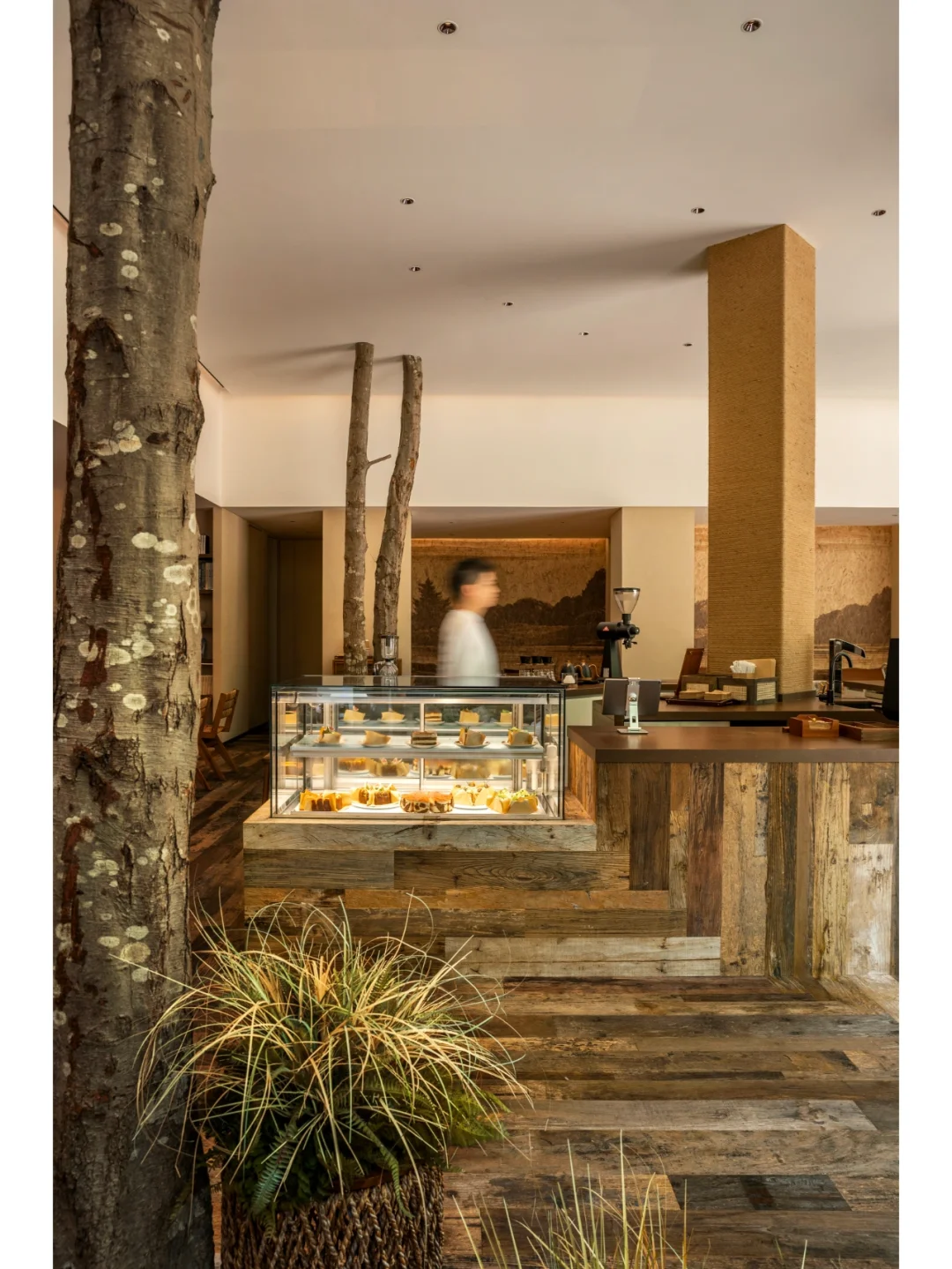 设计将室外沿街的树木元素延伸扩展至室内,树围合出的中心区域作为中岛吧台空间,在两个出入口之间形成了回游动线,用树将户外街道、接待区域、中心吧台完整的划分统筹在一起,每个区域都有各自的围合感。