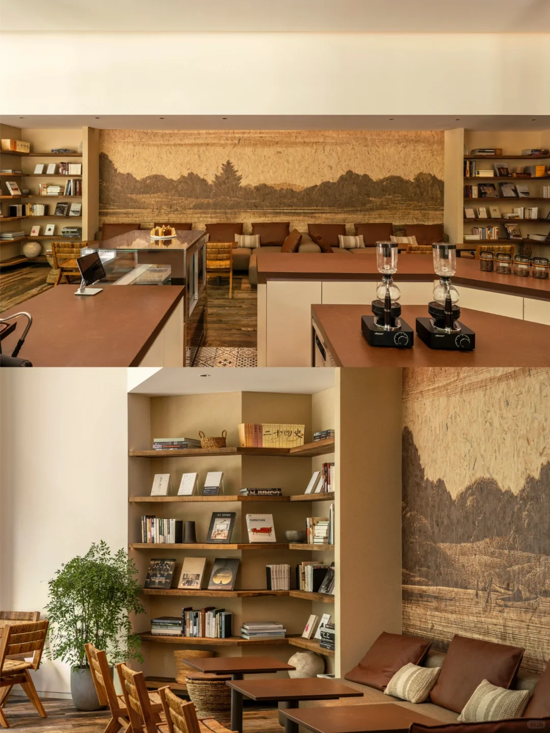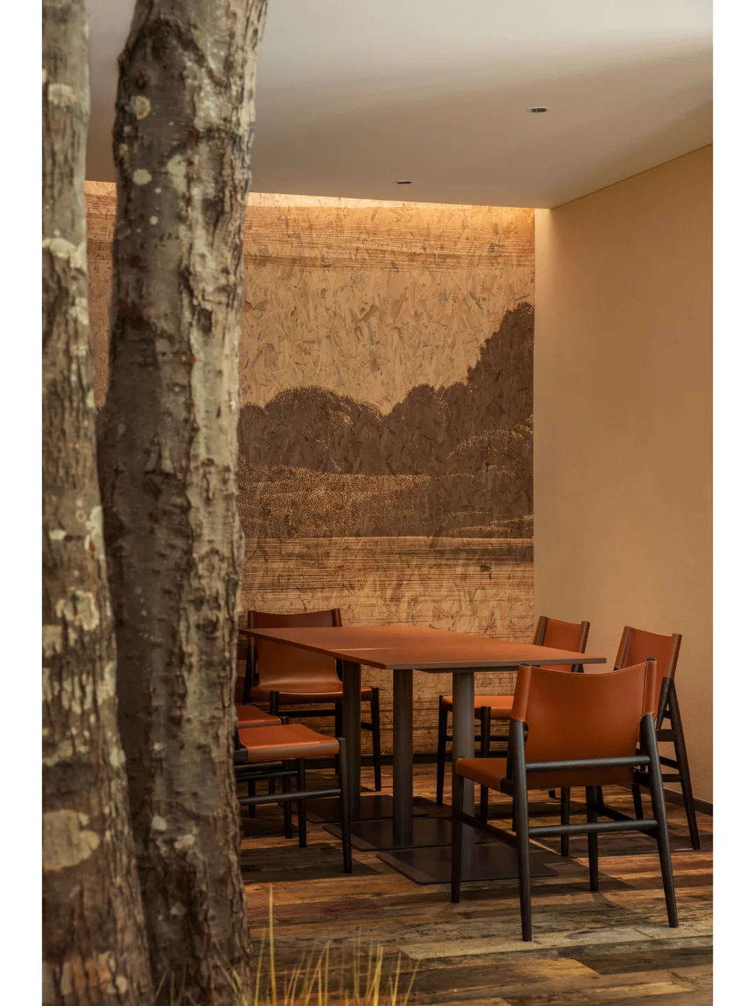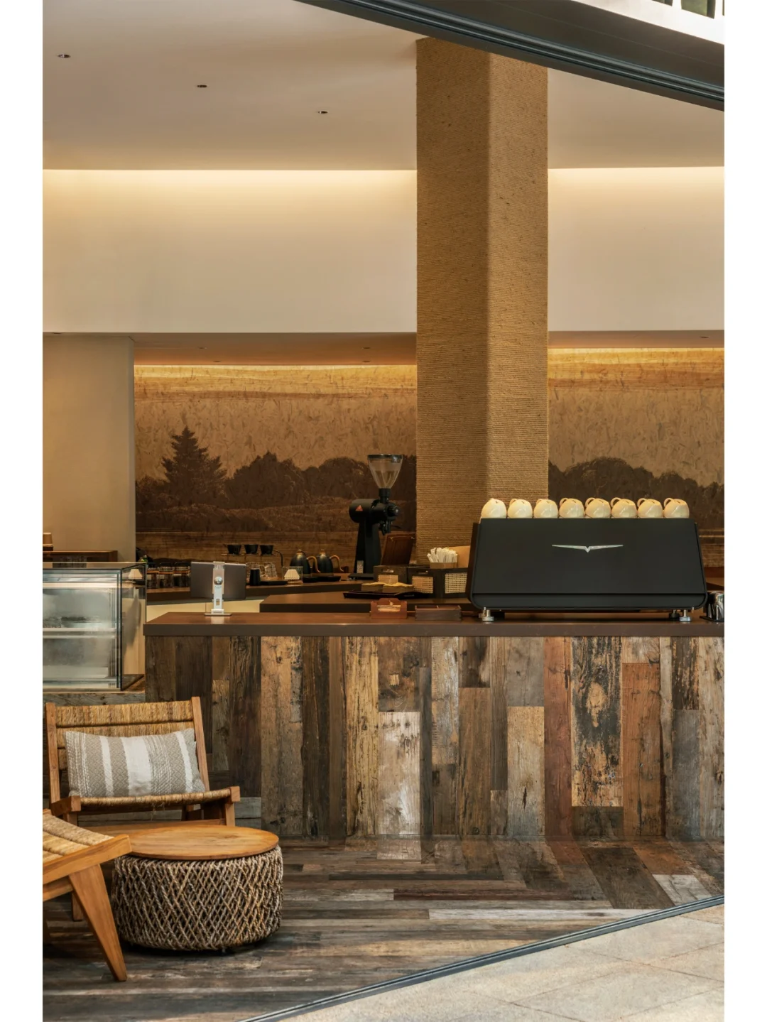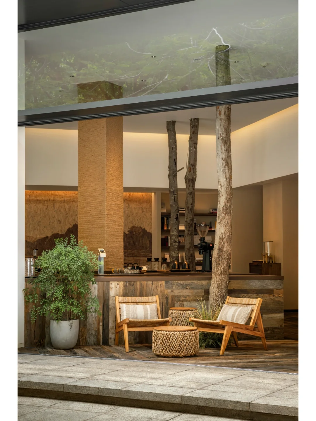 设计将室外沿街的树木元素延伸扩展至室内,树围合出的中心区域作为中岛吧台空间,在两个出入口之间形成了回游动线,用树将户外街道、接待区域、中心吧台完整的划分统筹在一起,每个区域都有各自的围合感。