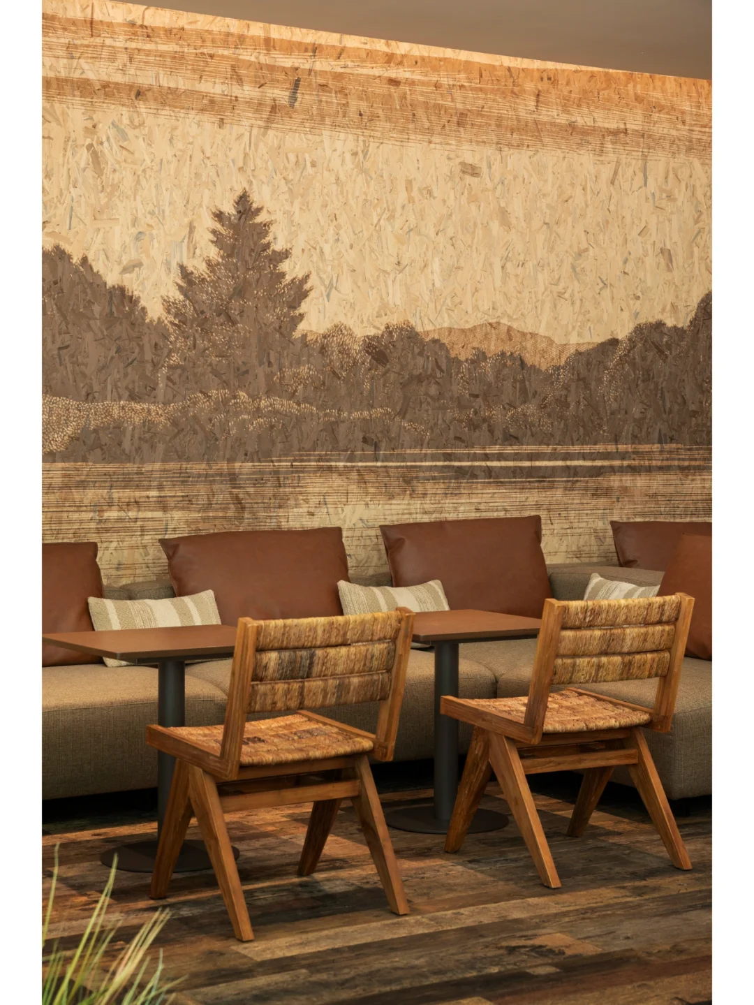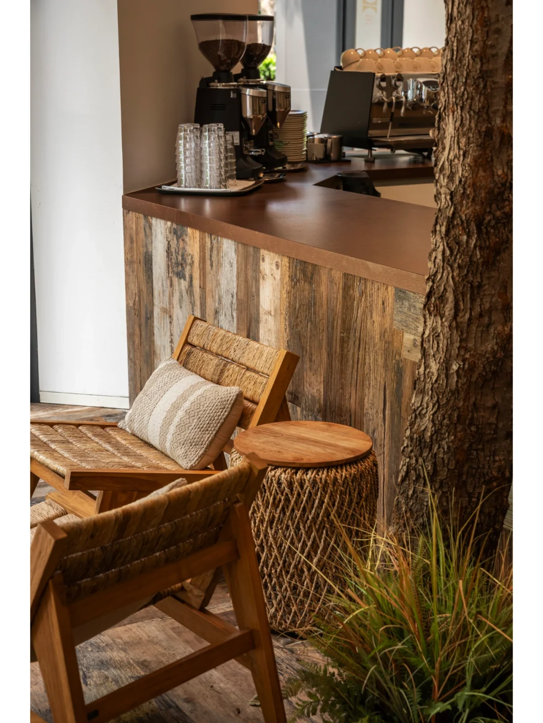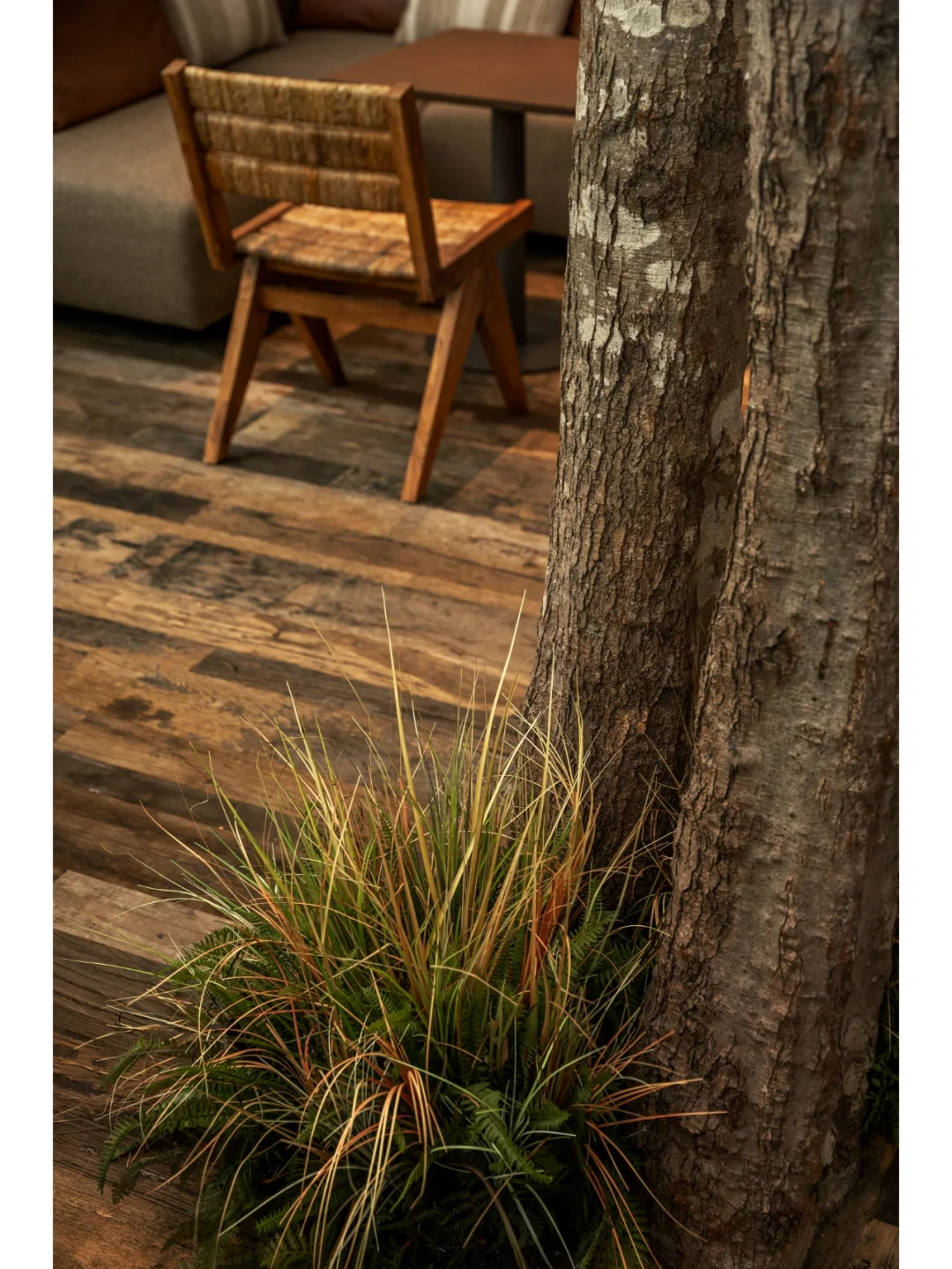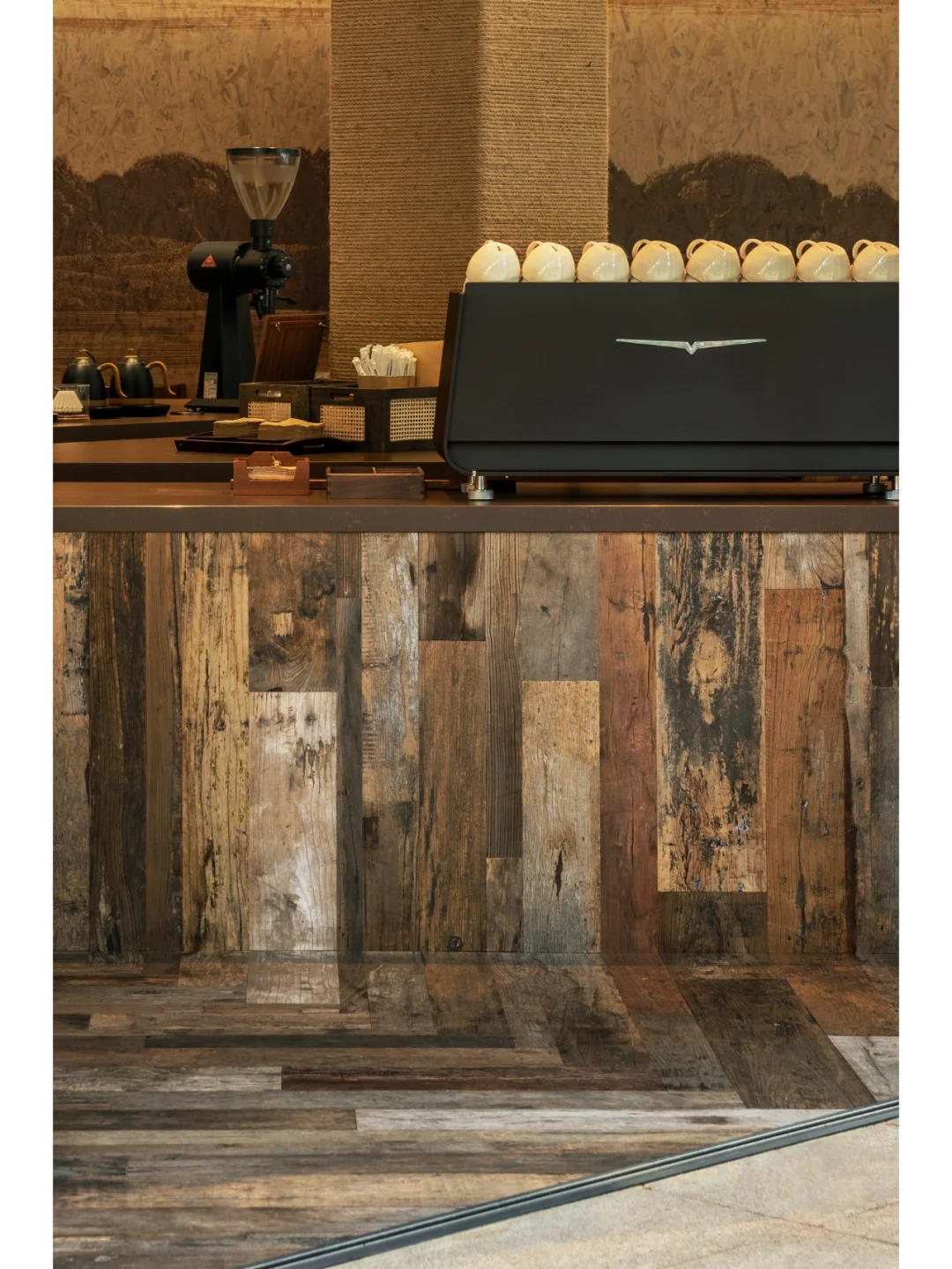 设计将室外沿街的树木元素延伸扩展至室内,树围合出的中心区域作为中岛吧台空间,在两个出入口之间形成了回游动线,用树将户外街道、接待区域、中心吧台完整的划分统筹在一起,每个区域都有各自的围合感。