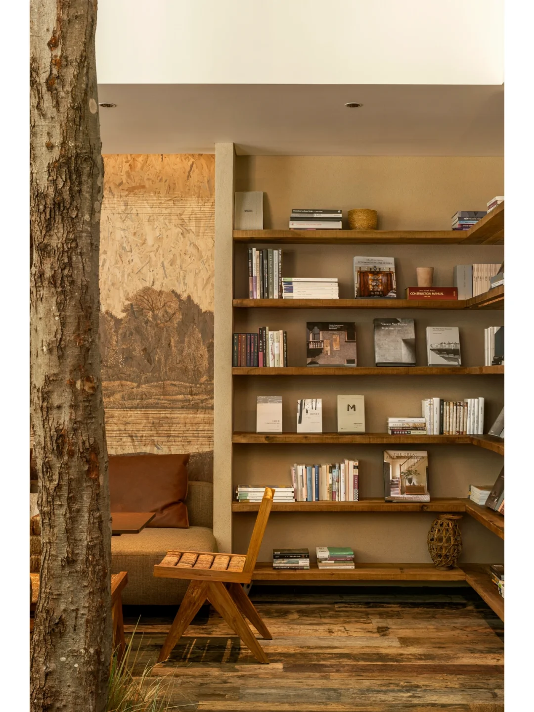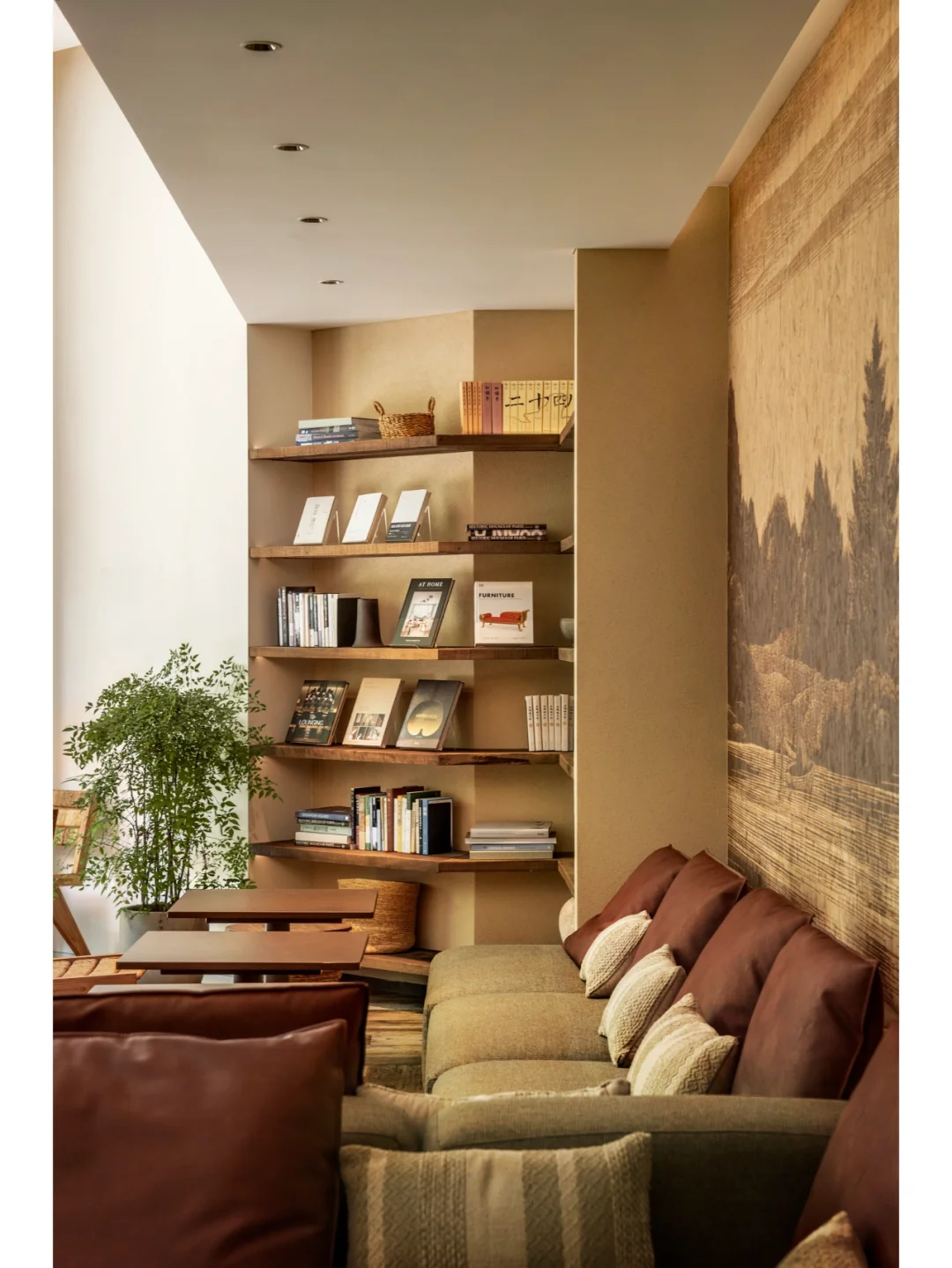 最大化利用朝向街道的景观视线,独立的书架区安置在角落,内部的小隔间提供了更为安定的办公洽谈空间,营造出了度假感、凝聚力、安定感并存的休闲空间体验。