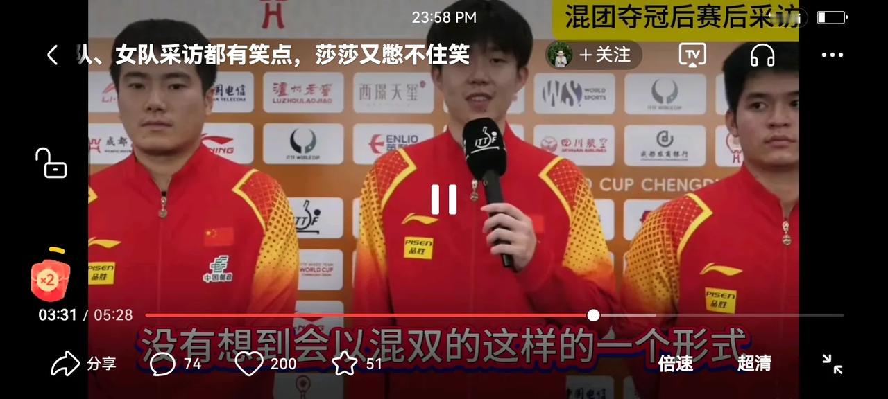 混合团体赛夺冠赛后采访时,大头说他沒想2024以混双结束比赛,觉得很神奇,也很感慨是赛前没想到的,面对任何一场比赛不管是什么位置和莎莎都全力以赴了。当成奥运会来打。[赞][赞][赞][赞]以后不确定还能不能打混双。 混双对大头没影响依然是C位,对莎莎有影响失去了C位。2024有遗憾更有收获和成长,最后一场完美收官,明年继续努力加油。