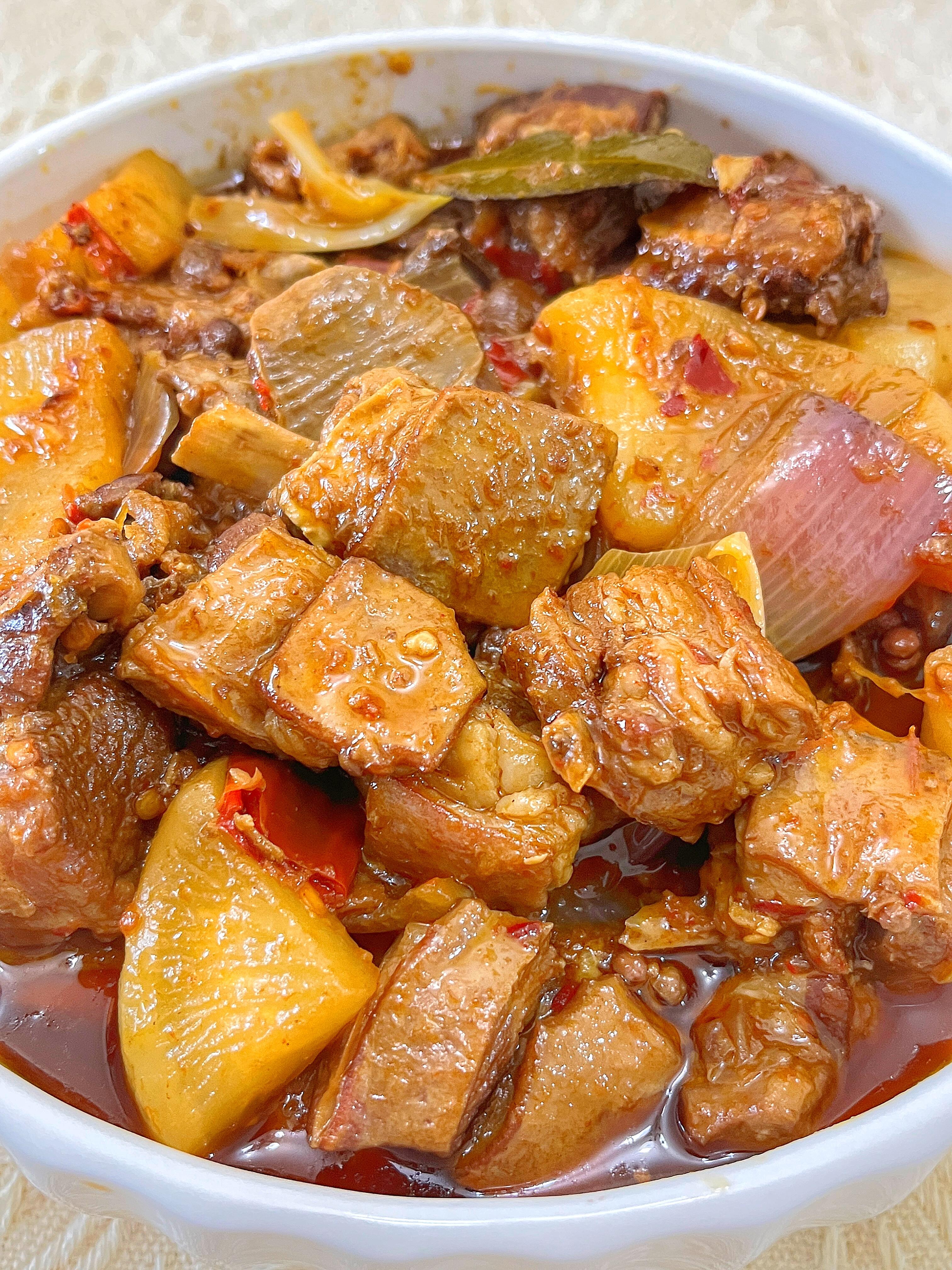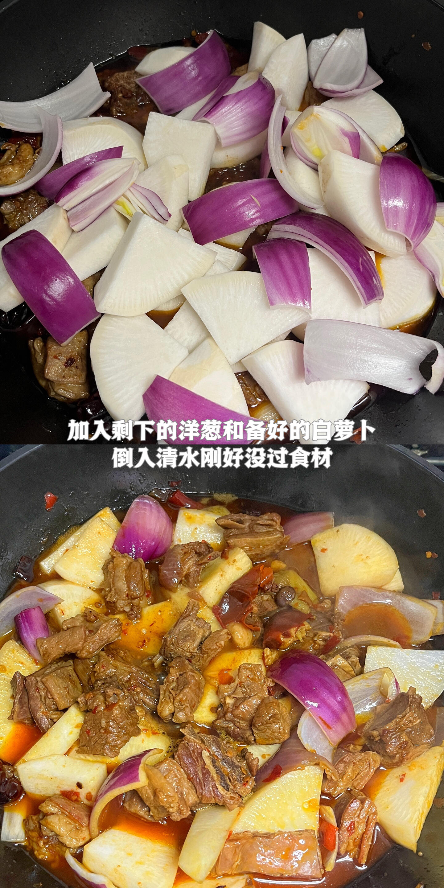 冬天就是要吃热辣暖和的羊肉呀 冷起来了,吃点羊肉暖和暖和,这道红焖羊肉超简单的,快约起来吧 家常做法,不一定正宗,但是味道还是很不错的 食材准备:羊肉(或者羊排)、白萝卜、料酒、豆瓣酱、洋葱、大葱、大蒜、干辣椒、干花椒、香叶、八角(本来还要加桂皮的,但是家里用完了) 步骤:1.油烧至差不多5成热,倒入豆瓣酱、葱段和大蒜炒出香味 2.放干辣椒花椒和香料,小火慢慢炒出红油 3.下羊肉和一部分洋葱、料酒翻炒,炒干水汽 4.最后倒入备好的白萝卜和剩下的洋葱,加入适量清水、盐、白糖、味精,大火烧开转小火,慢慢焖熟即可
