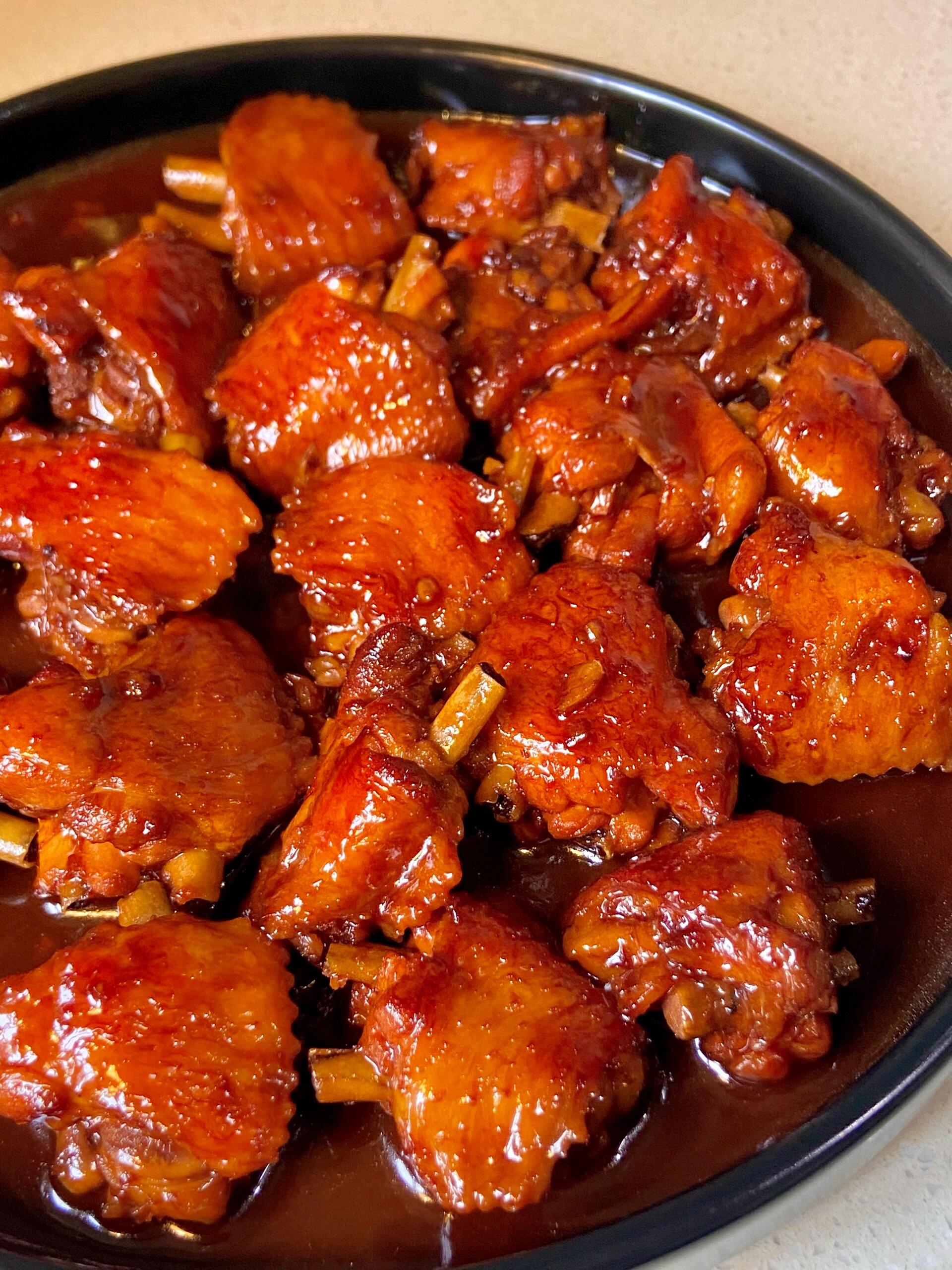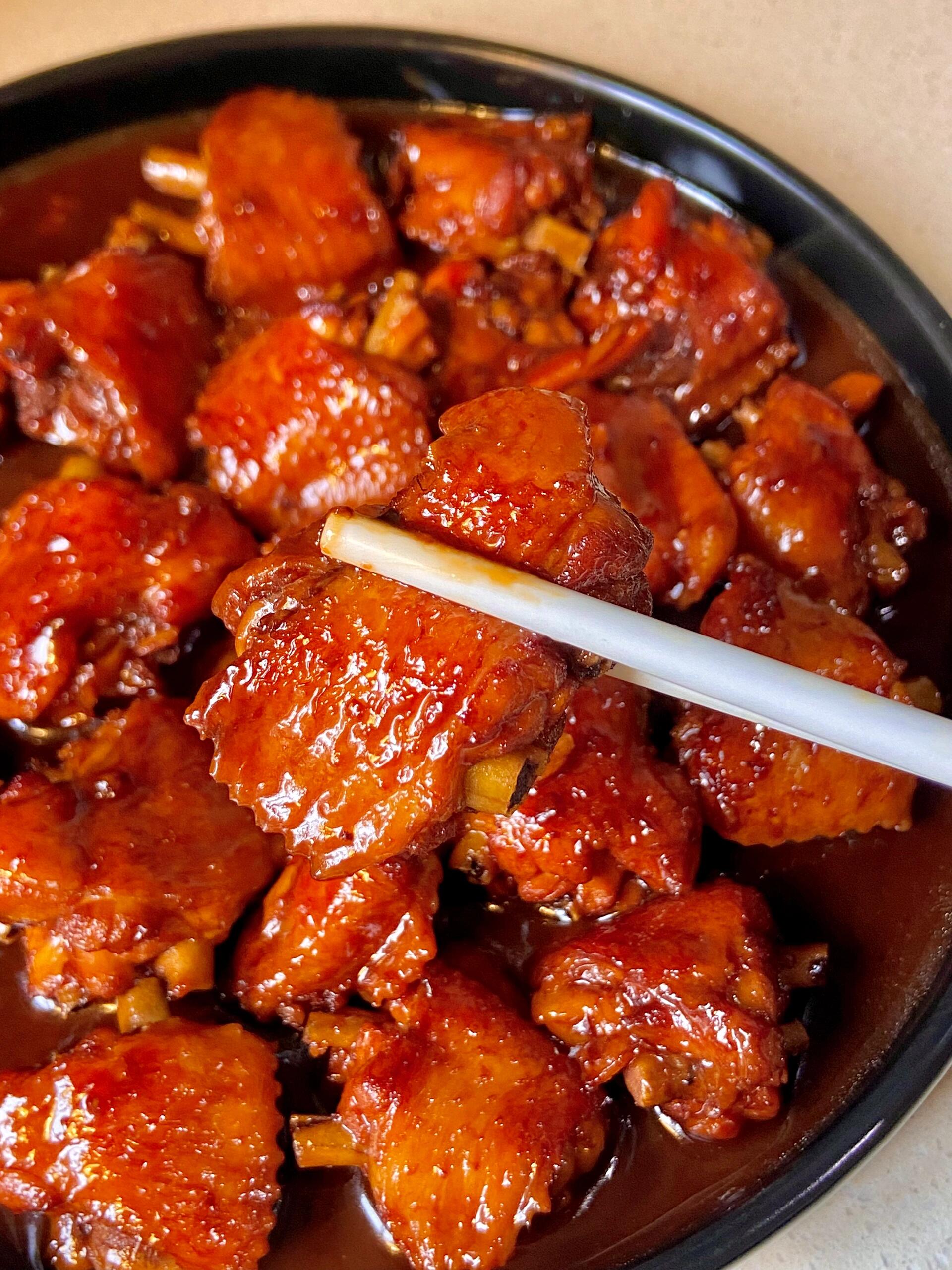 馋哭隔壁小孩的红烧鸡翅 原本是想做江西辣鸡翅的 想着孩子吃不了 就临时改做了这道红烧鸡翅 我的这个配方家里有娃的一定要试试 浓郁软糯入味 做法简单 汤汁泡饭也是很绝 食材:鸡中翅 调料:葱 姜 蒜 冰糖 香叶 米酒 老抽 生抽 耗油 制作步骤 1. 鸡翅洗干净用剪刀对半剪开,冷水下锅,加葱姜料酒水开后煮3分钟捞出; 2. 锅中加少许油,放入冰糖,加热至融化冒泡泡倒入鸡翅煎至两面金黄; 3. 放入葱段、姜片、香叶翻炒均匀,加入一勺米酒(没有的话可用料酒替代)、一勺生抽、半勺老抽、半勺蚝油、适量蒜泥(喜欢吃蒜就多放,不喜欢吃就少放)翻炒均匀,加开水没过食材,盖盖中小火闷煮15分钟; 4. 到时间后锅中汤汁若较多开大火收汁即可。