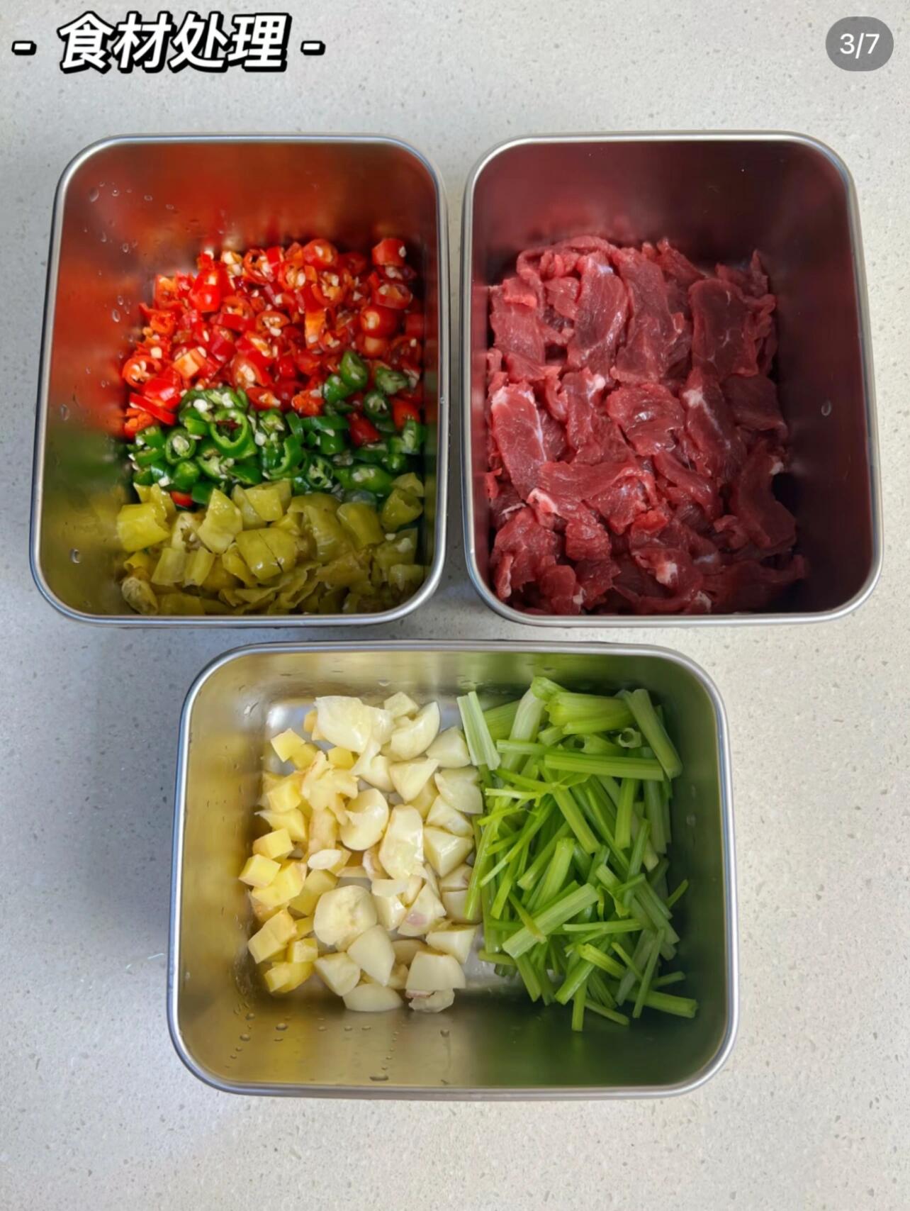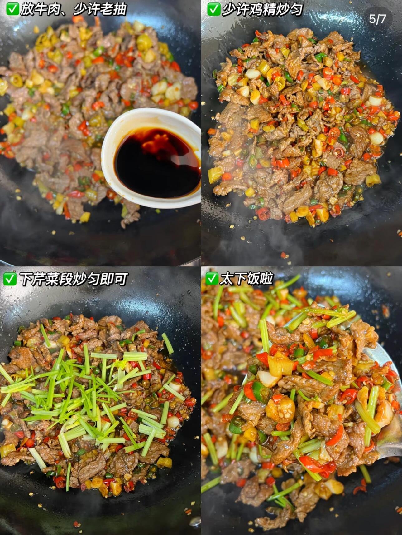 小炒黄牛肉,有点好吃,香辣可口,下饭绝了 今天看到有新鲜的黄牛肉卖,那不得安排个小炒黄牛肉,按这个做法,和店里味道差不多,每次朋友来我家吃饭都会点这个菜,真的巨好吃呀~ 食材:黄牛肉、青红辣椒、泡菜、姜蒜、芹菜; 做法: 1、牛肉切小块,放盐、生抽、蚝油、淀粉水拌匀,再放少许食用油拌匀腌制10分钟; 2、油热放牛肉炒变色,盛出备用,另起锅,油热下姜蒜炒香,再放青红辣椒、泡椒、少许生抽炒香,倒入炒好的牛肉炒匀,放少许老抽、鸡精、芹菜段炒15秒即可