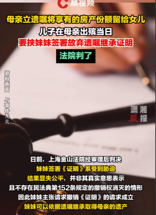 “太无耻!”上海,母亲去世出殡这天,男子突然拿出一份证明,要求妹妹签字,放弃继承母亲的房子,否则母亲遗体就不能上车!为防止遗体腐败发臭,妹妹被迫签字,事后妹妹将哥哥告上法庭,法院判决令人意外! 炎热的夏日,陈家门前聚集了众多亲朋,陈母的遗体即将被送往火葬场,然而就在这个庄重的时刻,一场令人震惊的家庭纷争却在众目睽睽之下爆发了。 陈明(化名),这个本该在母亲葬礼上尽孝的长子,却做出了令所有人瞠目结舌的举动。他拦住了即将启程的灵车,手里挥舞着一份文件,声音冰冷地对妹妹陈丽(化名)说:“签了这个放弃继承的证明,否则妈的遗体就不能上车。” 陈丽难以置信地看着自己的亲哥哥,她无法理解,为什么在母亲刚刚离世的时候,哥哥竟然会做出如此无情的事。周围的亲戚们也都惊呆了,有人小声议论着“太过分了”,有人则愤怒地指责陈明的行为“令人发指”。 然而,面对弟弟的威胁,陈丽却陷入了两难的境地。炎热的天气让她担心母亲的遗体可能会腐败,而延误火化更是对逝者的不敬。在巨大的压力和悲痛中,陈丽最终颤抖着签下了那份证明。 这一幕,成为了陈家多年积累矛盾的爆发点。回想起来,这个家庭曾经充满希望。 陈母独自抚养两个孩子长大,一直希望兄妹能够互帮互助,共同建立一个幸福的家。当陈明大学毕业找到一份不错的工作时,整个家庭都洋溢着喜悦。 然而,这份希望却在陈明带回女朋友小芳后开始破裂。 小芳对陈家的老房子颇有微词,坚持要求婚后必须住新房。为了满足未来妻子的要求,陈明提出要卖掉家里的门面房筹钱,这个提议立即遭到了母亲和妹妹的强烈反对。 尽管如此,为了支持儿子的婚事,陈母最终还是勉强同意了卖房的决定。然而,这个决定却成为了家庭关系恶化的开端。婚后的陈明变得越来越冷漠,很少回家看望母亲,这让陈母深感失落,也让陈丽对哥哥充满了怨恨。 矛盾在陈母病重期间达到了顶点。 躺在病床上的陈母,意识到自己时日无多,决定立下遗嘱,将唯一的房产平分给两个孩子。她希望通过这种方式,能够化解兄妹之间的矛盾,让家庭重归和睦。 然而,陈明却提出了“男丁继承”的传统观念,认为房子应该全部归自己所有。这种自私的想法激怒了陈丽,她坚持要遵守母亲的遗愿,平分房产。最终,在村委会干部和医生的见证下,陈母立下了正式的遗嘱,确保了财产的公平分配。 正是这份遗嘱,成为了陈明在母亲葬礼上胁迫妹妹的导火索。他无法接受自己只能得到一半的房产,于是采取了这种极端的手段。 然而,他低估了妹妹的决心和法律的力量。 葬礼结束后,陈丽决定通过法律途径维护自己的权益。她向法院提起诉讼,要求撤销在胁迫下签署的放弃继承证明,并确认母亲遗嘱的有效性。 法院经过慎重审理,做出了令人意外却又在情理之中的判决。 根据《民法典》的相关规定,法院认定陈母的遗嘱真实有效,具有法律效力。同时,法院也判定陈明在葬礼上的行为构成胁迫,根据法律,在胁迫下签署的放弃继承证明应当无效。 最终,法院判决撤销了陈丽签署的放弃继承证明,并确认遗产应按照遗嘱平分给兄妹二人。这个判决不仅维护了法律的公正,也体现了对逝者意愿的尊重。 这起家庭纠纷案件引发了社会的广泛关注和思考。人们不禁要问,为什么亲情会在利益面前变得如此脆弱?传统的性别观念又是如何影响和破坏家庭关系的? 法律的裁决固然重要,但更重要的是唤醒人们内心的良知和对亲情的珍惜。这个案例提醒我们,在面对家庭财产分配时,应当秉持公平、理性的态度,尊重逝者的遗愿,维护家庭的和睦。只有这样,才能真正传承家族的精神财富,而不是仅仅争夺物质利益。 参考资料:长沙政法——2024-12-10 10:22《“太无耻!”母亲出殡,男子逼妹妹签署放弃继承家产的证明,称:如果不签,母亲就不出殡!》