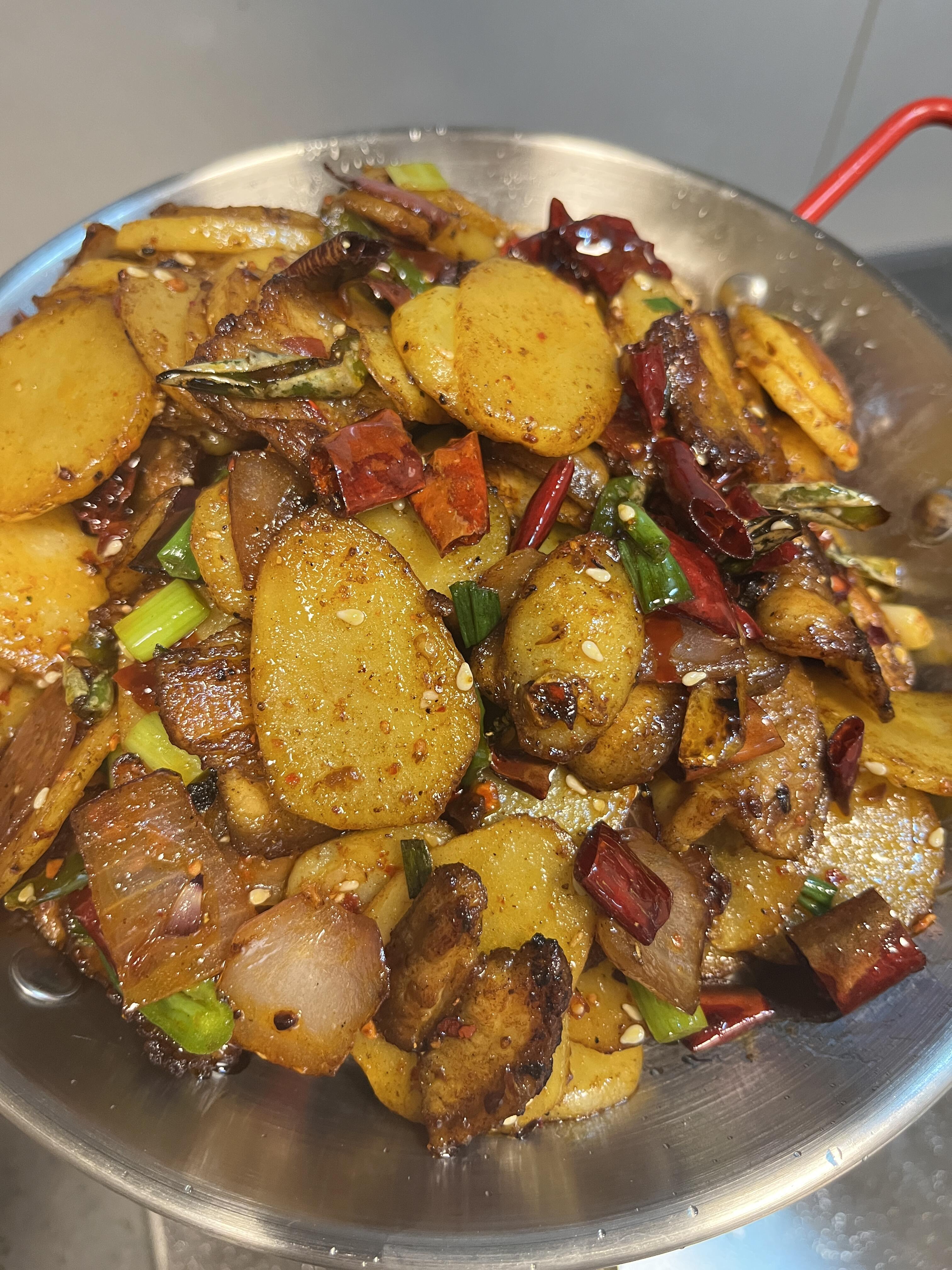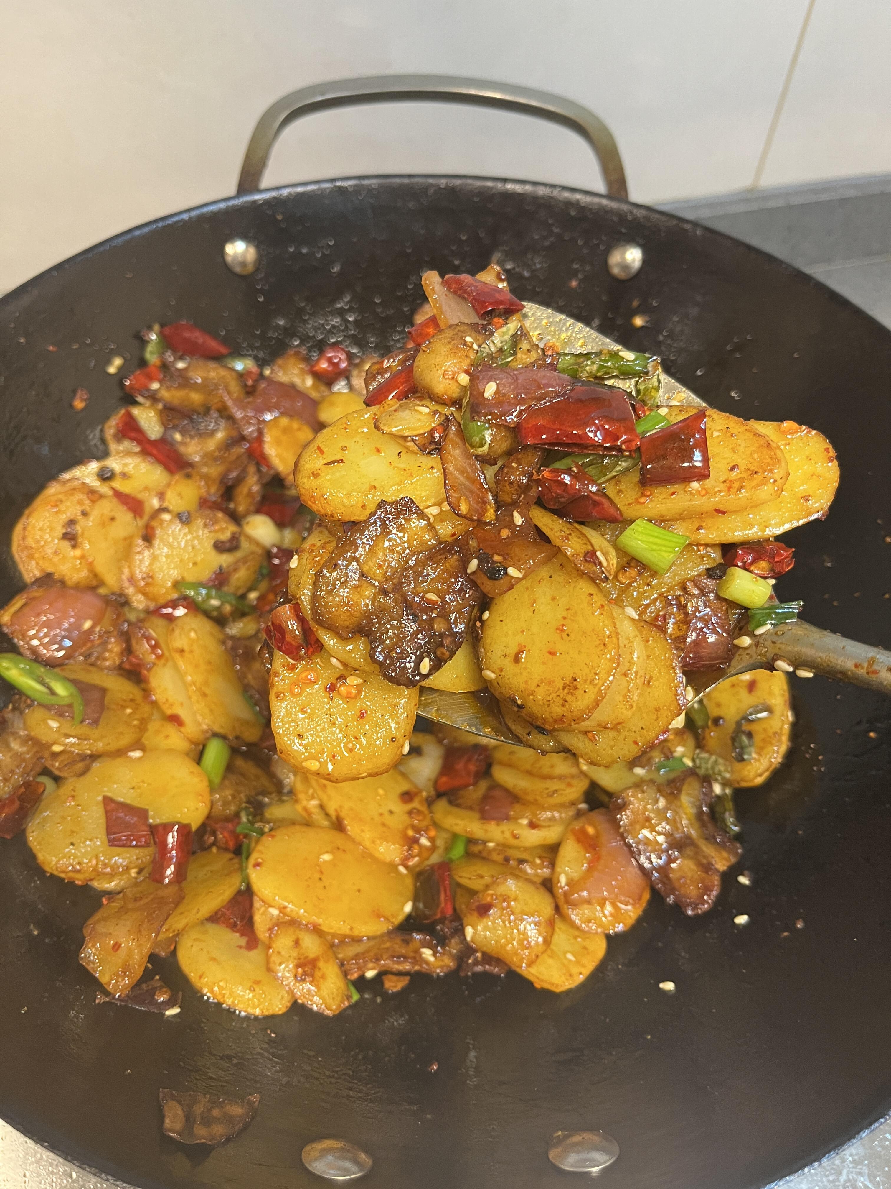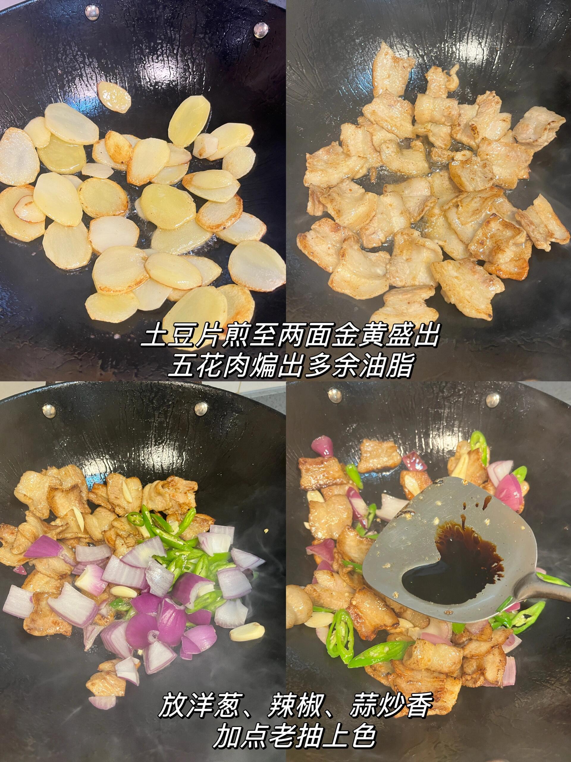 干锅土豆片!!真的香迷糊了~ 真的太太太香了!土豆片煎的金黄酥脆,搭配五花肉,香气四溢~ 做法: 1、土豆片切厚片,油热下土豆片煎至两面金黄盛出 2、少许油,放五花肉煎至两面金黄,放洋葱、蒜、辣椒炒香,放小勺老抽上色 3、放干辣椒和一勺豆瓣酱炒香,加入土豆片翻炒均匀,放辣椒面、花椒面、孜然粉、白芝麻、盐、生抽、鸡精调味即可