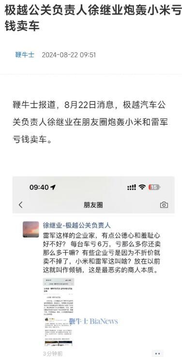 字越少,事越大!雷军发飙,后果很严重! 前有哪吒汽车CEO张勇影射雷总,网友:买小米雷军开车门。哪吒张勇:我90度鞠躬给你开 后有极越公关负责人徐继业:小米和雷军这叫啥,这是最恶劣的商人本质。同时极越CEO夏一平最近还在视频中讲,雷军下赛道就是为了人设。 结果是哪吒张勇不再担任CEO,吒汽车创始人、董事长方运舟兼任公司CEO。 极越CEO夏一平说公司目前正遇到困难,公司需要立即调整,进入创业的2.0阶段。同时极越员工爆料,公司口头通知12月16日前离职n+1,自愿上班没有工资 还没有等雷军出手,他们就倒下了。怪不得那么多人买问界和小米,说白了,目前新能源中,能叫出来名字的,不怕倒闭的还真不多,起码华为和xiaomi不会有这些问题