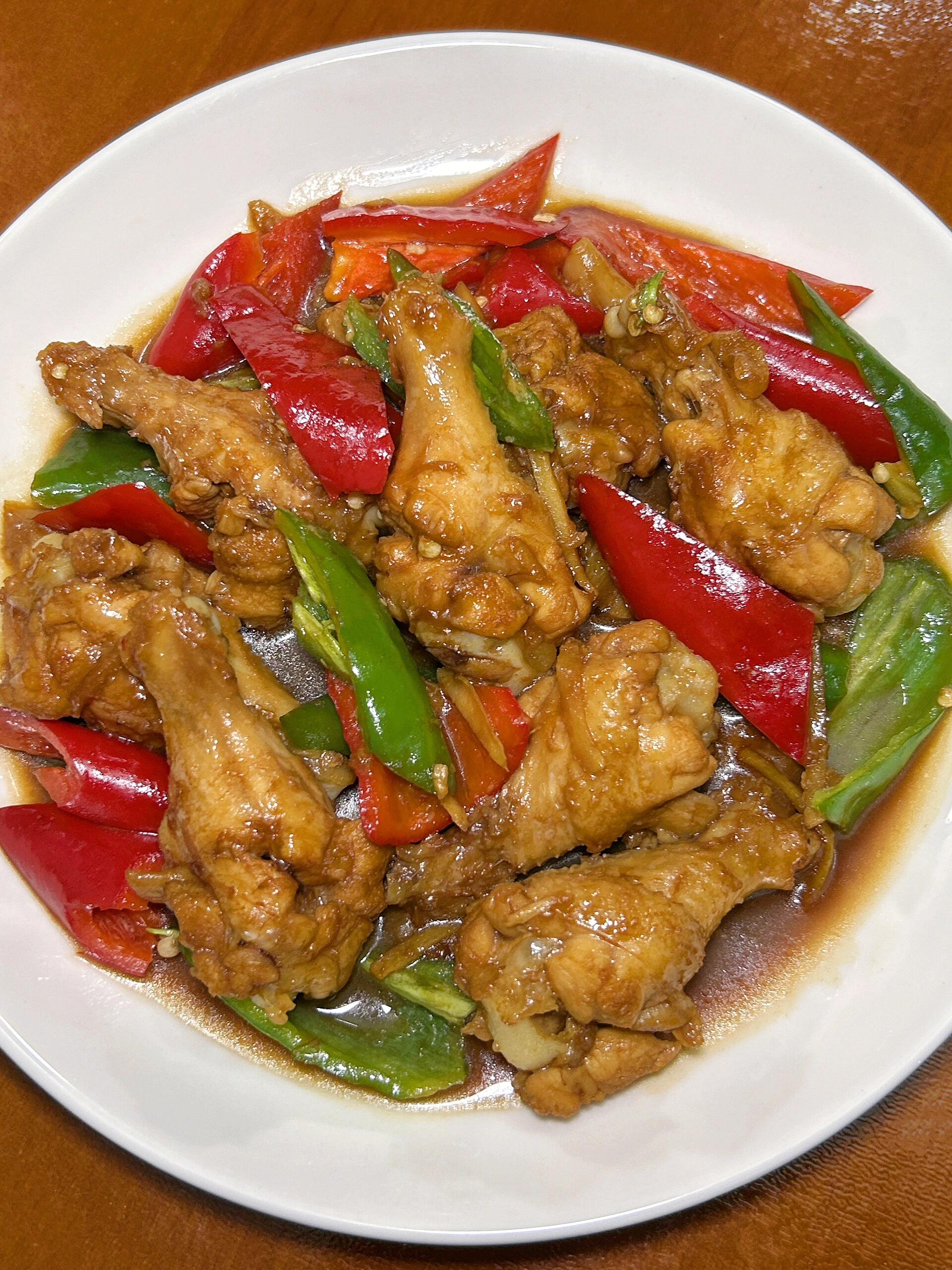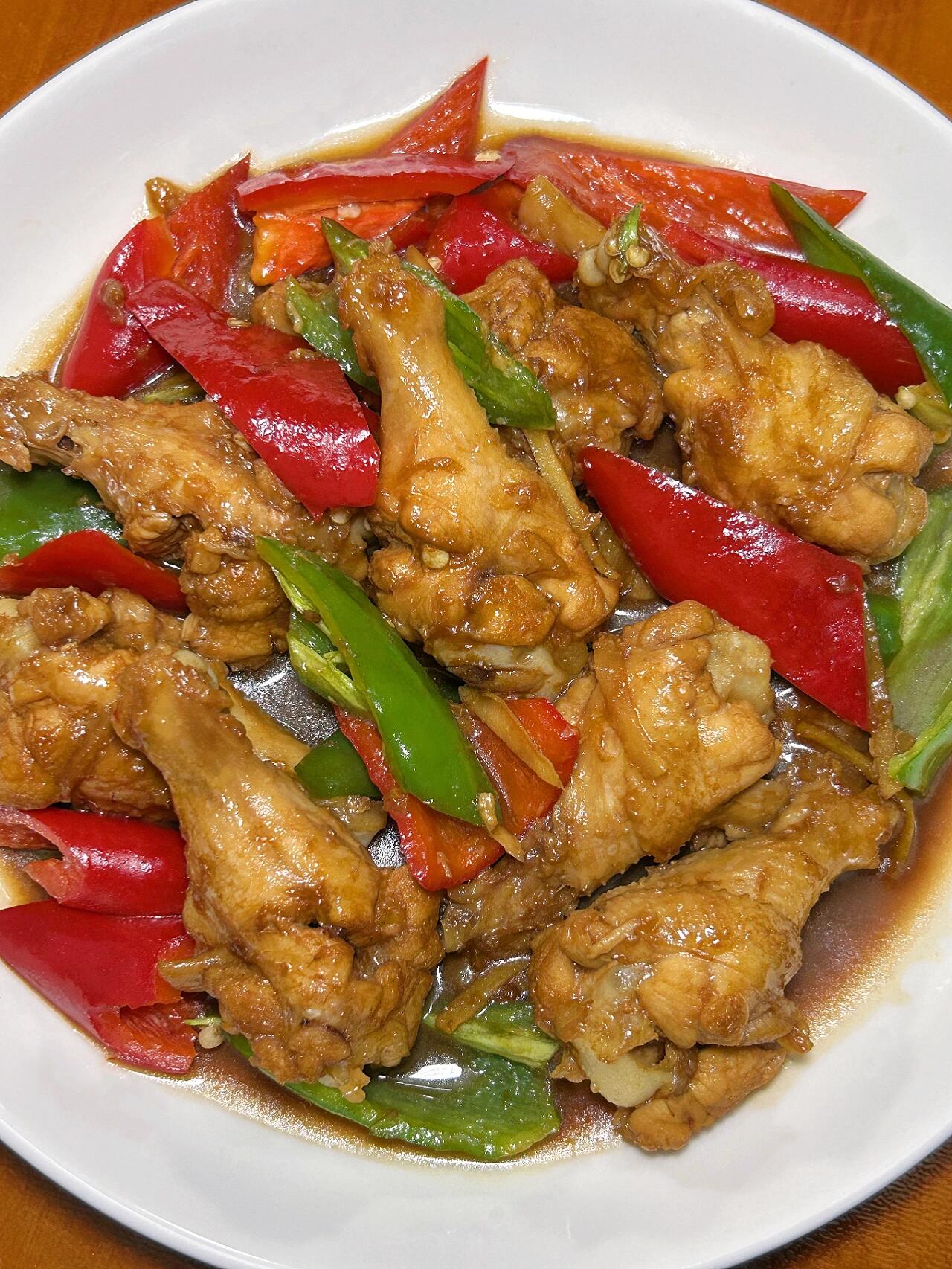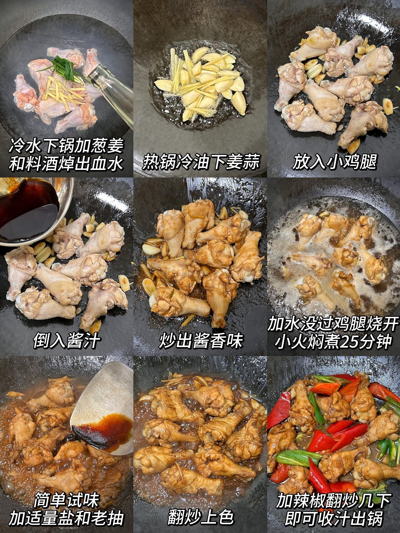 超级简单的红烧鸡腿,一口一个好满足!! 这个红烧鸡腿的做法你们一定要试试!真的巨巨巨好吃,鸡腿肉鲜嫩多汁,香香辣辣好下饭~搭配着米饭,好吃到停不下来,巨香巨过瘾!! 食材【图4】:鸡翅根8只,青红椒各1只,葱姜蒜适量 做法【图5—6】: 1、参考图片先调个酱汁。鸡腿冷水下锅,加葱姜和一圈料酒,焯出血沫后捞出 2、热锅冷油➕姜蒜➕鸡腿➕酱汁,中小火炒出酱香味。加水没过鸡腿烧开,小火焖煮25分钟 3、简单试味,加适量盐和大半勺老抽,翻炒上色。最后加辣椒翻炒几下,即可收汁出锅 家里有小朋友/不喜欢吃辣的,不加辣椒即可,味道同样好吃到爆!!快来试试吧~