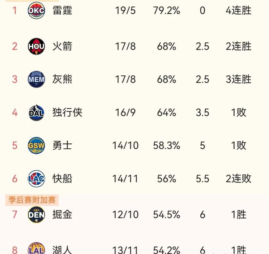 1.西部排名榜第1-8名:目前雷霆战绩19胜5负,领先2个第二名火箭和灰熊2.5个胜场差,分列西部前三甲。上赛季西部冠军独行侠16胜9负,暂居第4名。勇士领先快船0.5个胜场差,占据季后赛区最后2个席位。掘金和湖人胜场差相同,都落后榜首雷霆6个胜场差,徘徊在附加赛区。