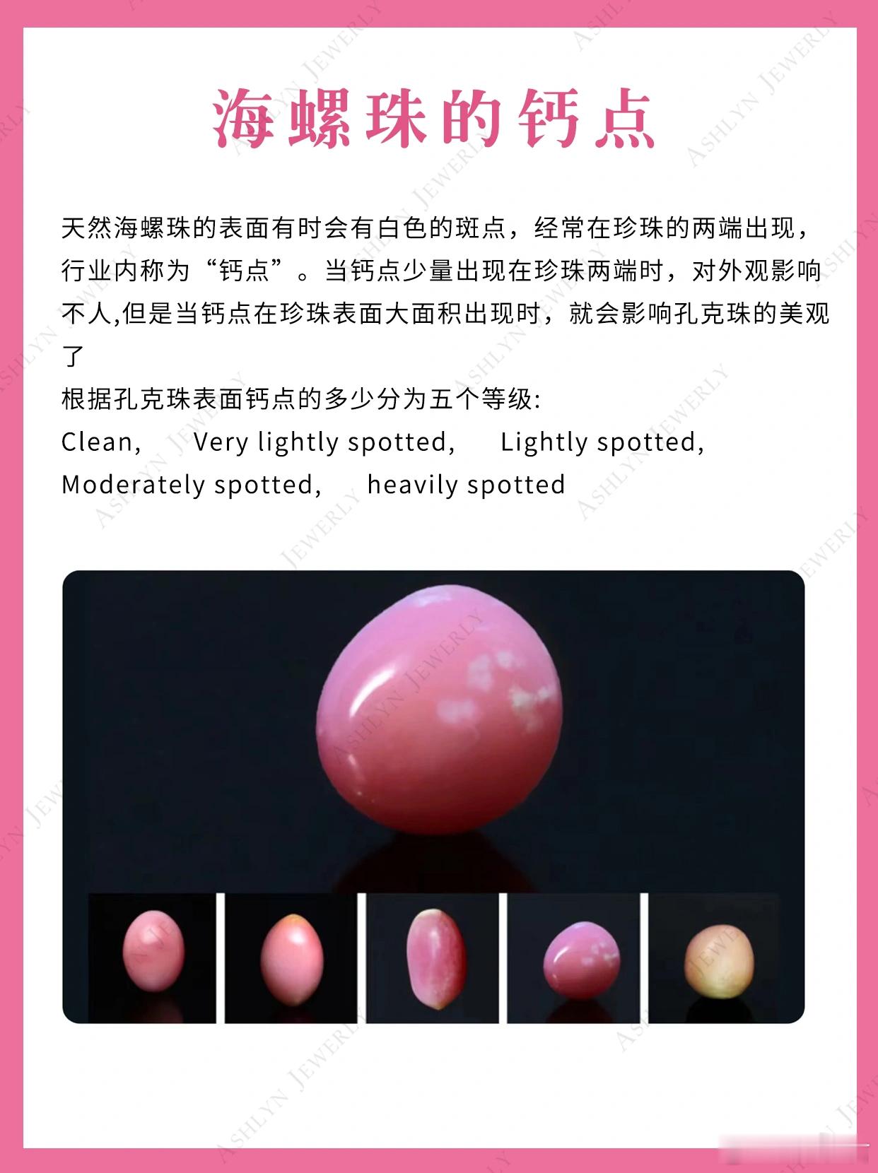 天然孔克珠的表面有时会有白色的斑点,经常在珍珠的两端出现,当钙点少量出现在珍珠网端时,对外观影响不大,但是当钙点在珍珠表面大面积出现时,就会影响孔克珠的美观了。