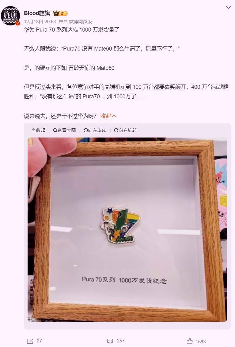 华为销量公布! 太讽刺,余承东都想要骂娘了 台积电和美国以及高通说的没错!谁能想到反转来的这么快,华为直接用个障眼法!华为mate70系列发布以后,各种唱衰销量不如Mate60。还记得不记得这话,在华为P70发布以后也是这样说的。现在相信了吧!华为Pura 70的1000万发货勋章都来了,这还怎么狡辩。台积电和美国以及高通说的没错,因为他们当然希望华为下去,这样就没有竞争了,就是因为华为太有骨气,所以才让他们节节败退 台积电到死都想不明白,为何国内能做出来近似于5nm工艺的处理器。而美国到现在还没有弄清楚,断供华为之后,华为是自己活下来的。而且现在又拿着自研的麒麟处理器和自研系统,加上全部国产化的Mate70回归了 关键是之前唱衰的谣言直接用加单来辟谣了。说句实话华为现在实现了国产,对于的台积电的影响可不小。假设说华为把麒麟9020处理器下放中端,nova系列就会出圈。再来个赛道走性价比路线的机型代替之前的荣耀。华为的回归指日可待,销量上去了。其他家销量就会下降,高通的销量会下降,台积电营收也会下降,这可是一连串的反应 其实你看看19年华为2.4亿销量时候就知道了,当时高通的利润是44亿美金,2020年华为断供后,2021年高通利润同比增长55%,净利润为98.11亿美元。增加了两倍 怎么说呢!华为Mate60系列销量是1400万,P系列销量一般都是比Mate稍微低一些,所以1000万也算是正常了。但是到了Mate70系列之后,把订单量增加了300万台。现在光预定出货量就有1700万台,工厂都干冒烟了,线下还是没货。你跟我说销量差,唱衰华为。这不就是自欺欺人吗! 扪心自问!麒麟9020不是无敌,你要是喜欢游戏选骁龙8Elite没啥问题,但是嘴下留情啊!何必对一个自研的企业如此刻薄呢!华为的系统和处理器,自研这是事实吧!美国不就是害怕华为的研发能力,所以才断供制裁,华为现在起来了,我们不应该高兴吗,给华为加油吗