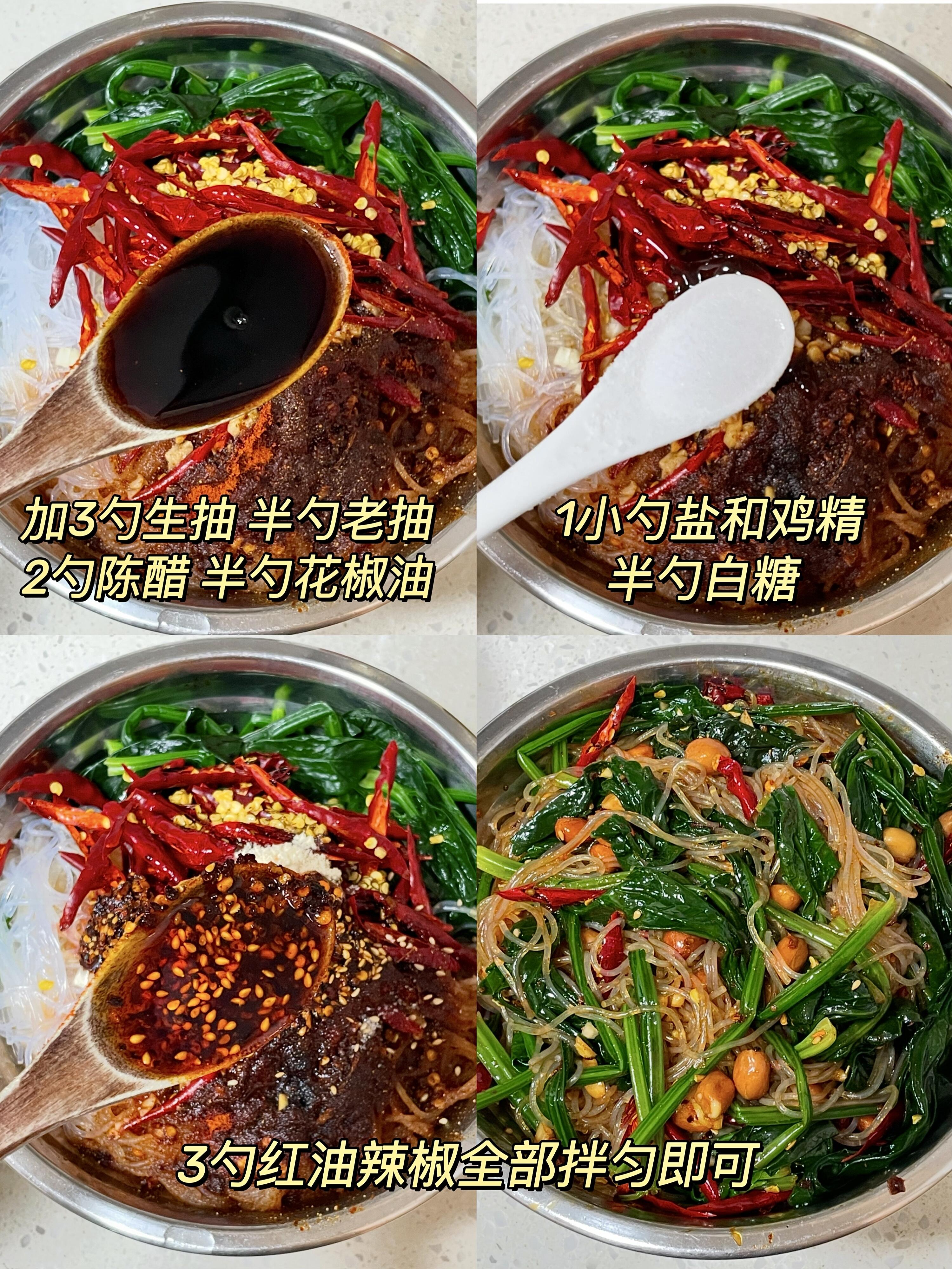 一次成功的的菠菜粉丝拌花生米!!! 菠菜和粉丝的凉拌菜组合真的好搭!! 再配上脆香的花生米 香香辣辣裹满了酱汁!!太好吃了 - 食材:菠菜,粉丝,花生米,蒜末,辣椒粉,干辣椒,生抽,老抽,陈醋,花椒油,盐,鸡精,白糖,辣椒油 做法在图片上