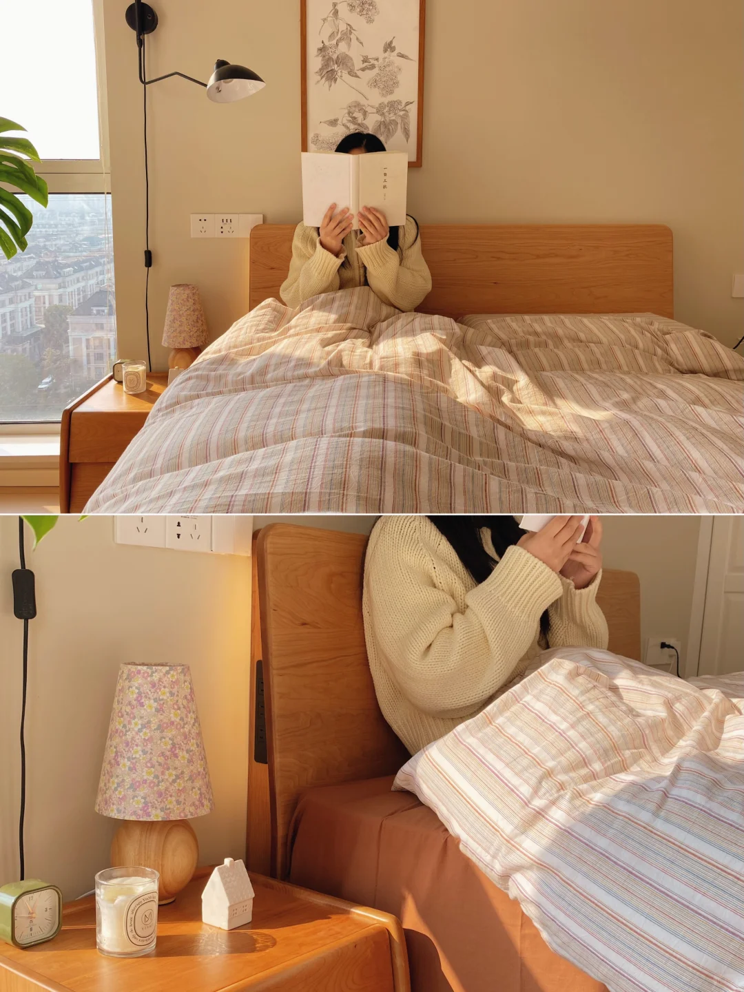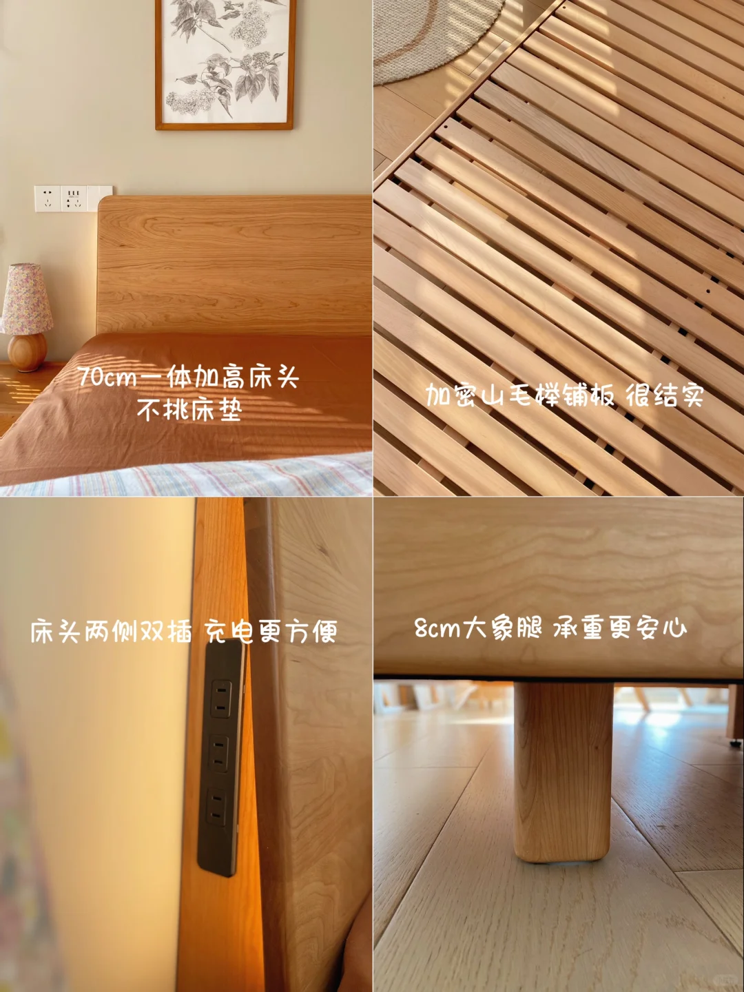 🪟樱桃木的主材纹理细腻舒适,淡淡的木香有着来自森林深处的气息,床头拼板是加高过的,摸着光滑温润,和墙壁严丝合缝,靠着也很有安全感。