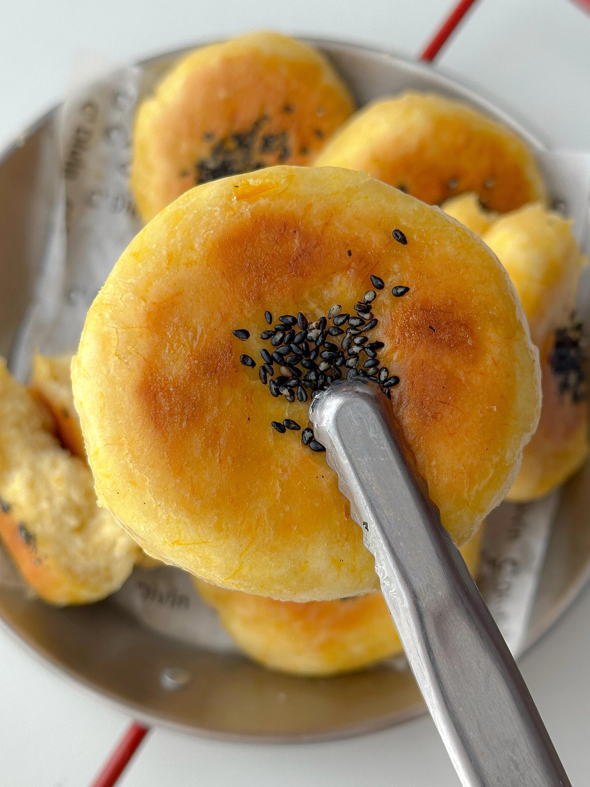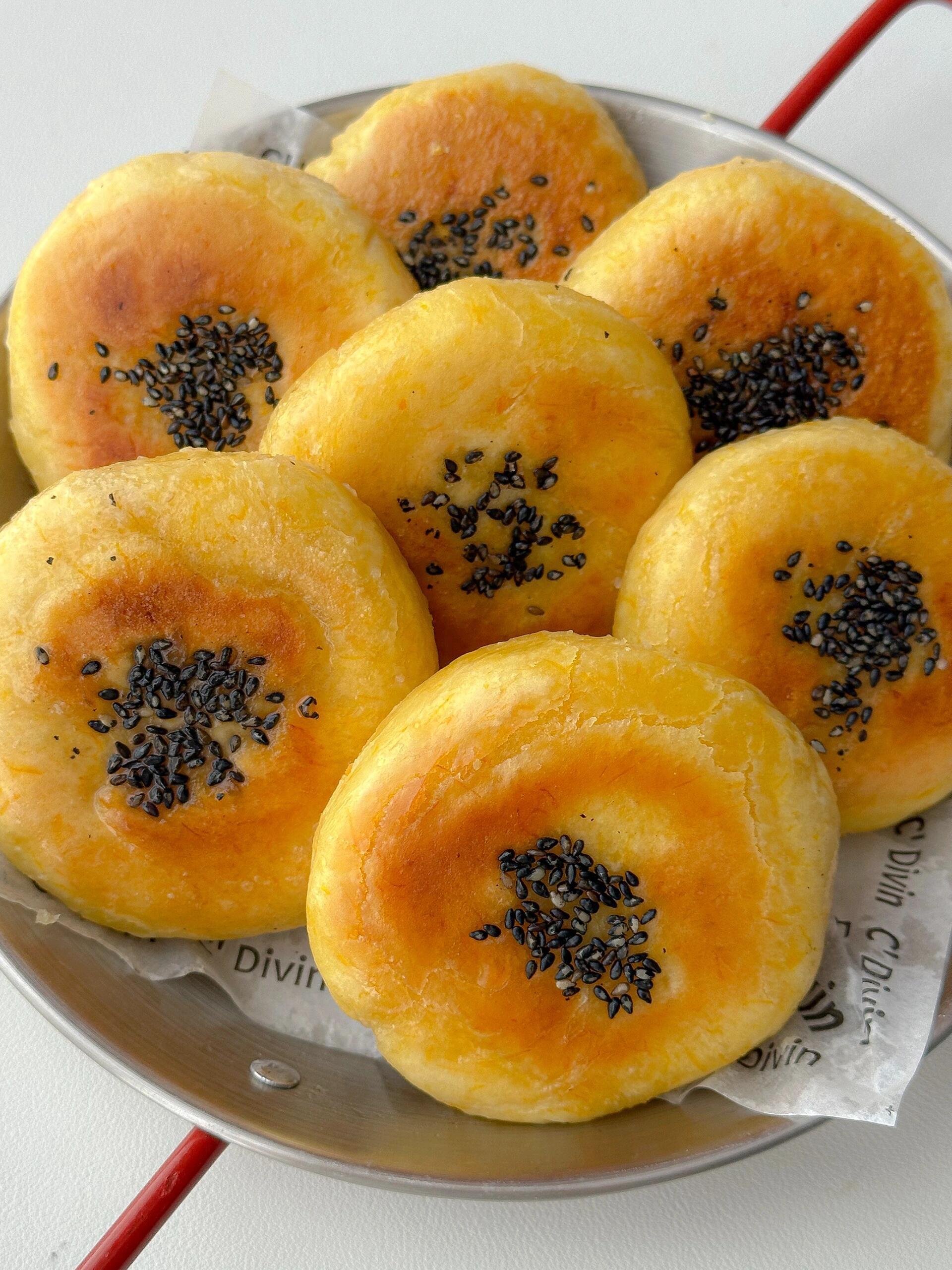 做法:面粉、酵母、白糖、熟南瓜泥搅拌成絮状,揉成面团,盖保鲜膜发酵至两倍大,发酵后的面团排气分成八份,每份剂子搓圆按压成小饼,中间刷水撒上黑芝麻,醒发10分钟后,锅里加油放入饼,小火煎至两面金黄,最后锅里加些水盖盖子焖至水份收干,再烙至酥脆