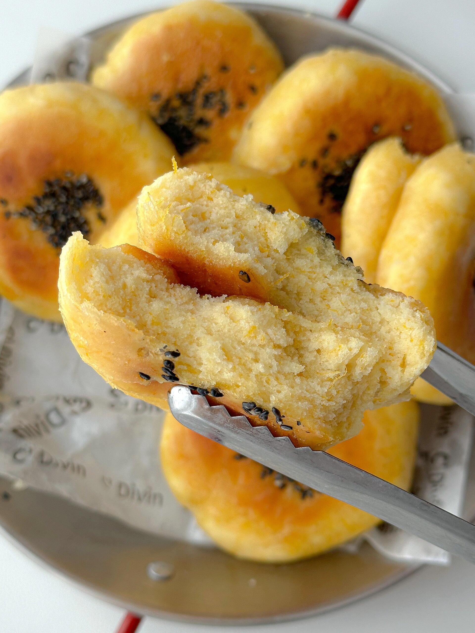 食材:面粉300g、酵母3g、白糖15g、南瓜泥210g、黑芝麻