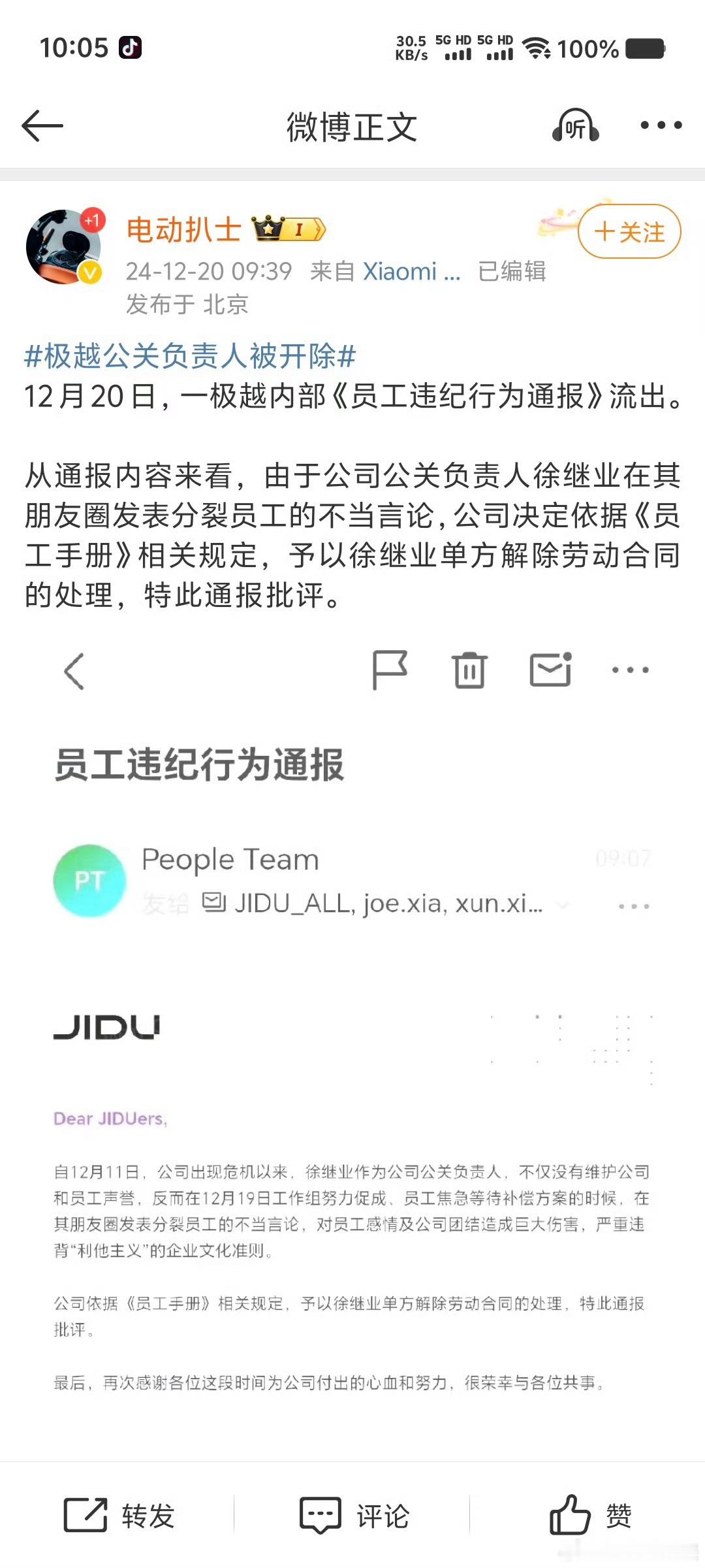 极越公关负责人被开除自己被优化了吧?还当舔狗,攻击自己曾经的同事,这下好了吧!