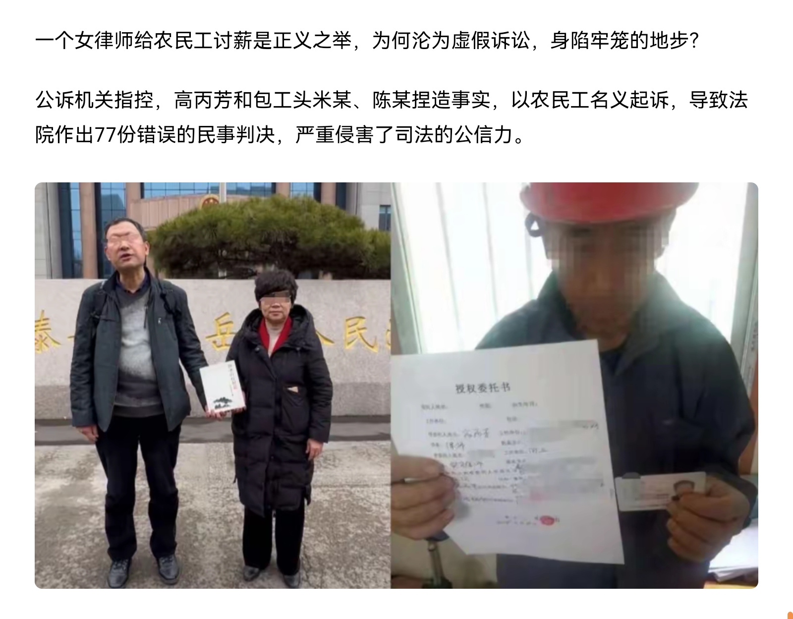 第四,法院作出77个判决。事实上农民工已经拿到工资,这些官司都是假的,这就是虚假诉讼,浪费司法资源。