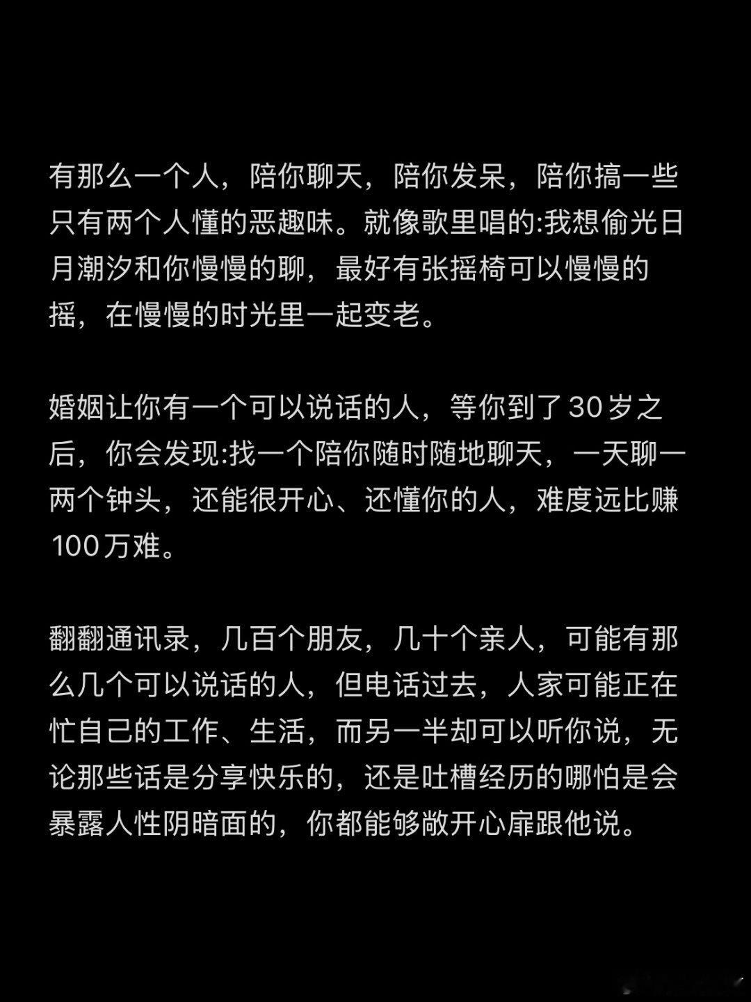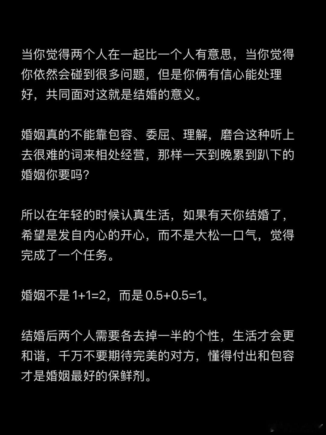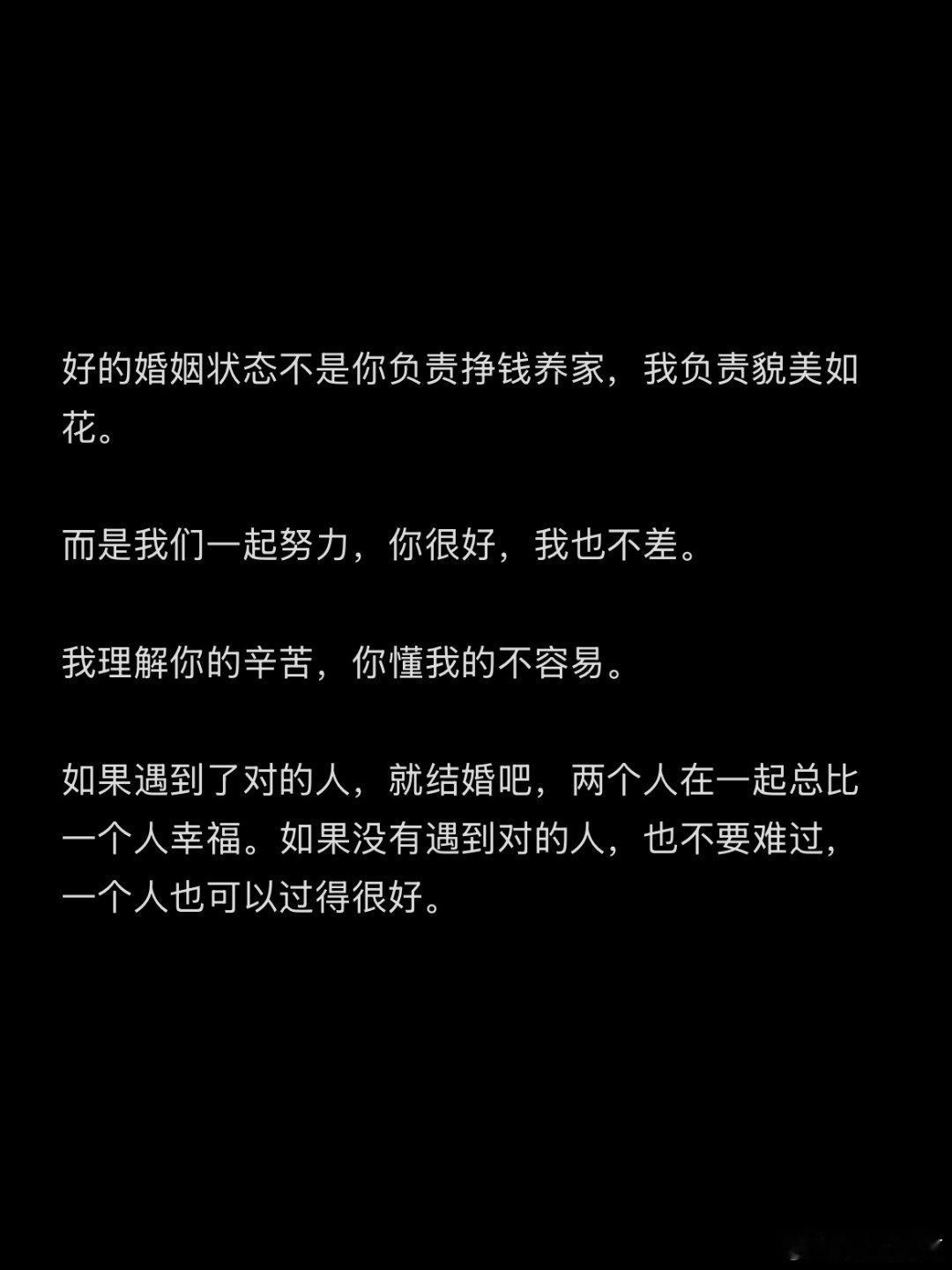 如果遇到了对的人,就结婚吧,两个人在一起总比一个人幸福。如果没有遇到对的人,也不要难过,一个人也可以过得很好。