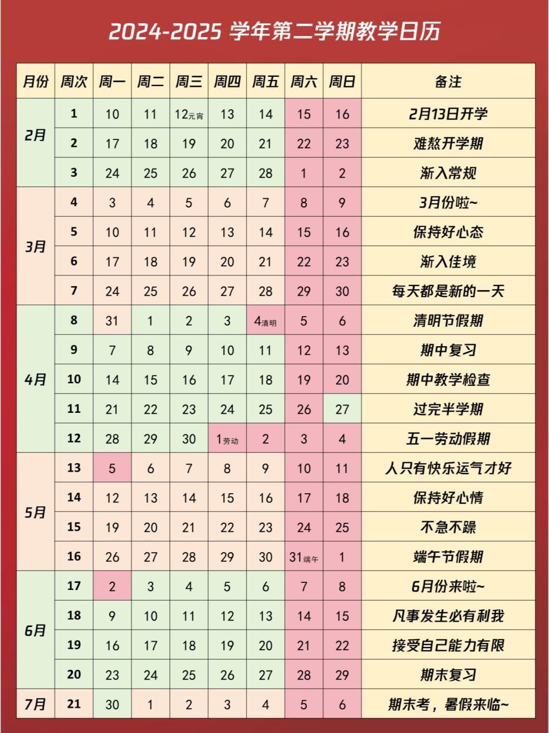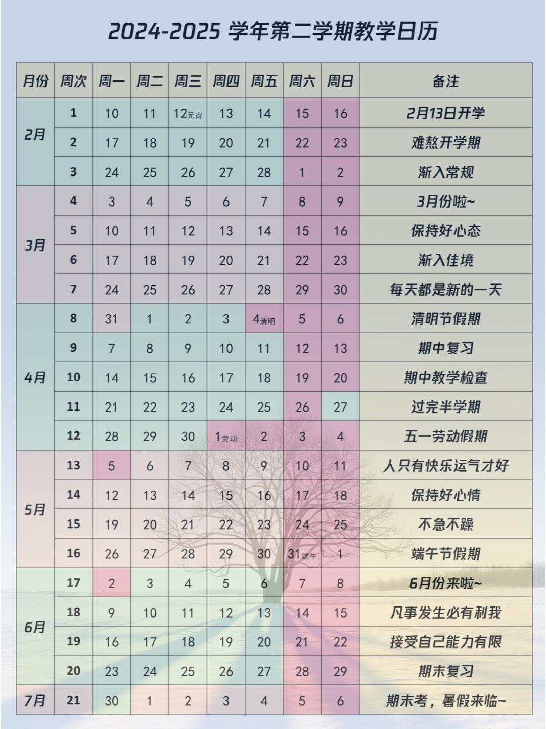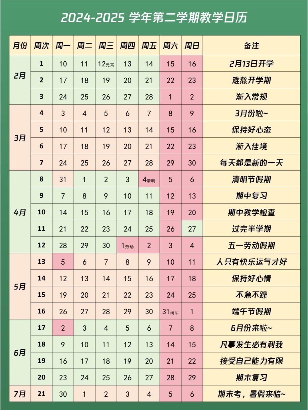 新学期续命表~~~~新学期续命表~2025年春季义务教务工作校历|||2024-2025学年第二学期 ⏰ 开学时间 2025年2月13日 ⏰ 暑假开始时间 小学、初中:2025年7月7日