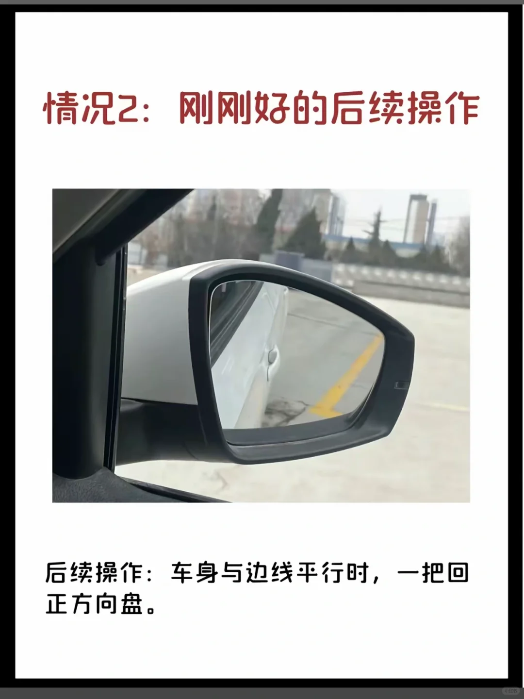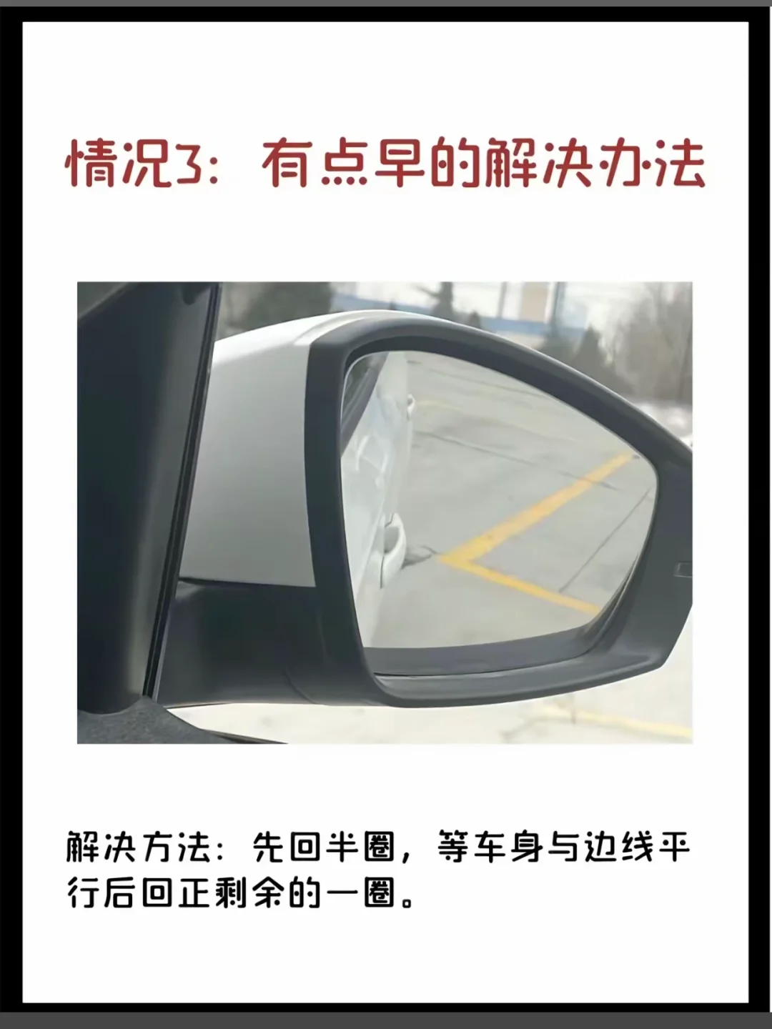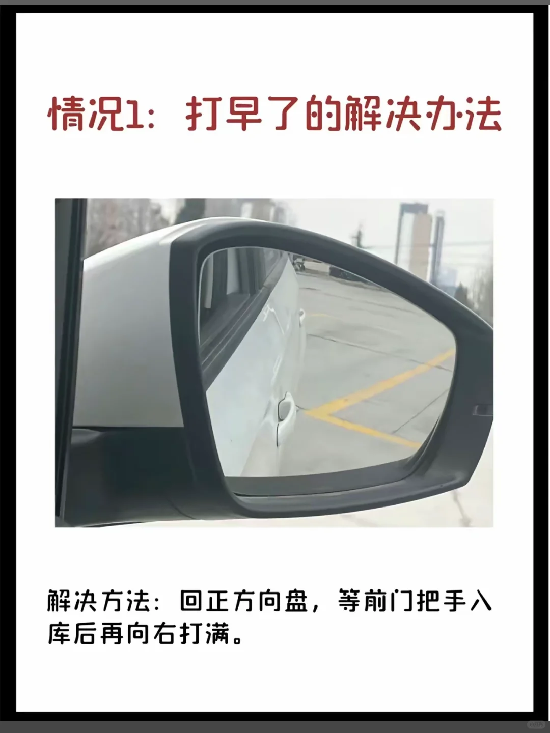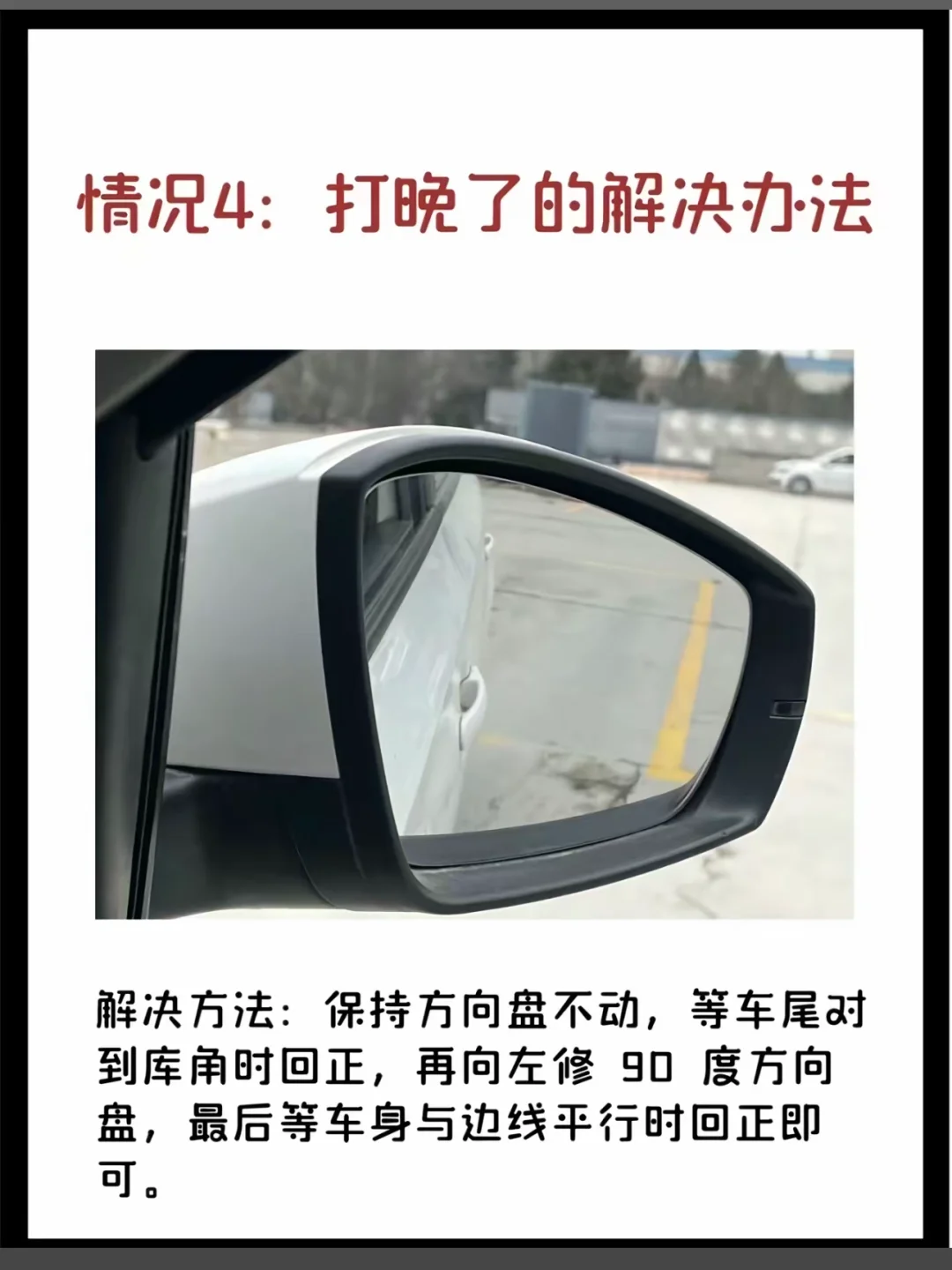 情况1:打早了 前门把手与库角距离 30公分,前门把手未入库,车身斜度大,车尾对着侧边线。 情况2:刚刚好 前门把手刚好入库,与库甬距离 30 公分,车身斜度小。 情况3:有点早前门把手进库一半,与库甬距离 30 公分,车身斜度小,车尾对着库角。 情况4:打晚了 右倒库右边很宽,前门把手盖住最后一条虚线且已经入库。