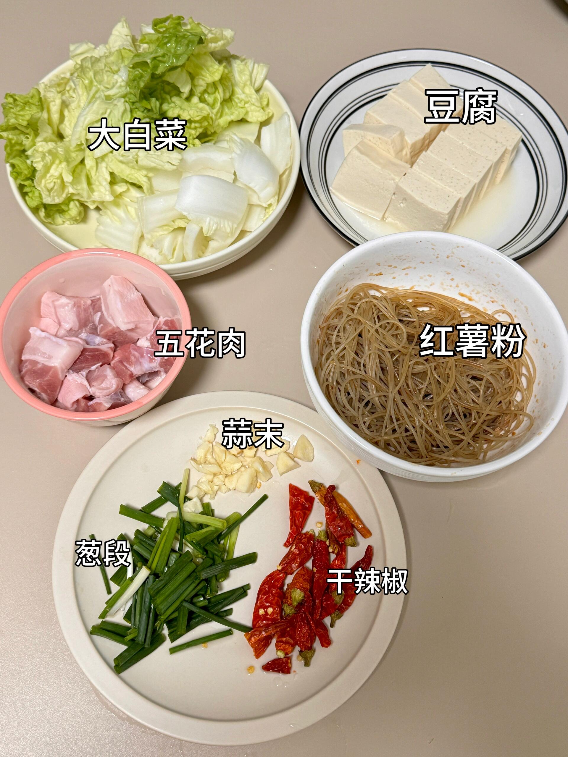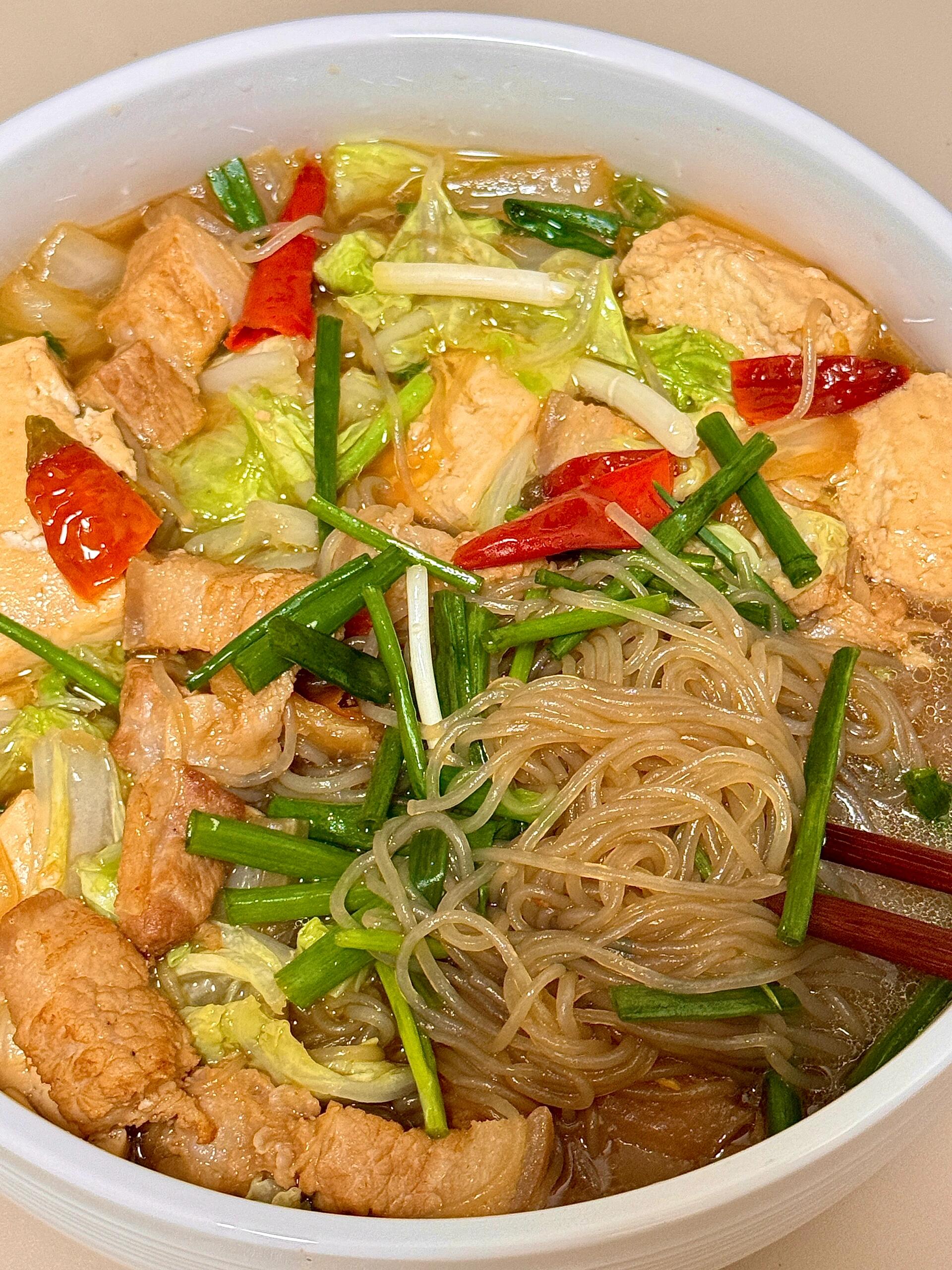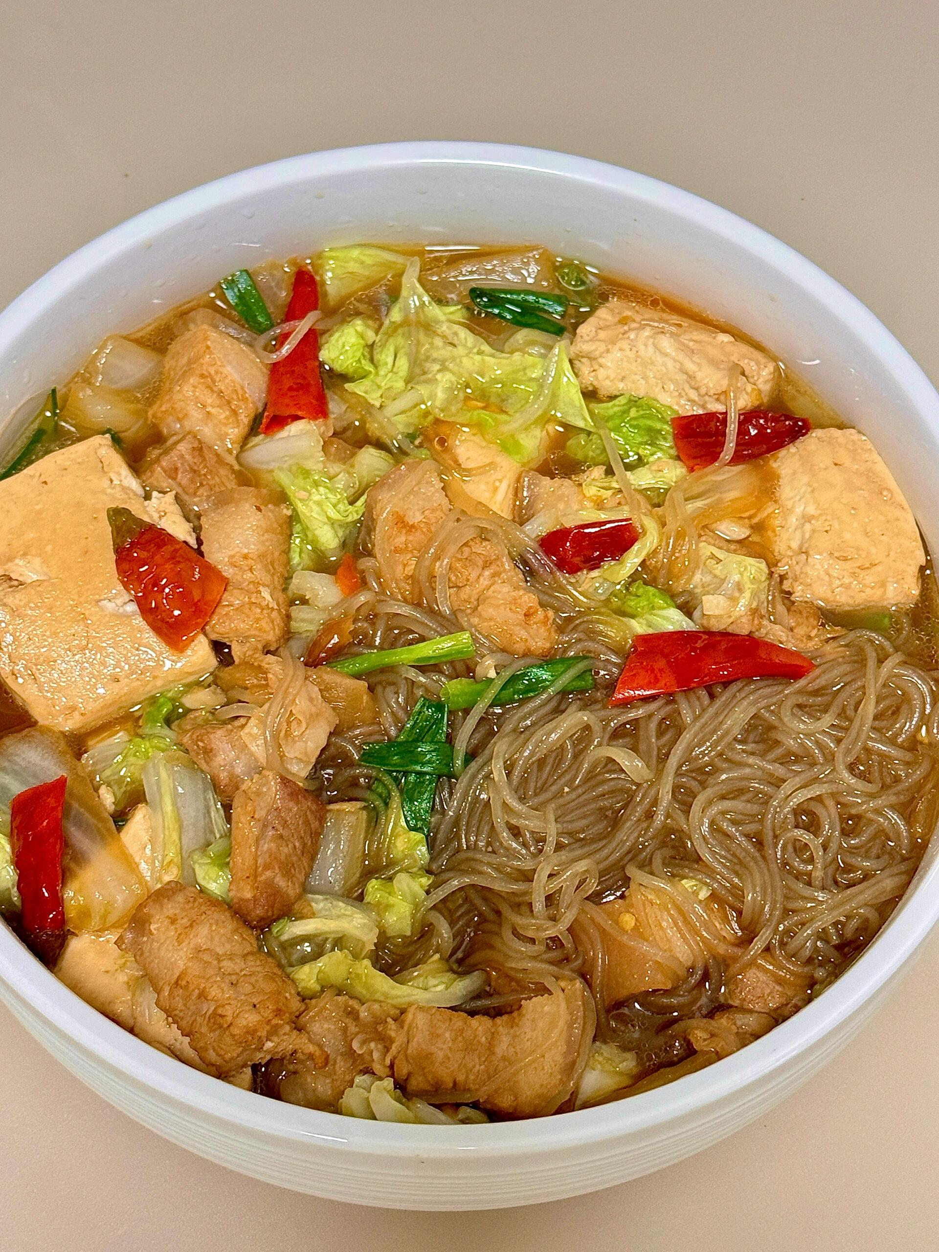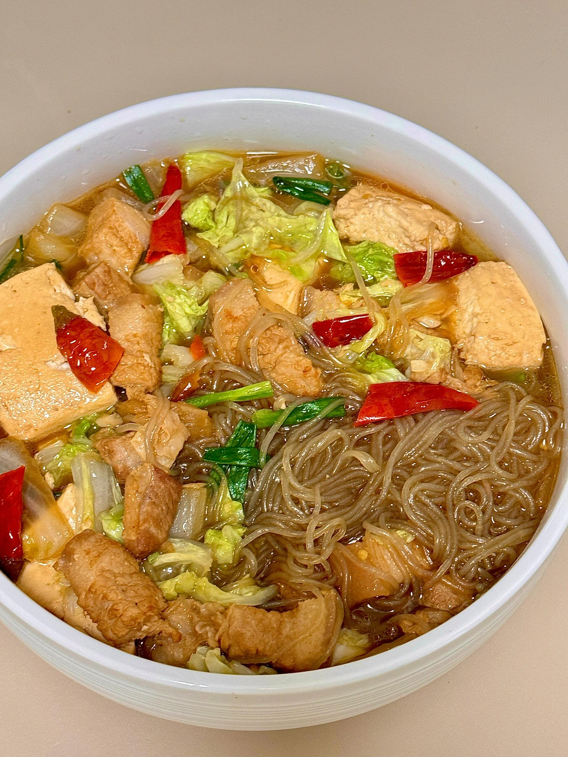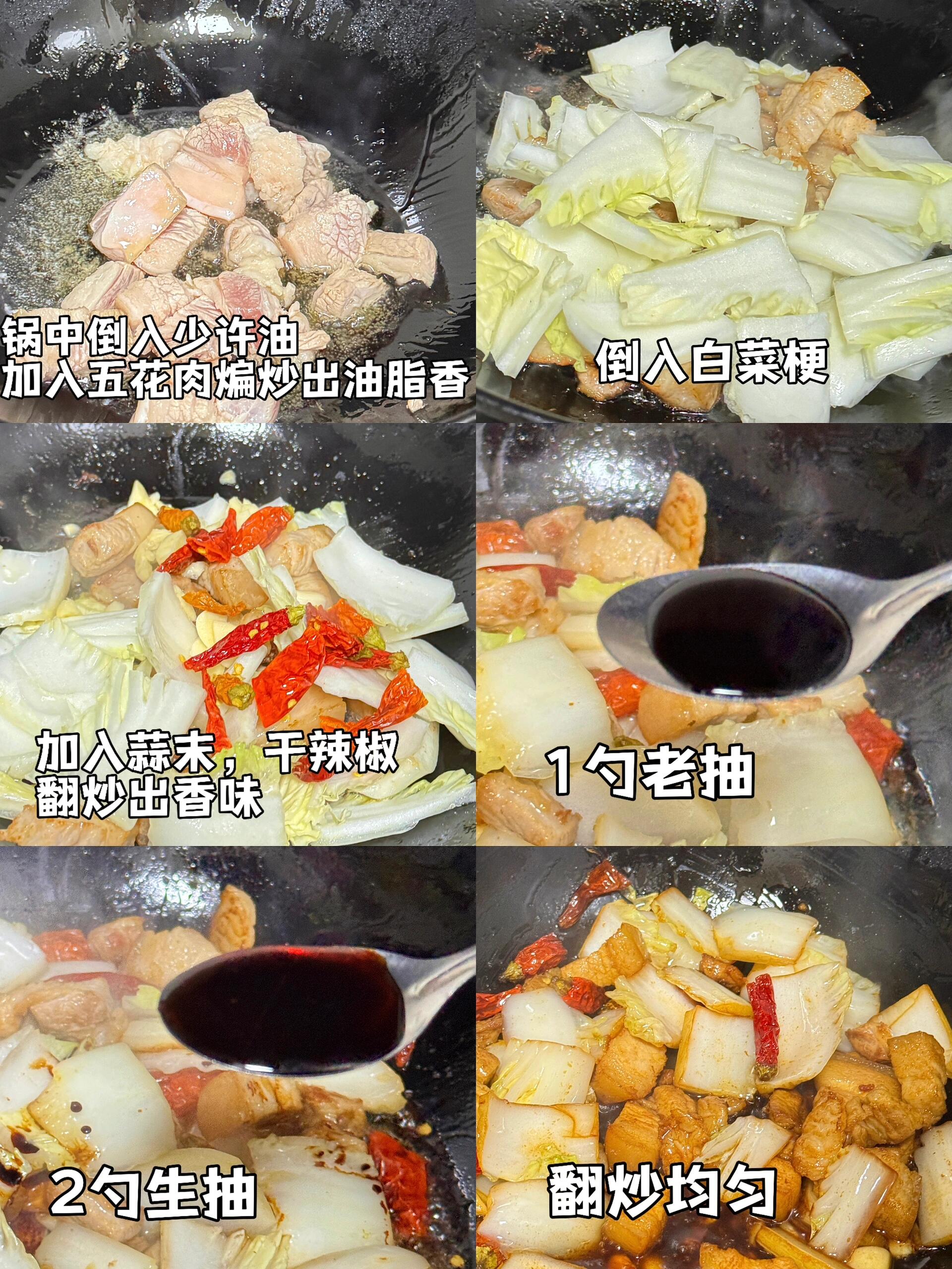 一吃一个不吱声的五花肉白菜炖粉条 一到冬天就喜欢吃各种热乎乎的菜,东北人的快乐俺今天也是GET到啦~~~ 食材:五花肉,豆腐,大白菜,红薯粉,蒜末,干辣椒,葱段 做法:1.锅中加入少许食用油,将五花肉煸炒出油脂香 2.倒入白菜梗,加入蒜末、干辣椒翻炒;1勺老抽、2勺生抽翻炒至断生 3.加适量温水,1-2小勺食盐,加豆腐块焖煮5-8分钟 4.加入泡好的粉丝,再煮3分钟 5.倒入白菜叶,最后煮3分钟,撒上葱段,即可出锅