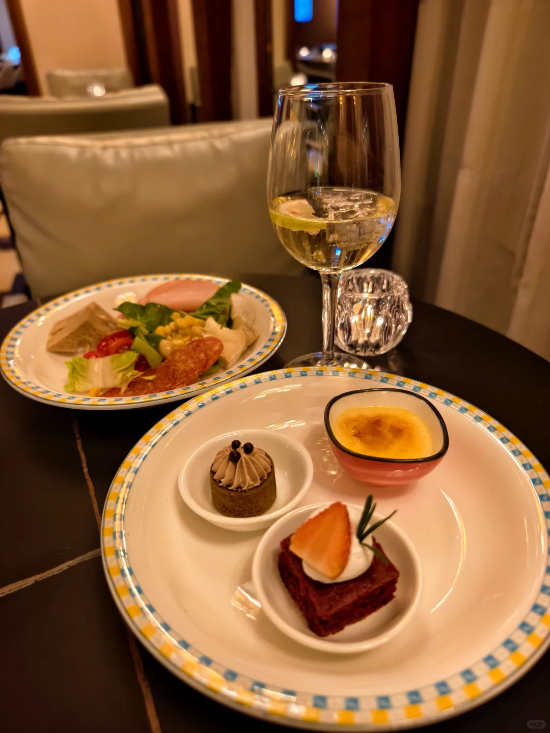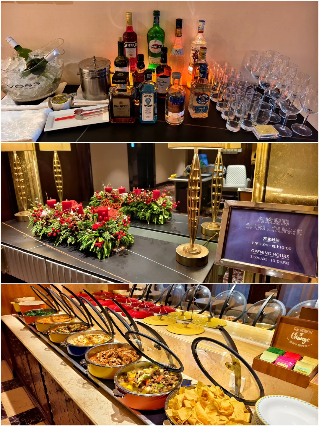 行政酒廊位于26楼,欢乐时光提供的菜品还算不错,有多个热菜,圣诞造型的蛋糕很应景。(P10~P12)。
