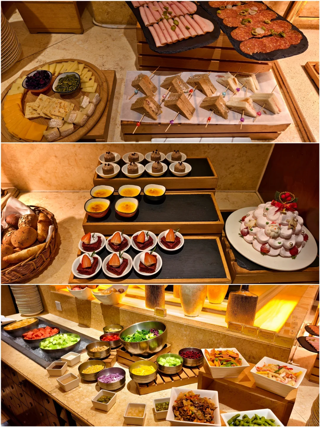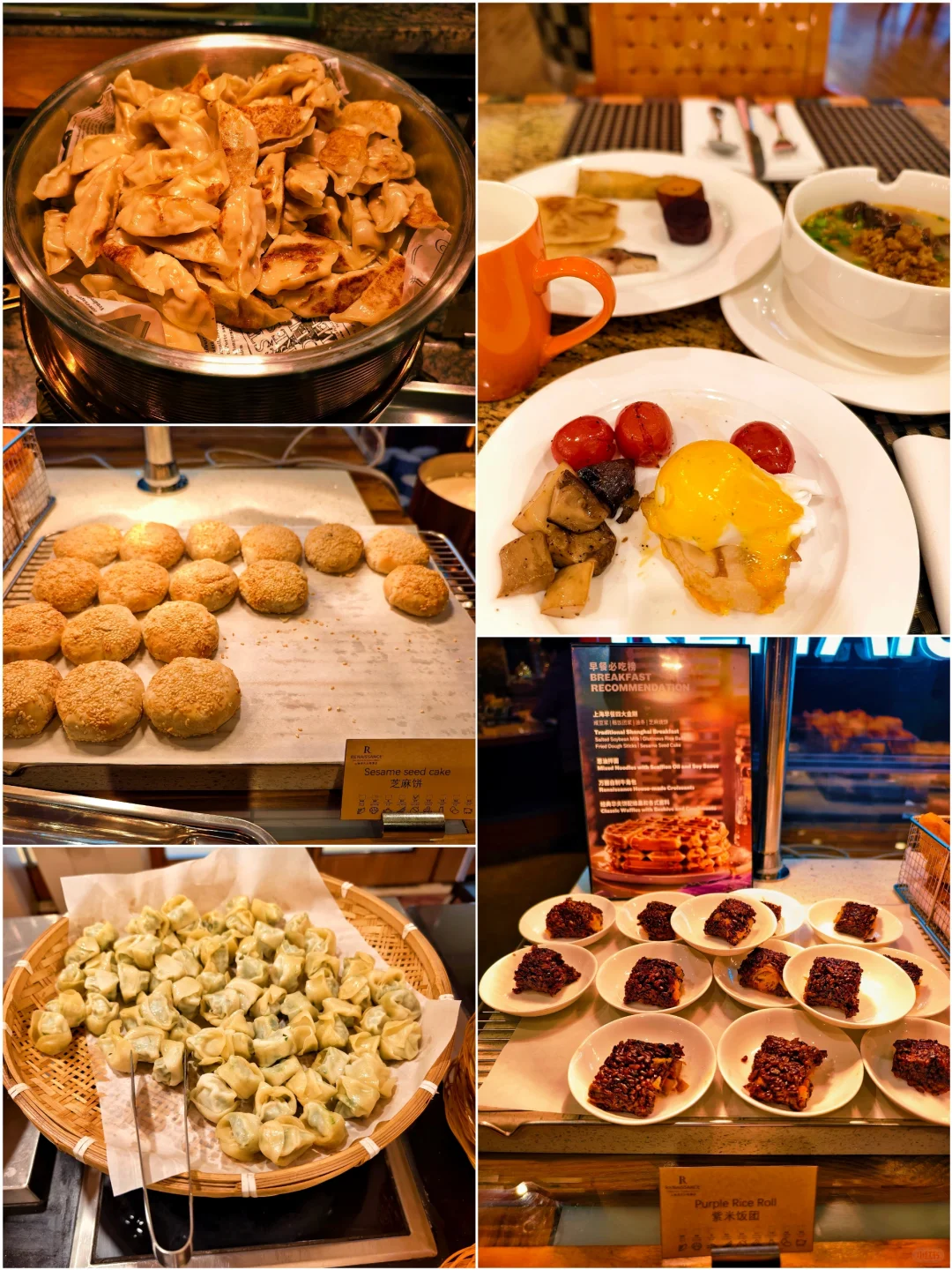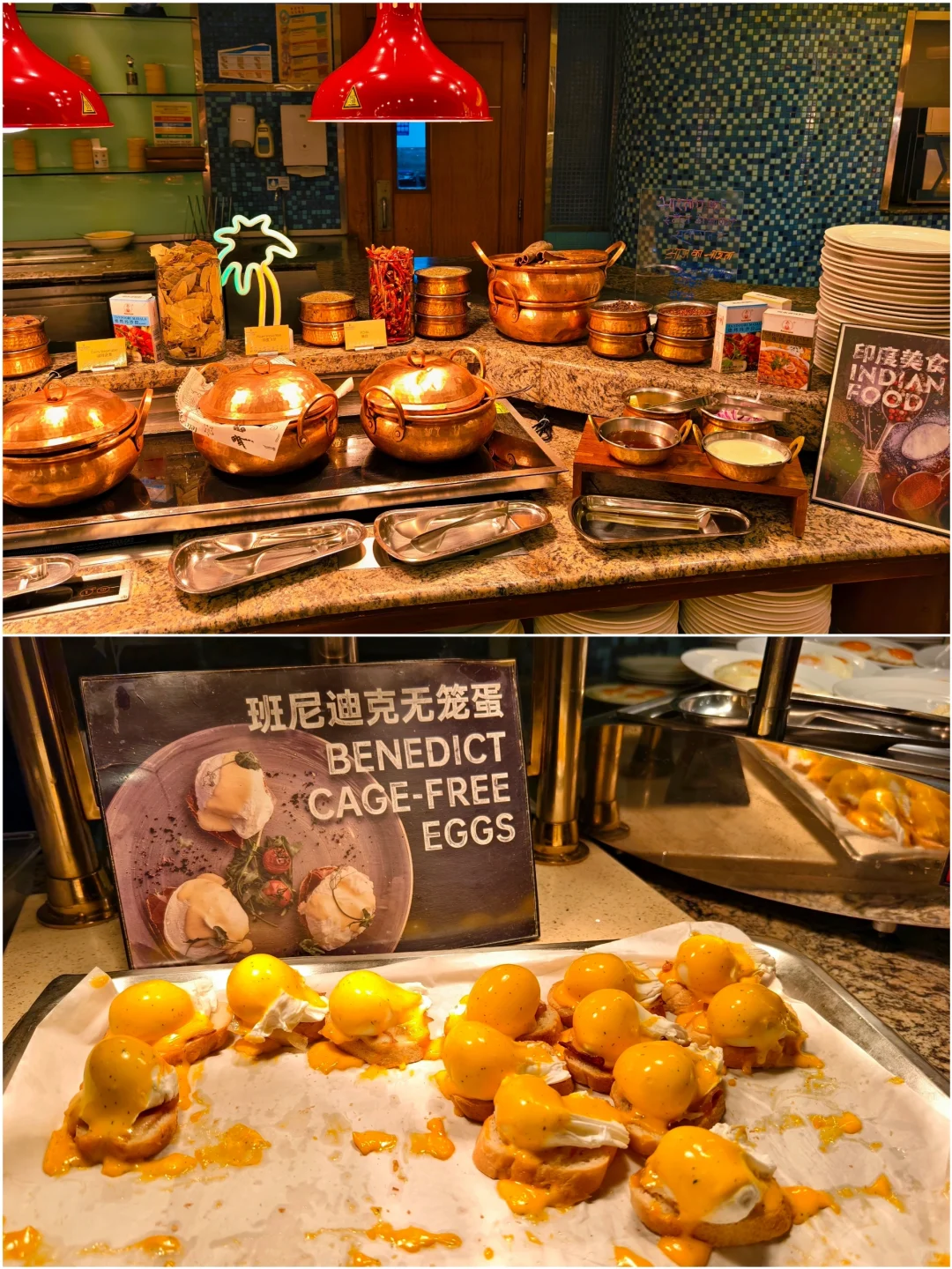 早餐位于二楼万丽咖啡厅,中西种类都很丰富,有班尼迪克蛋,还有紫米饭团、芝麻饼、春卷、馄饨等中式点心,居然还有印度美食。 (P13~P15)。