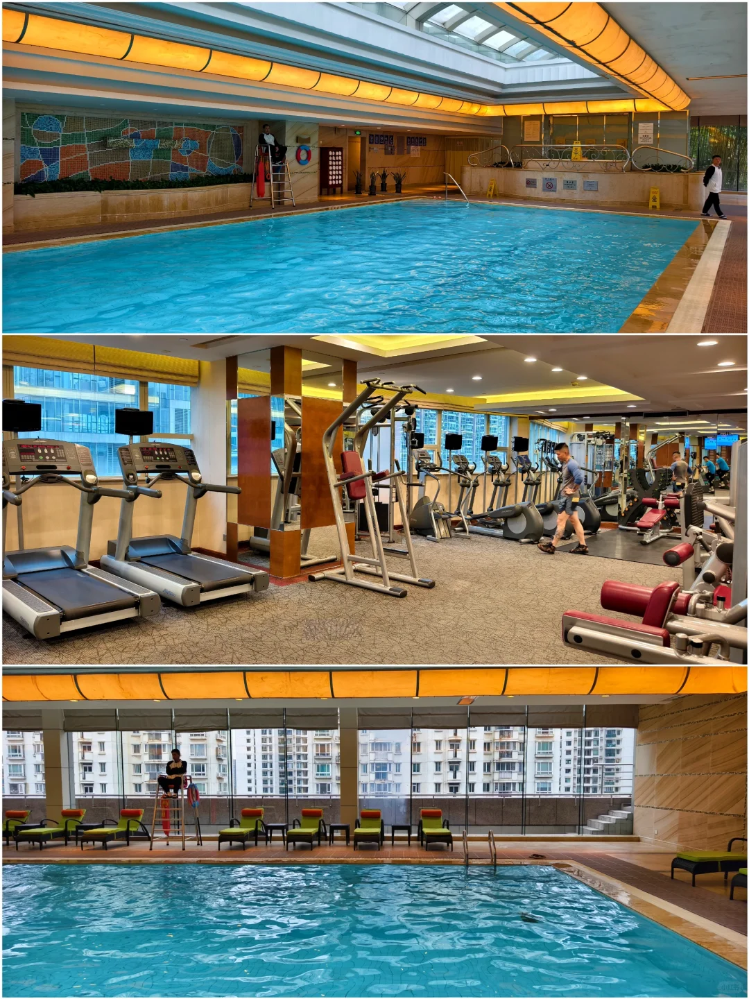 健身房和泳池都位于6楼,游泳池常年配备2到3名救生员,泳池外还有个屋顶花园。(P16)。