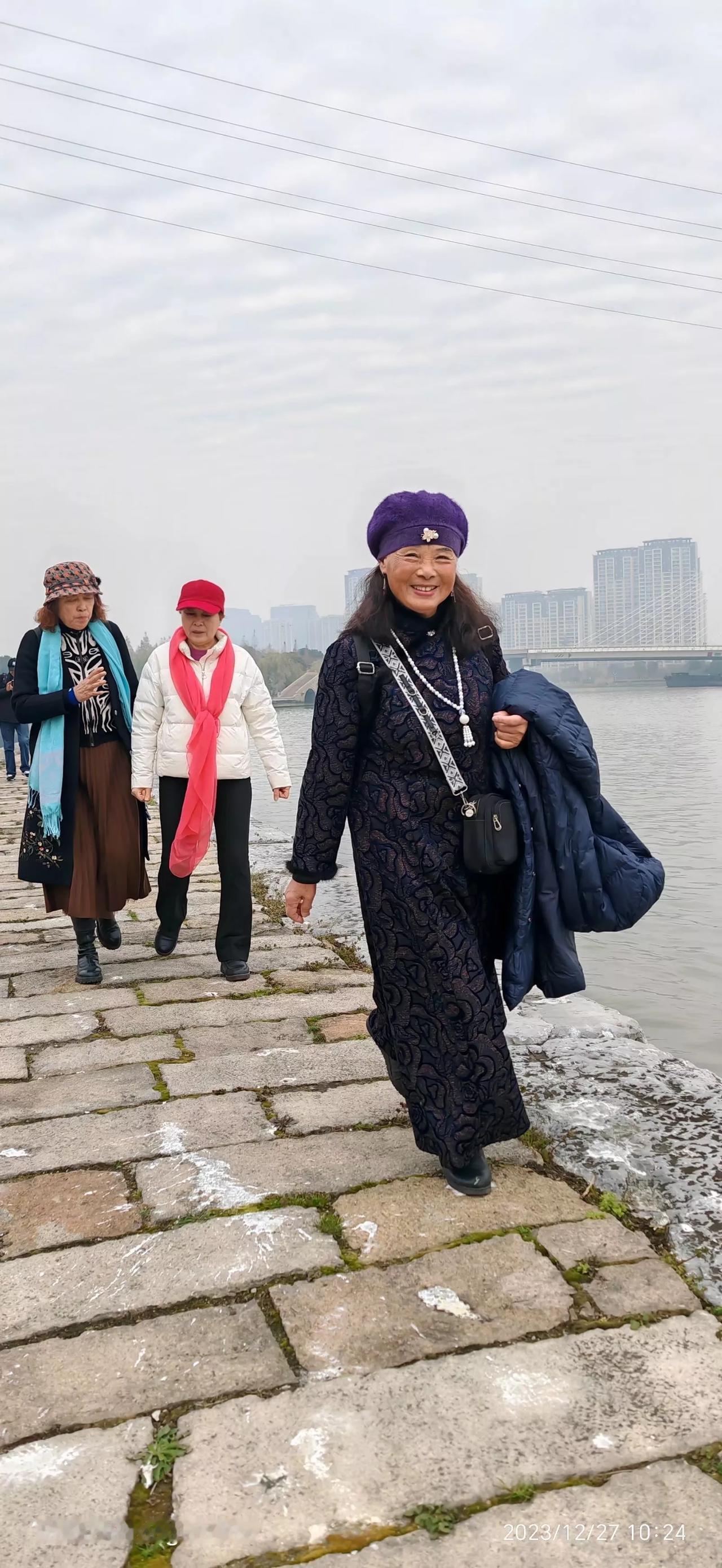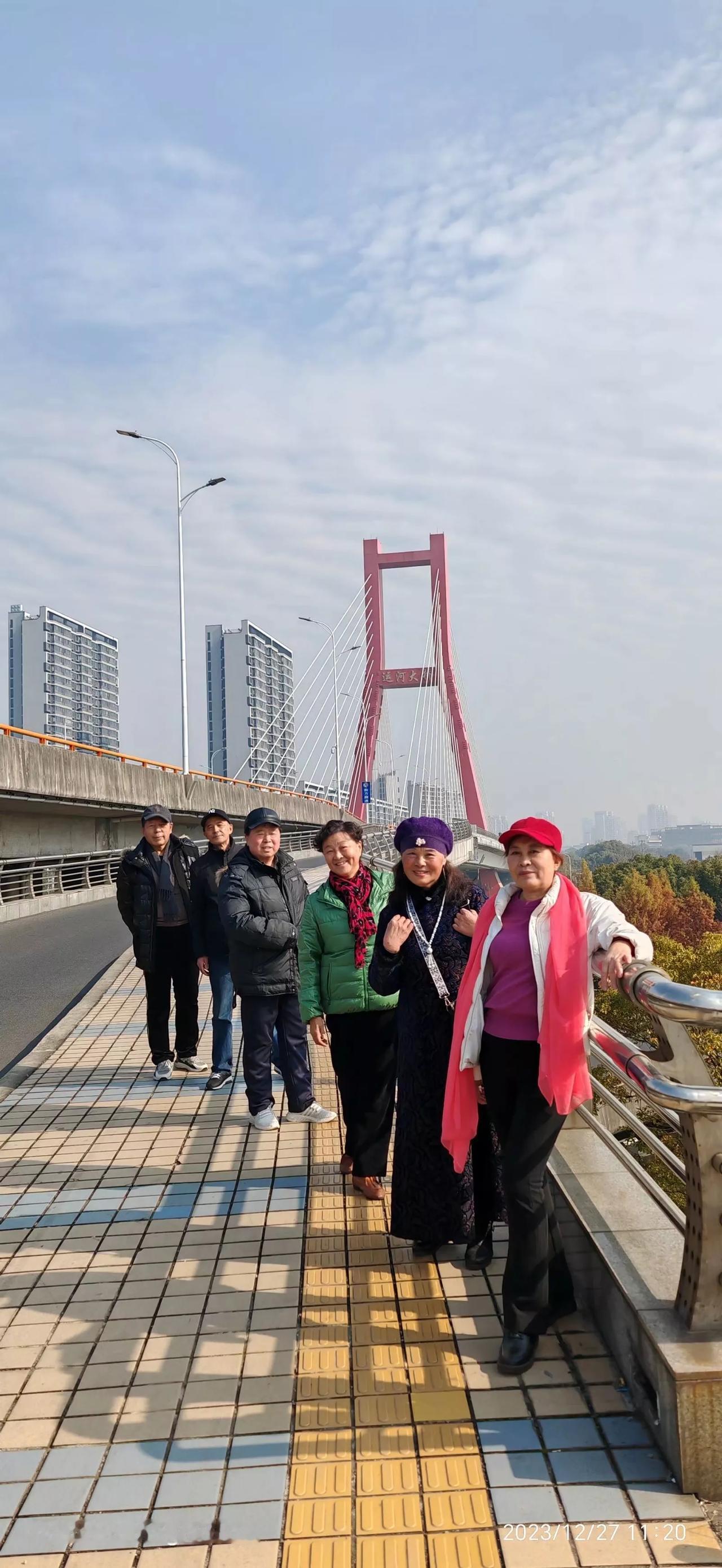 从苏州石湖东路乘坐地铁四号线住同里方向,到吴江汽车站地铁站四号东北口出去,走过一条大马路就到达大运河纤道公园。 远远望去运河大桥的标志牌高高矗立,沿着运河两边都可以步行游玩。 我们即兴走走看看跳跳,见有人在唱歌我们也凑个热闹唱唱。 虽然我们都年龄大了,保持乐观的心态欢度晚年生活,年龄会大,人会老去,努力保持年轻的心态,这一点很重要! 此古纤道己属于吴江大运河段,现在运河步行道从东到西,转弯向南都建设的很好,再也见不到原来的荒野模样,步行道上每天锻炼的人群很多,我也特别喜欢,边走边看看运河中来来往往的船只,还有船上辛勤劳作的人们。
