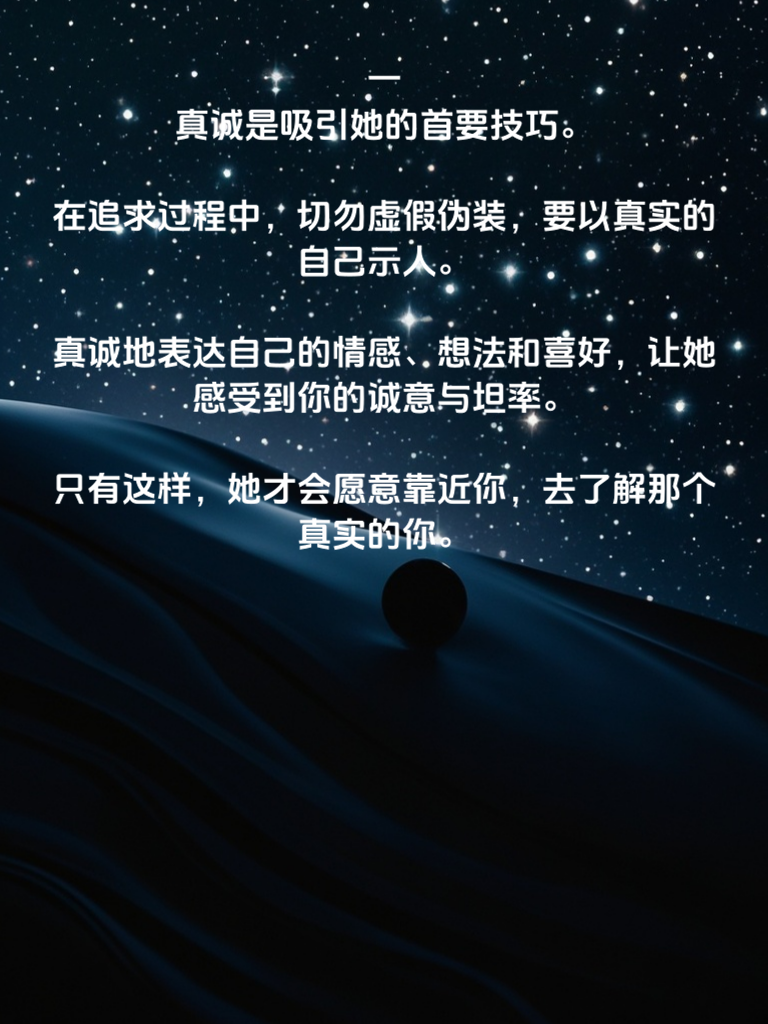 一、真诚是吸引她的首要技巧。在追求过程中,切勿虚假伪装,要以真实的自己示人。真诚地表达自己的情感、想法和喜好,让她感受到你的诚意与坦率。只有这样,她才会愿意靠近你,去了解那个真实的你。 二、学会倾听是关键。当与她相处时,要全神贯注地倾听她的话语,理解她的情绪和需求。不要急于表达自己,而是给她足够的时间和空间去倾诉。通过倾听,你能更好地了解她,也能让她感受到被重视和被理解,从而拉近你们之间的距离。 三、制造惊喜能增添魅力。在平淡的生活中,偶尔给她制造一些小惊喜,比如送一份精心准备的小礼物,或者安排一次浪漫的约会。这些惊喜能让她感受到你的用心和爱意,让她对你产生更多的好感和期待。记住,细节决定成败,用心去经营每一个瞬间,就能吸引她的目光。
