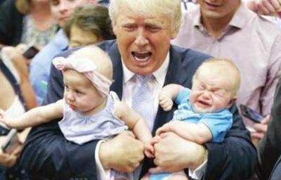 在科罗拉多斯普林斯市的竞选集会上,特朗普抱着一个男宝和一个女宝。或许是被特朗普抱得太紧,女宝一脸不自在,男宝则干脆大哭起来,特朗普送上 “香吻” 试图安抚男宝,却无济于事,引发网友热议。