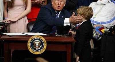 特朗普在艾森豪威尔行政办公大楼签署 “尝试权” 法案时,与 9 岁患有假肥大型肌营养不良症的金发男孩麦克林有互动。特朗普签完名后将笔递给麦克林,还摸了摸他的脸,之后注意到麦克林张开双臂,立即给了他一个拥抱,并亲吻了他的额头,还夸奖了他的头发,开玩笑称:“如果我有这张脸和这样的头发,我可能 10 年前就能当上总统”。