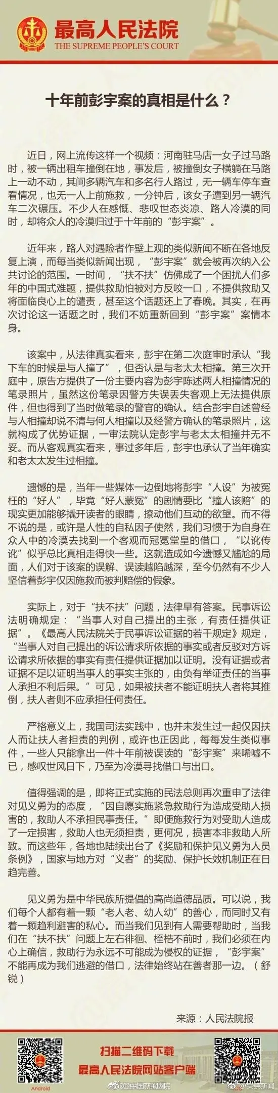 彭宇案真相,彭宇撞人了,有些人有点魔,就是不相信,他们只相信他们自己认为的。彭宇是利用当年论坛,操控舆论,为了不赔钱,然后遇到了很多不良媒体,利用王浩法官几千字的判决书里面的一句话来说事,直接影响到今