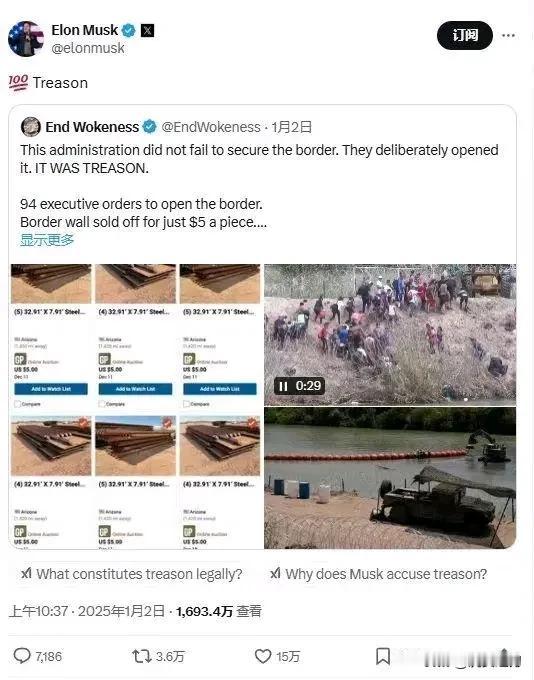 马斯克开始对拜登暗地里搞的“那些事”进行反击!双方斗得你死我活。 1月2日,美国企业家埃隆·马斯克在社交平台X上指控美国总统拜登100%“叛国”,出售美墨边境墙建设材料。 “那些事”包括此前美国军方控告马斯克出卖机密;在特朗普酒店前用特斯拉汽车制造恐怖袭击等等